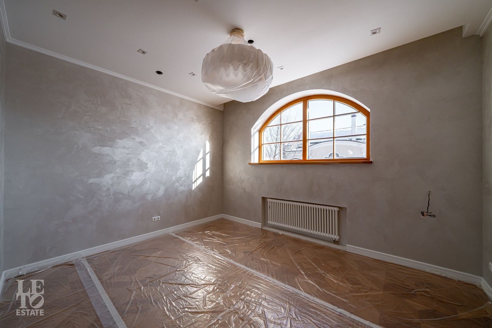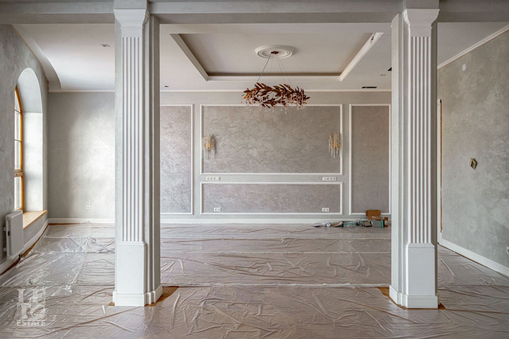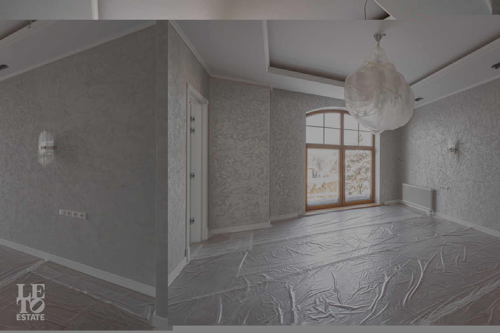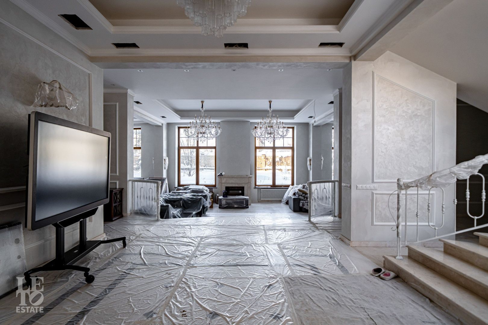 Дом выполнен в классическом стиле, создавая ощущение прочности и элегантности. Элементы барельефов, арочные окна и изысканная колоннада придают фасаду неповторимый стиль. Интерьеры выполнены с акцентом на натуральные материалы: дуб, мрамор и ковка. Центральным элементом является мраморная лестница с коваными ограждениями и дубовыми перилами. Высота потолков составляет 3,5 м, что создаёт ощущение лёгкости и простора. Наборный дубовый паркет на полу подчеркивает атмосферу уюта и тепла. На первом этаже предусмотрен тёплый пол, на втором этаже – в санузлах. Установлена приточно-вытяжная вентиляция.