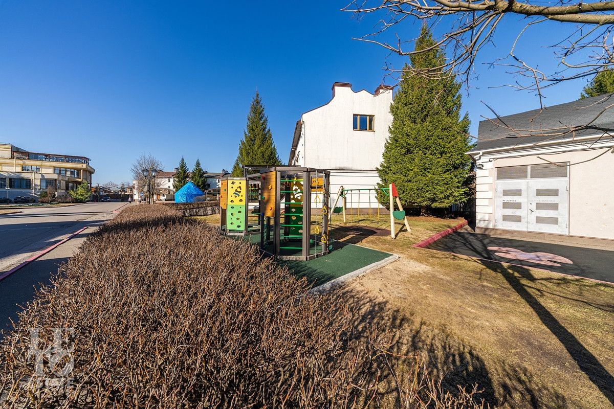 Участок площадью 20 соток окружён соснами и елями, создающими атмосферу уединения и близости к природе. Территория ухожена и прекрасно сочетается с архитектурой дома. Сад, декоративные элементы ландшафта и элементы, такие как пруд, делают участок гармоничным продолжением дома.