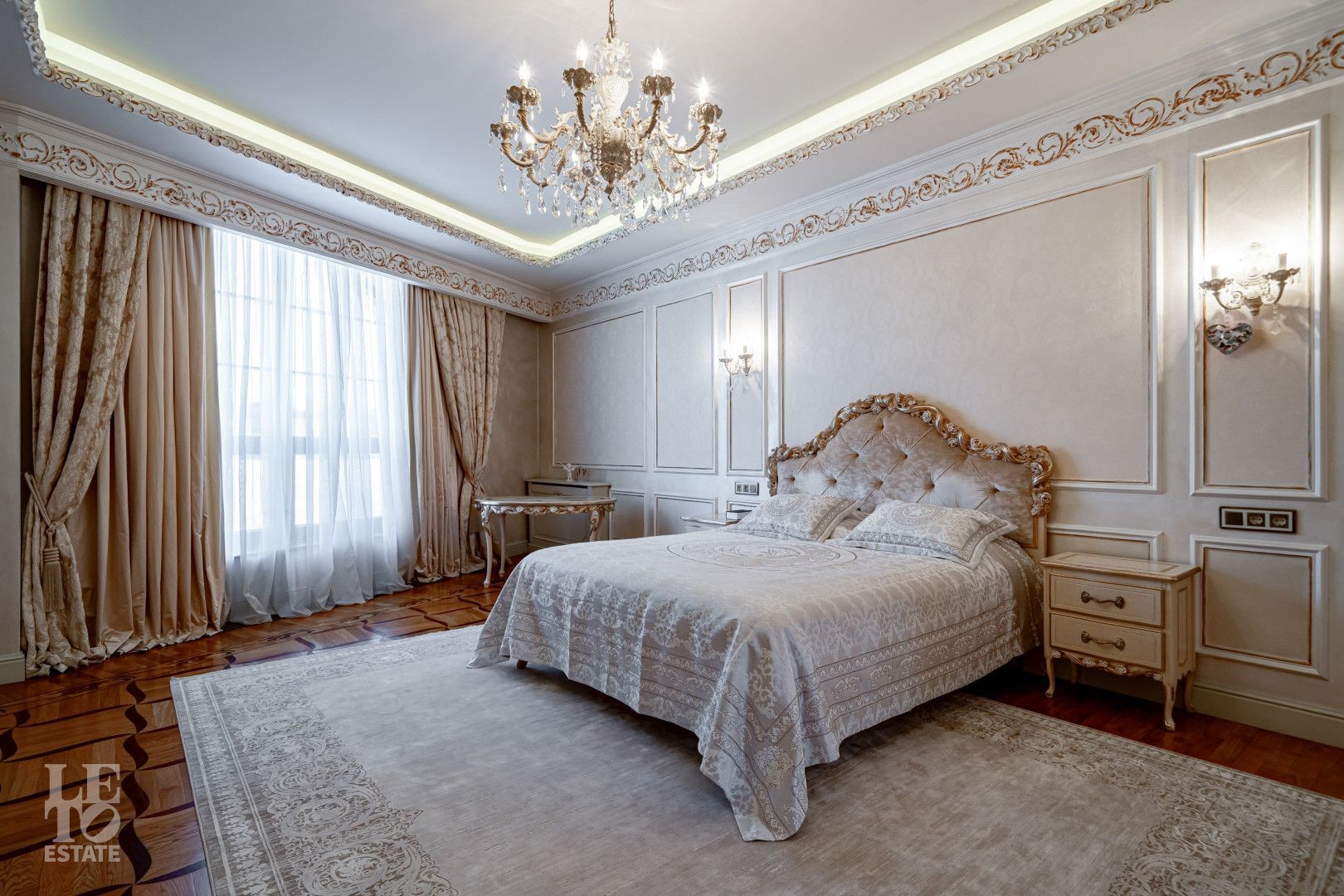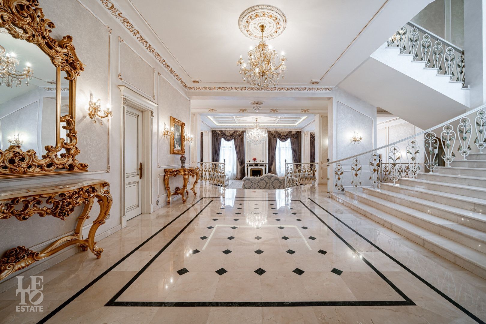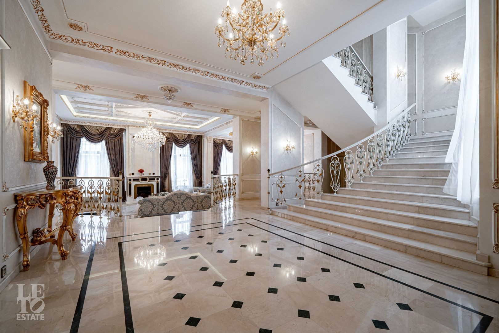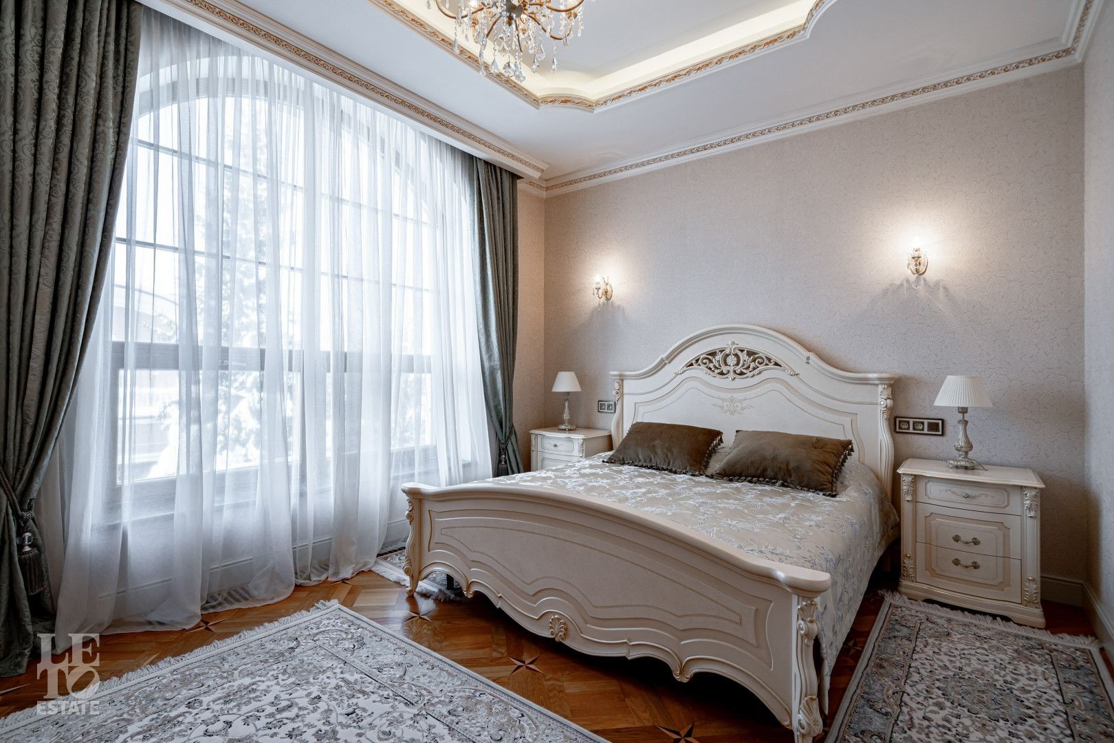 системой подогрева пола, создающие комфортную температуру в любое время года. Интерьеры дополнены лестницей с коваными перилами, декоративной лепниной и потолками с ручной