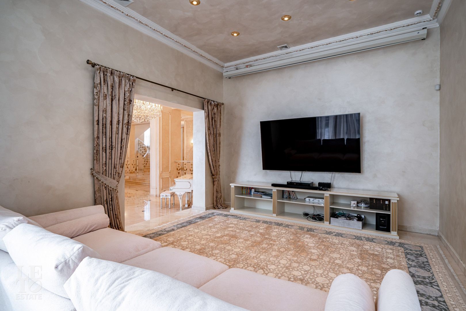 Дом площадью 1000 кв. м с 6 спальнями расположен на приватном участке 22 сотки. Архитектура и интерьеры формируют ощущение масштабной, представительской резиденции с чётким ритмом пространства и классической эстетикой.