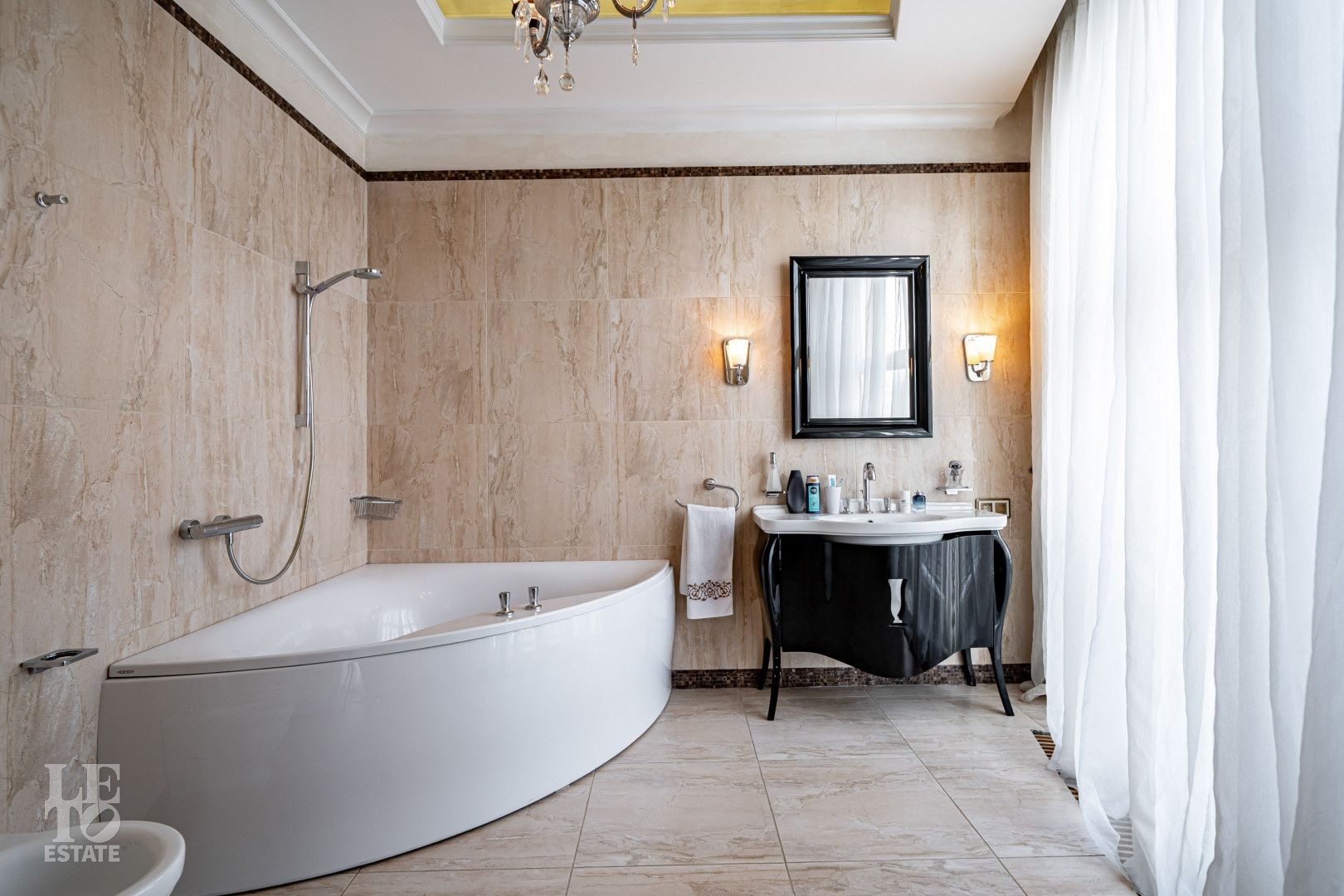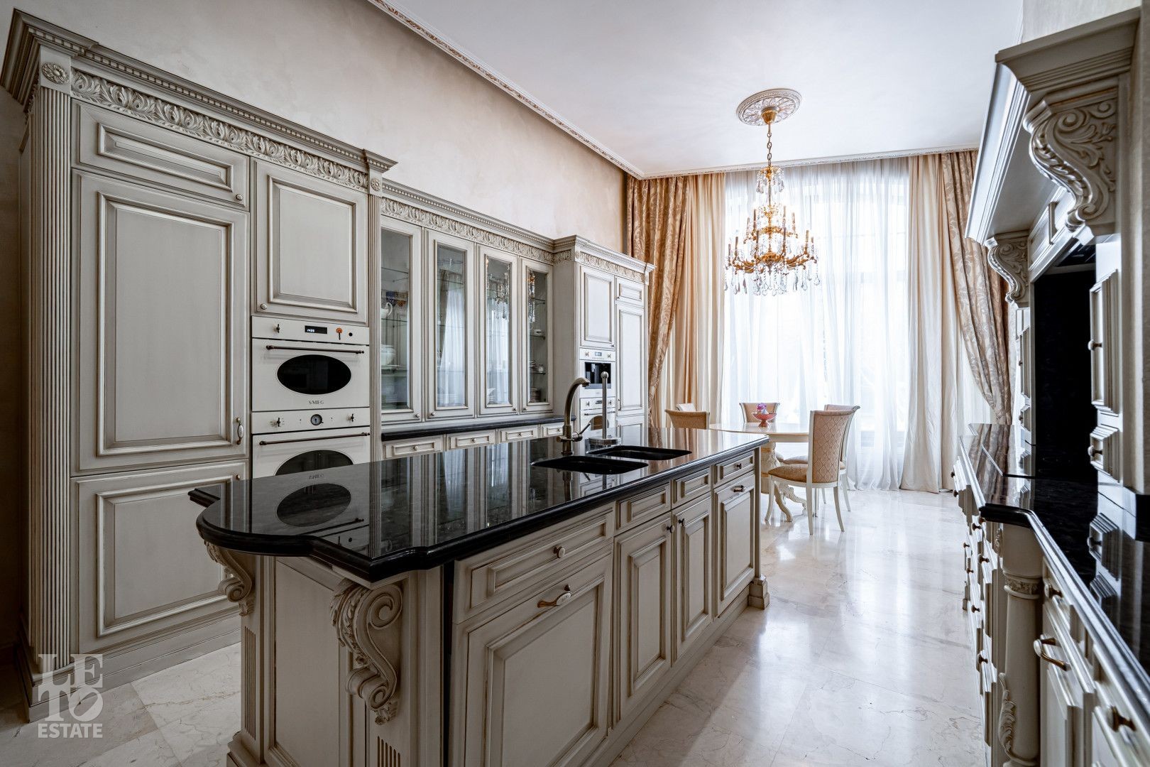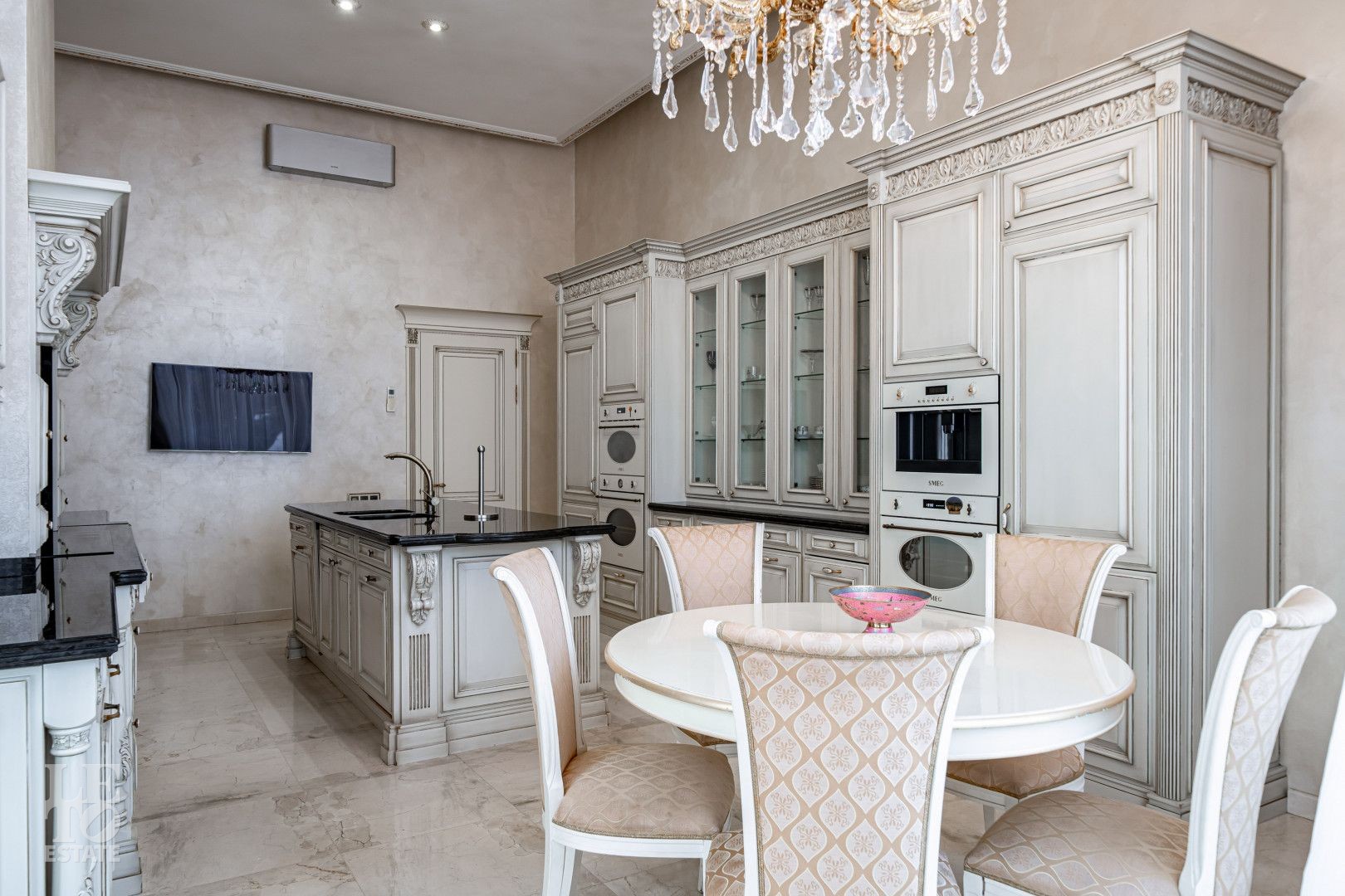 росписью, что подчёркивает индивидуальный характер дома. Камин в гостиной формирует композиционный центр общественной зоны. Кухонное пространство оснащено техникой SMEG, в постирочной установлена стиральная машина Miele. В санузлах использована сантехника Devon&Devon, Villeroy&Boch и Hoesch.