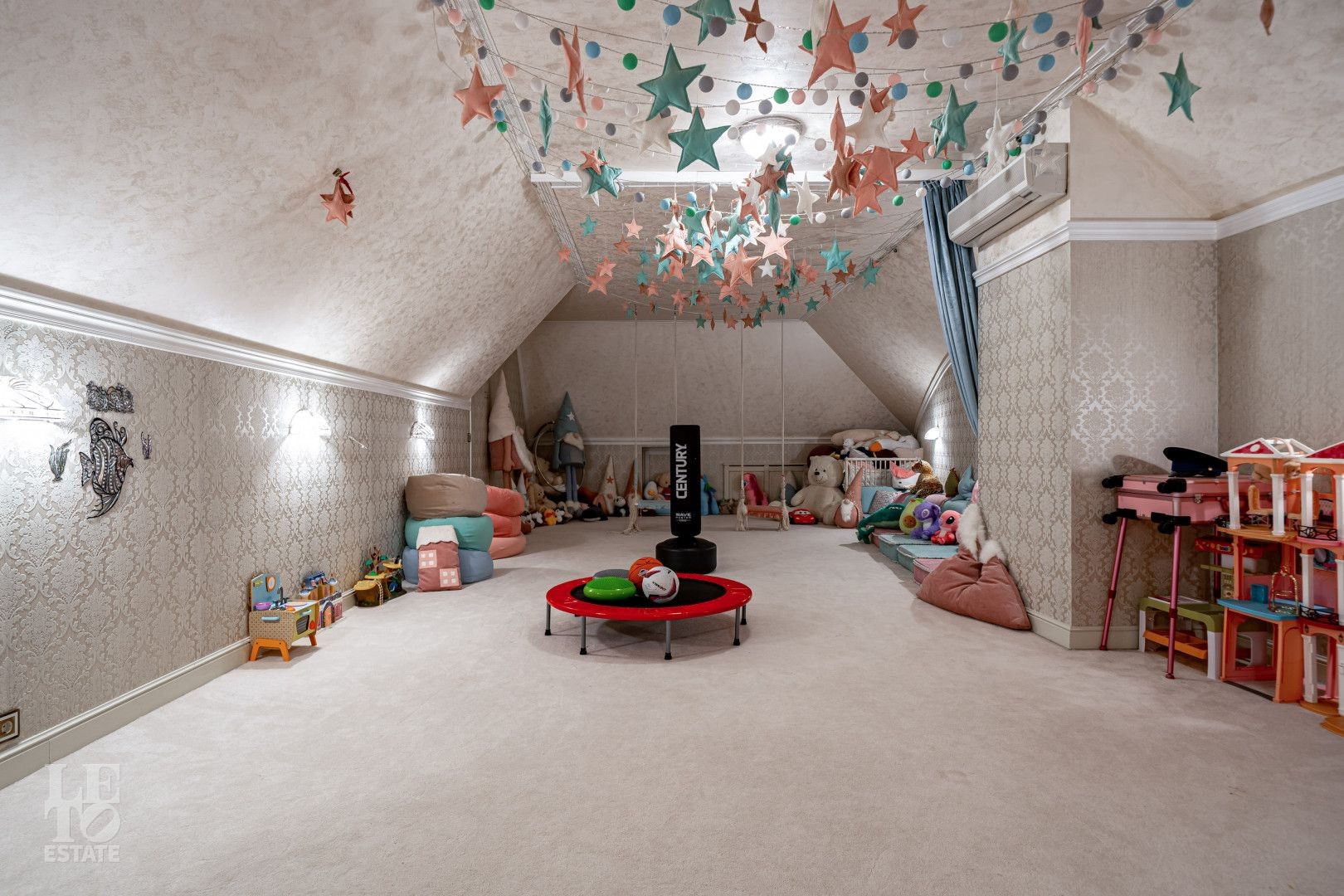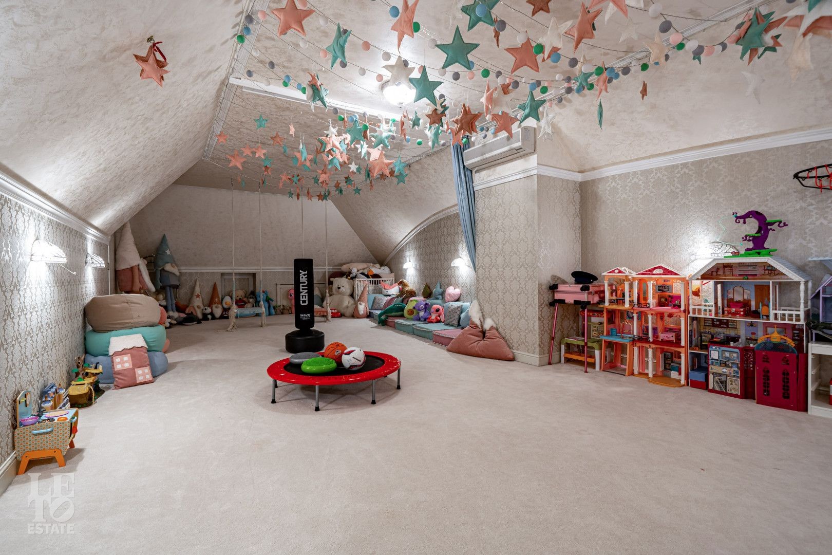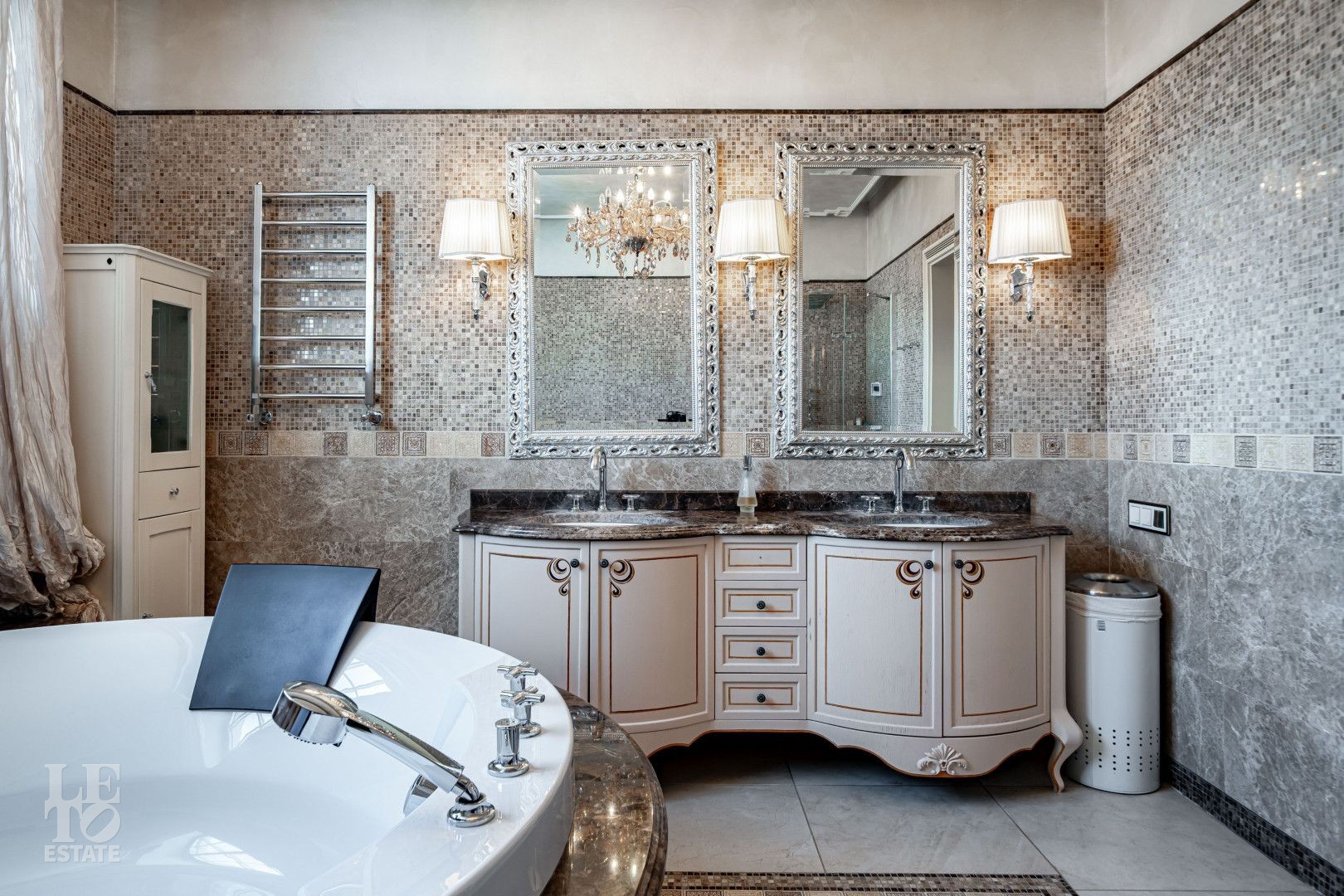 росписью, что подчёркивает индивидуальный характер дома. Камин в гостиной формирует композиционный центр общественной зоны. Кухонное пространство оснащено техникой SMEG, в постирочной установлена стиральная машина Miele. В санузлах использована сантехника Devon&Devon, Villeroy&Boch и Hoesch.