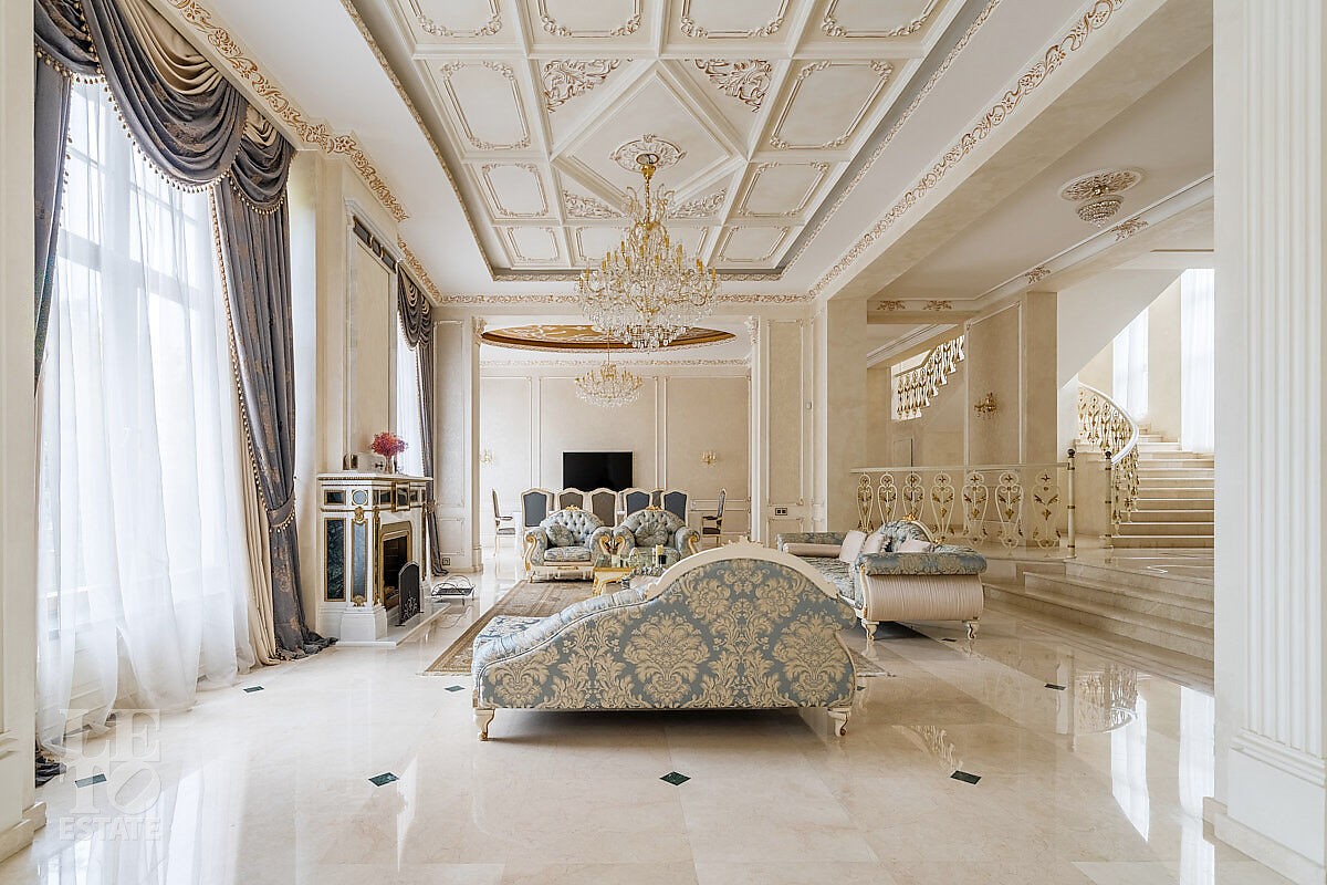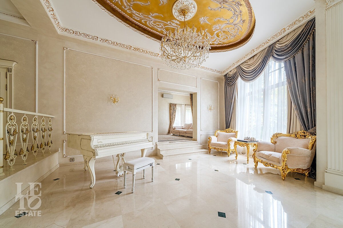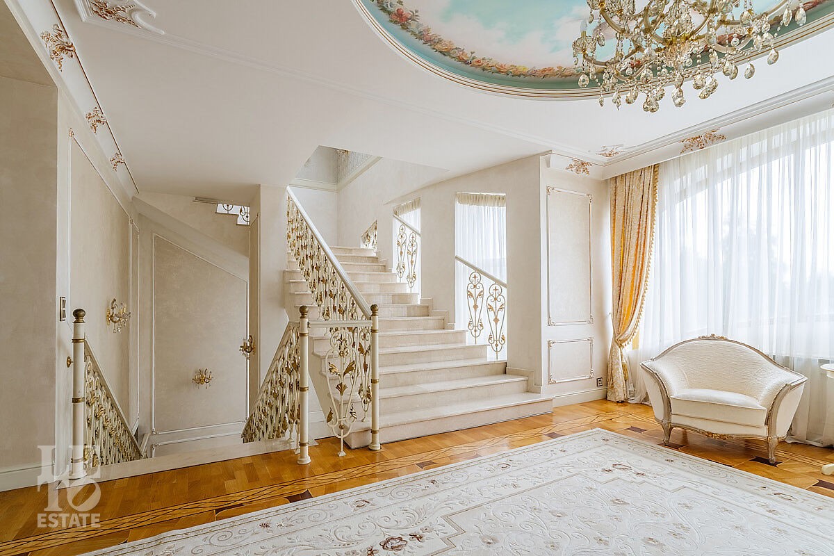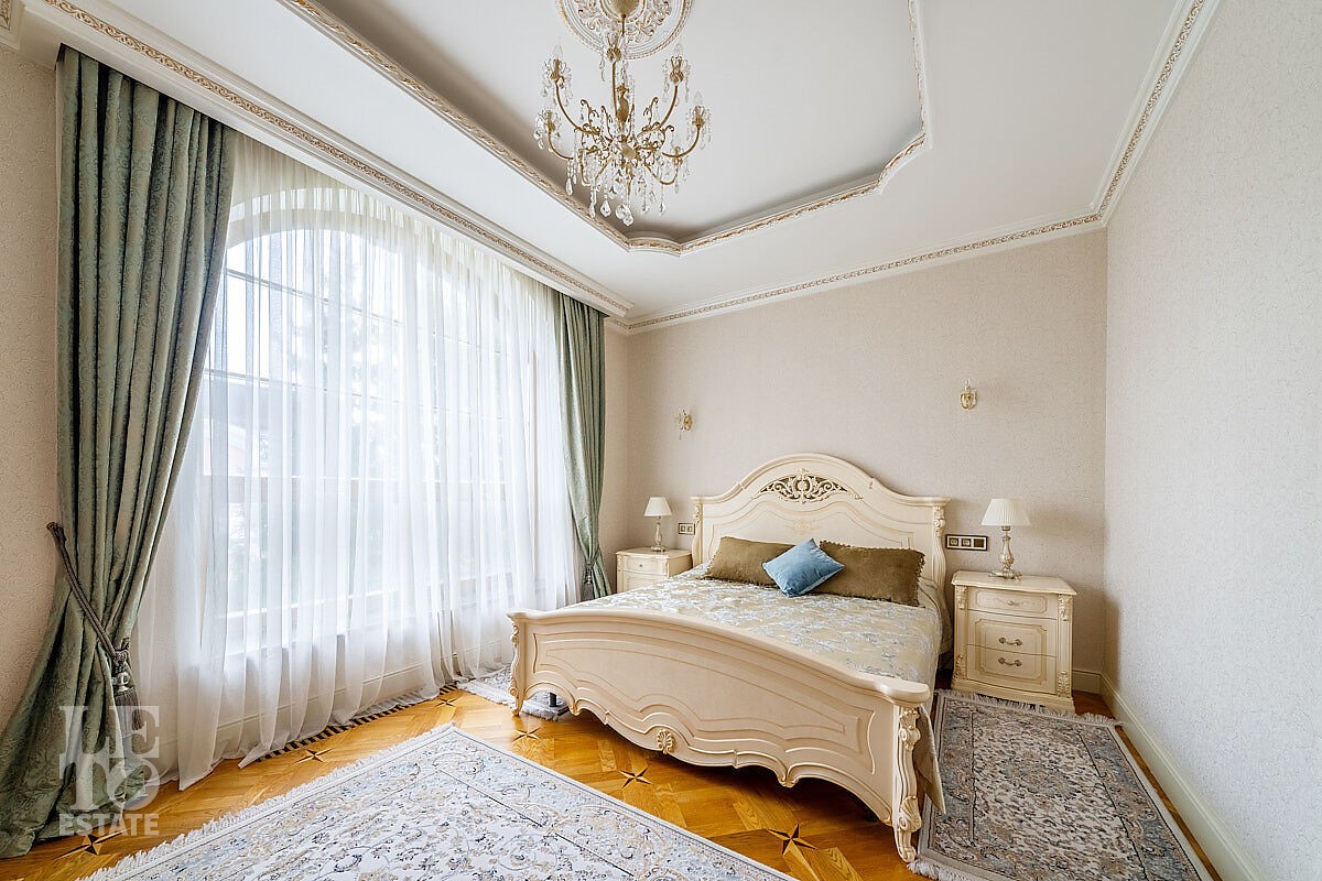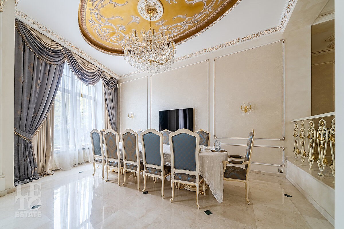 Дом построен в классическом стиле. Фасад дома украшен барельефами, входная группа выделена колоннами и красивым крыльцом с лестницей. Выполнена фасадная шпатлевка. В доме установлена система водоочистки и водоподготовки, предусмотрена приточно-вытяжная вентиляция. Отделка выполнена с использованием элементов из дерева, мрамора и ковки. Украшением дома служит прекрасная мраморная лестница с коваными ограждениями и перилами из массива дуба. Высота потолков в комнатах 3,5 м. На полу – наборный паркет из дуба. На всем первом этаже сделан теплый пол, на втором этаже – только в санузлах. Отделка дома закончена в 2018 году. Дом продается с мебелью.