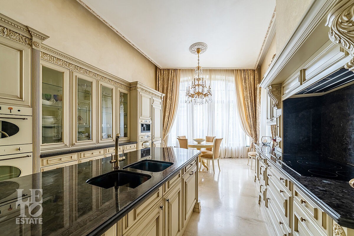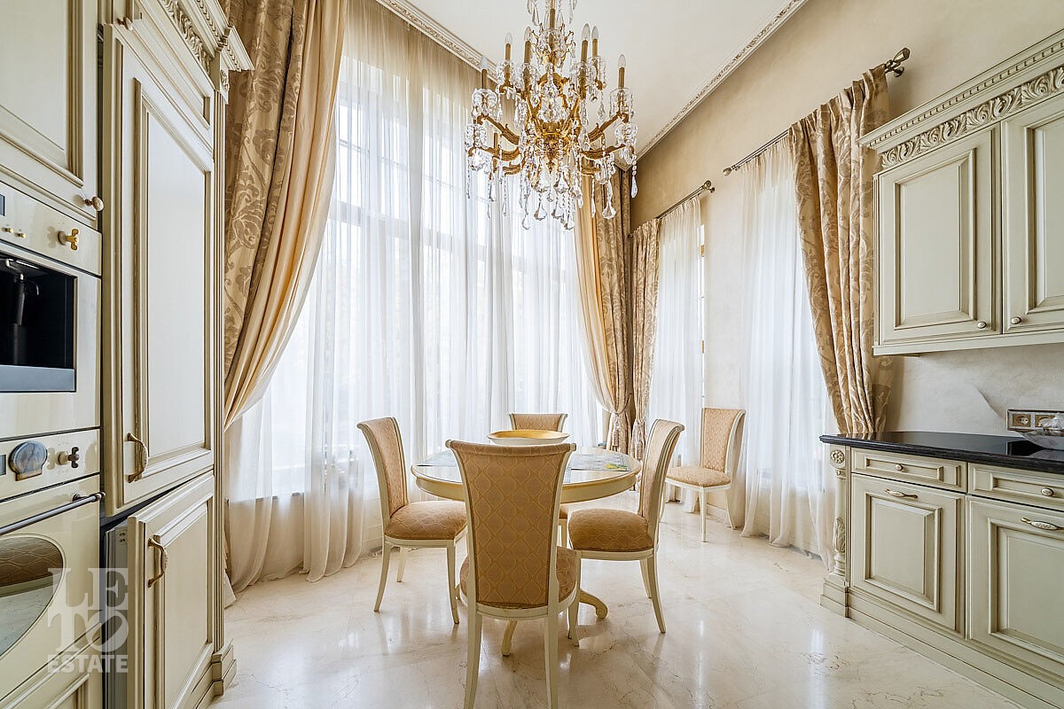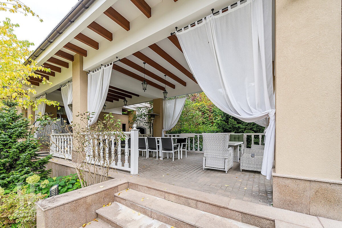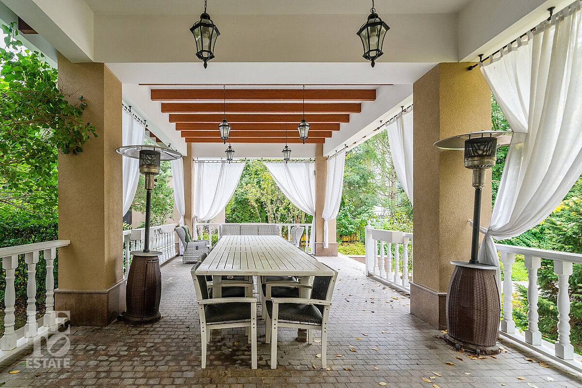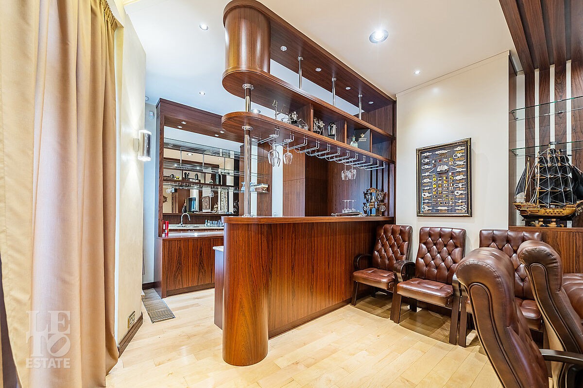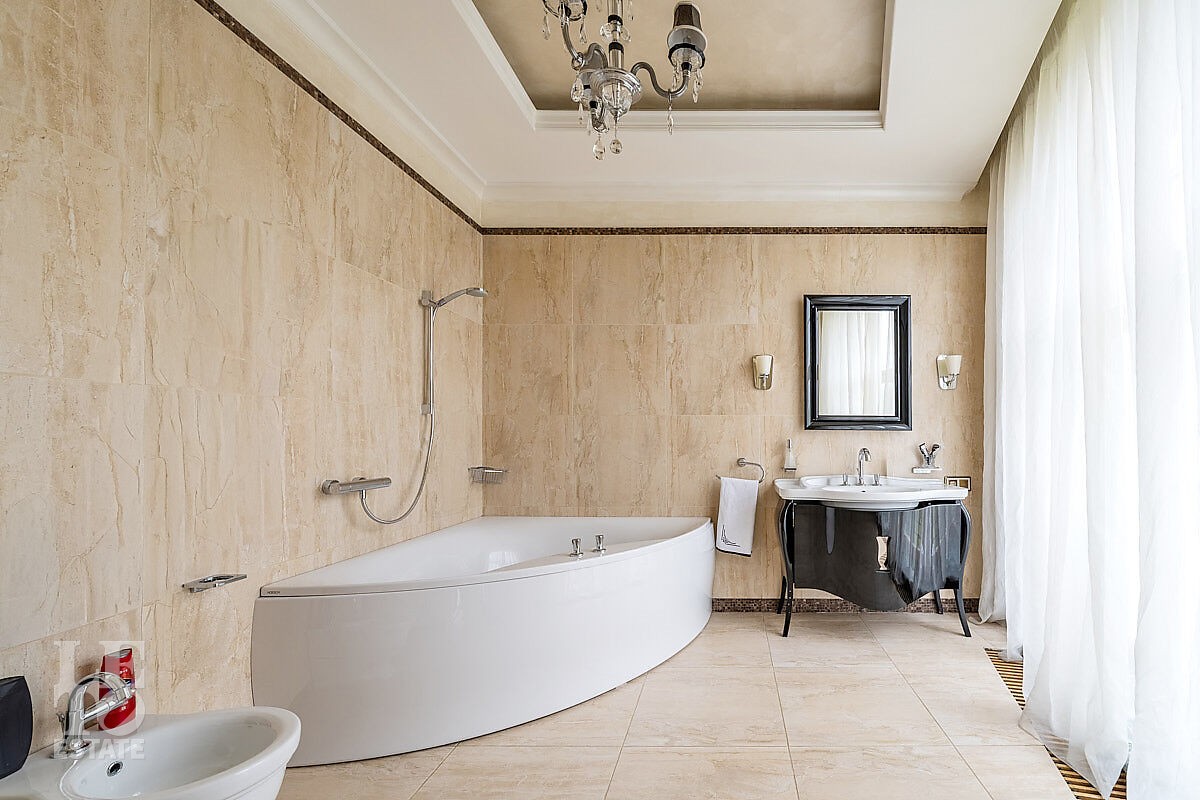 Дом построен в классическом стиле. Фасад дома украшен барельефами, входная группа выделена колоннами и красивым крыльцом с лестницей. Выполнена фасадная шпатлевка. В доме установлена система водоочистки и водоподготовки, предусмотрена приточно-вытяжная вентиляция. Отделка выполнена с использованием элементов из дерева, мрамора и ковки. Украшением дома служит прекрасная мраморная лестница с коваными ограждениями и перилами из массива дуба. Высота потолков в комнатах 3,5 м. На полу – наборный паркет из дуба. На всем первом этаже сделан теплый пол, на втором этаже – только в санузлах. Отделка дома закончена в 2018 году. Дом продается с мебелью.