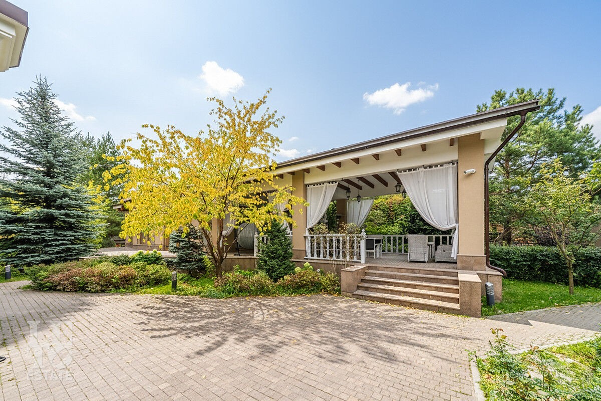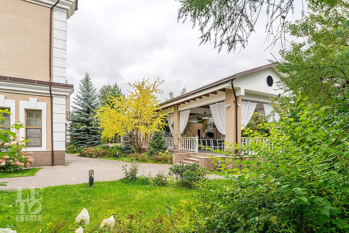 На участке площадью 22 сотки правильной формы проведены ландшафтные работы, по его периметру растут ели и сосны. На заднем дворе построена капитальная беседка с барной зоной и большим обеденным столом на 12 персон, в уличной части есть кирпичная печь и мангал. В поселке есть все центральные коммуникации: электроснабжение, водоснабжение, газ, канализация в т. ч. и ливневая.