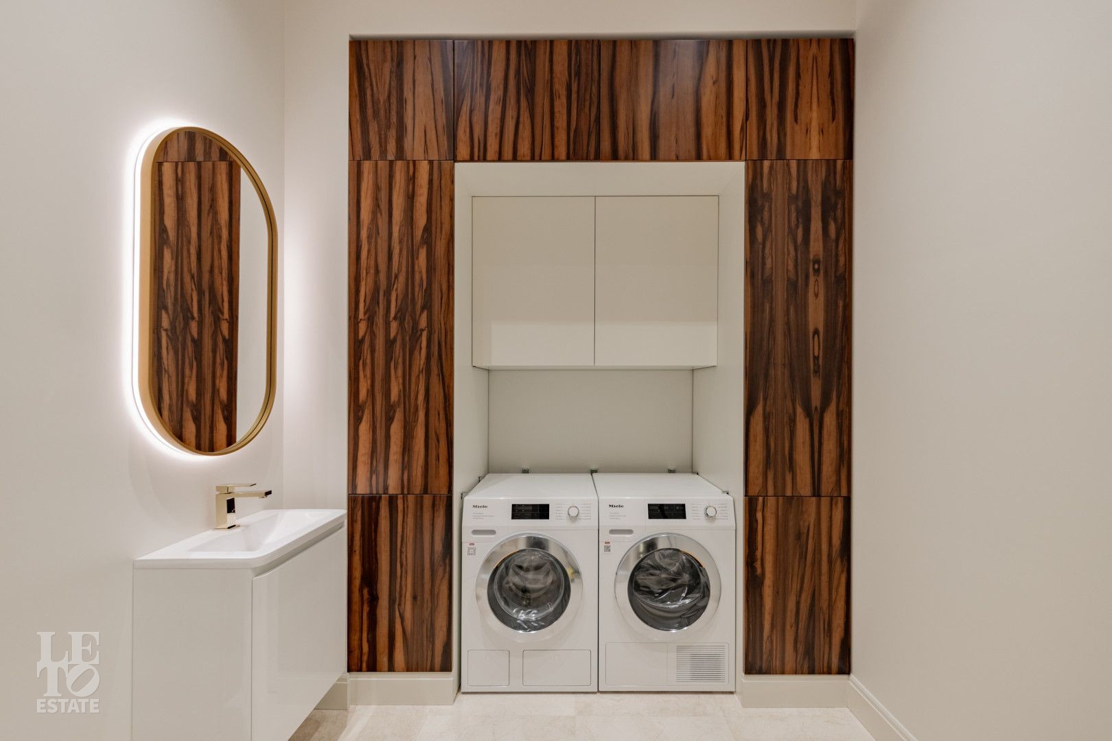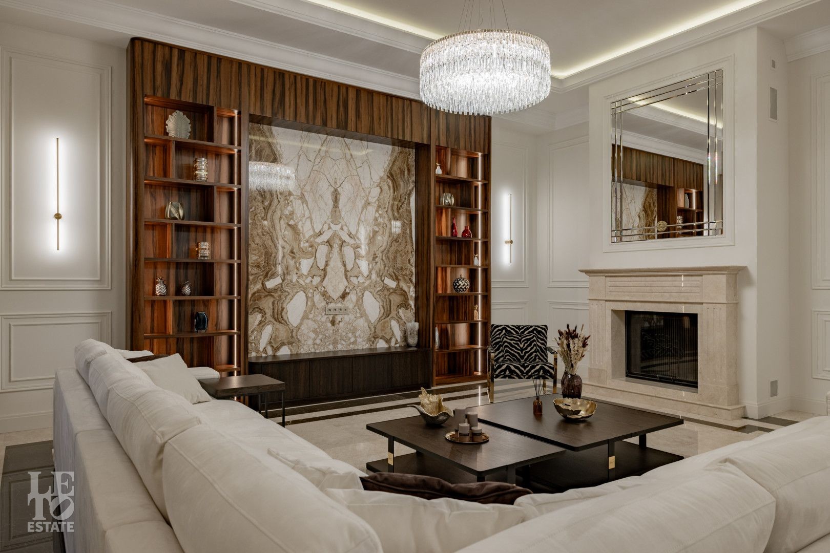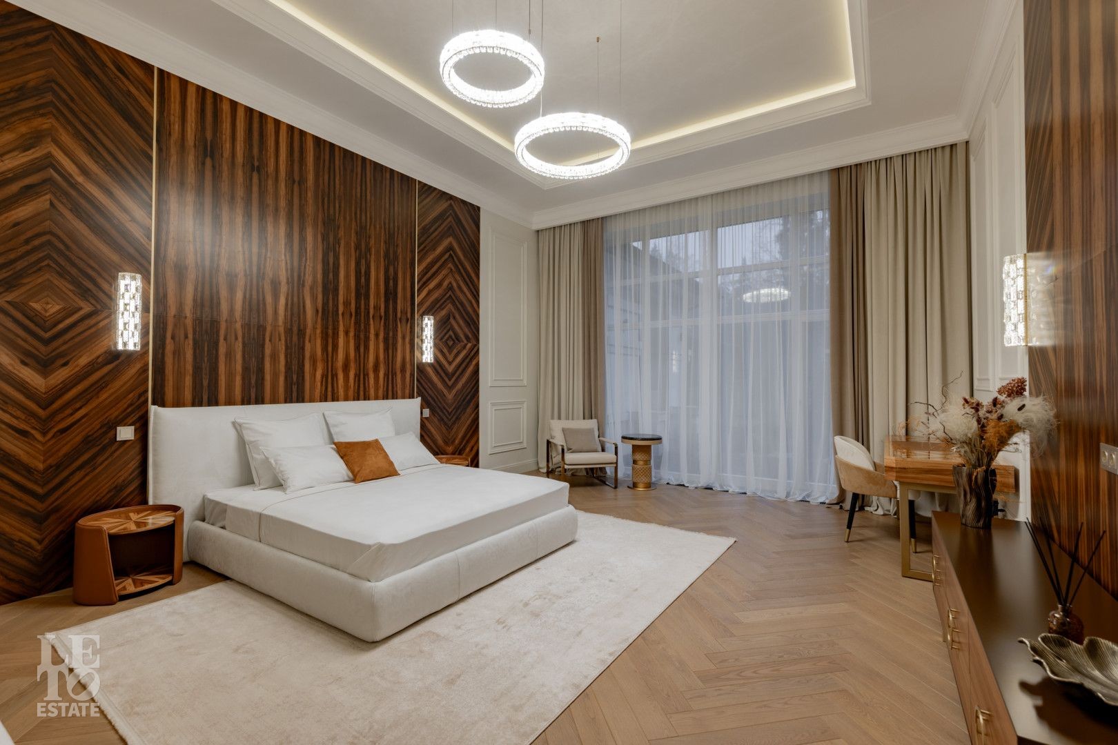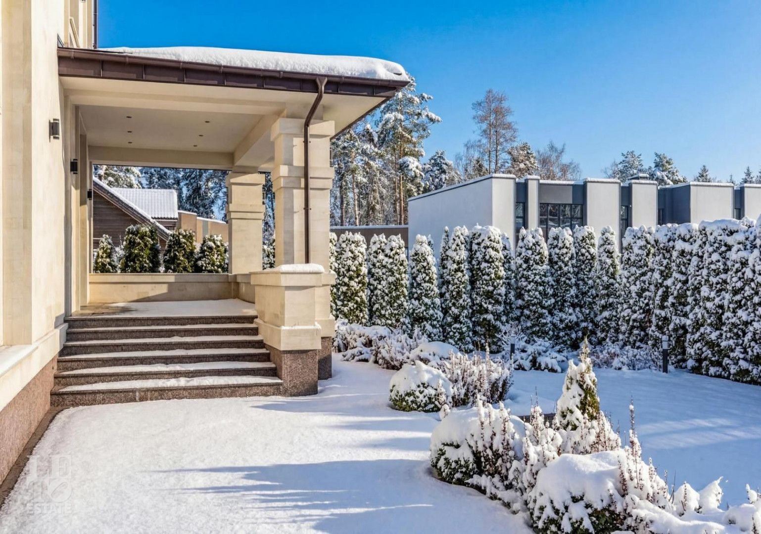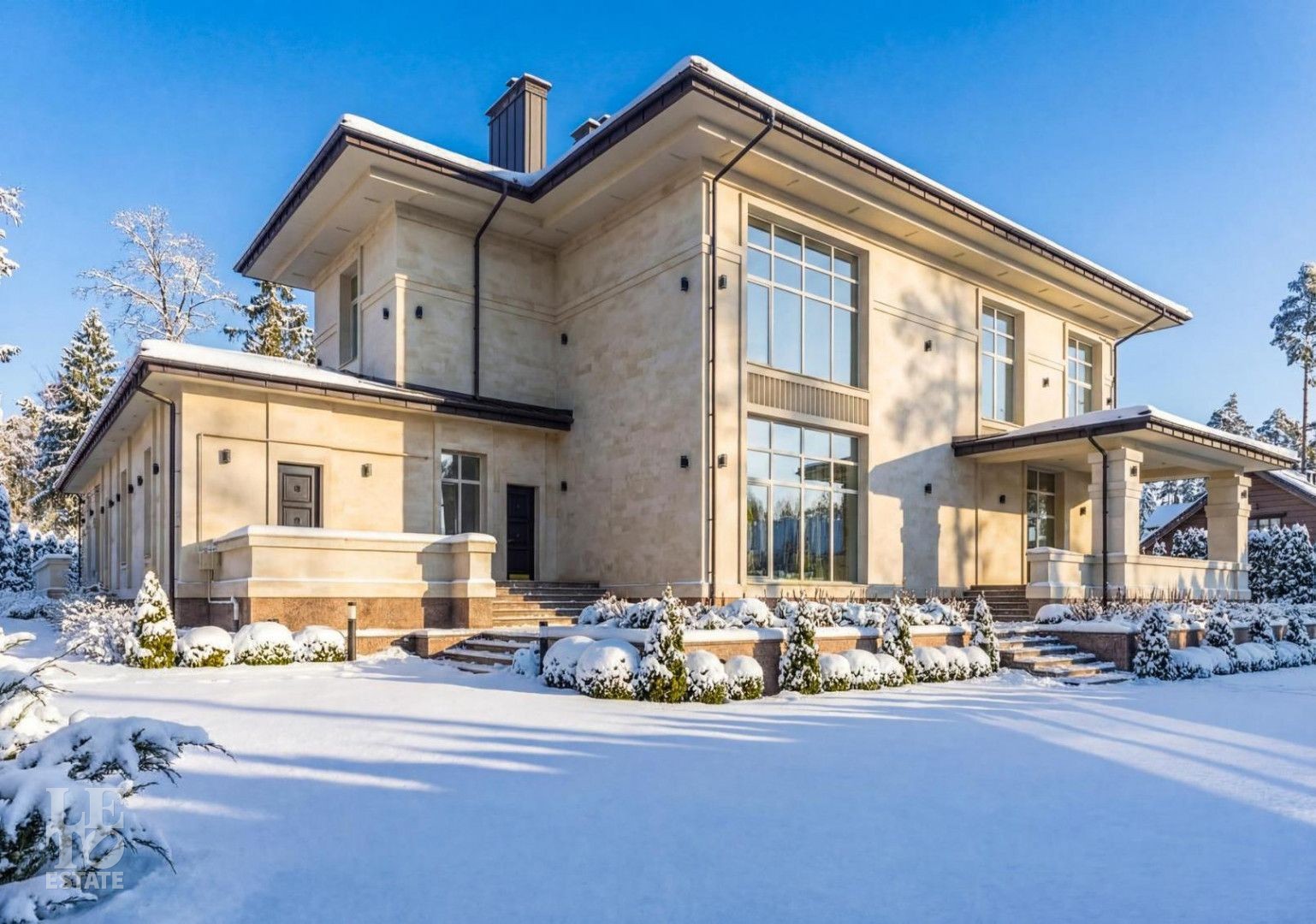 Дом представляет собой великолепный пример современной архитектуры с кирпичными стенами и монолитными перекрытиями. Фасады выполнены из натурального камня, а деревянные панорамные окна из лиственницы добавляют интерьеру естественного света и уюта.