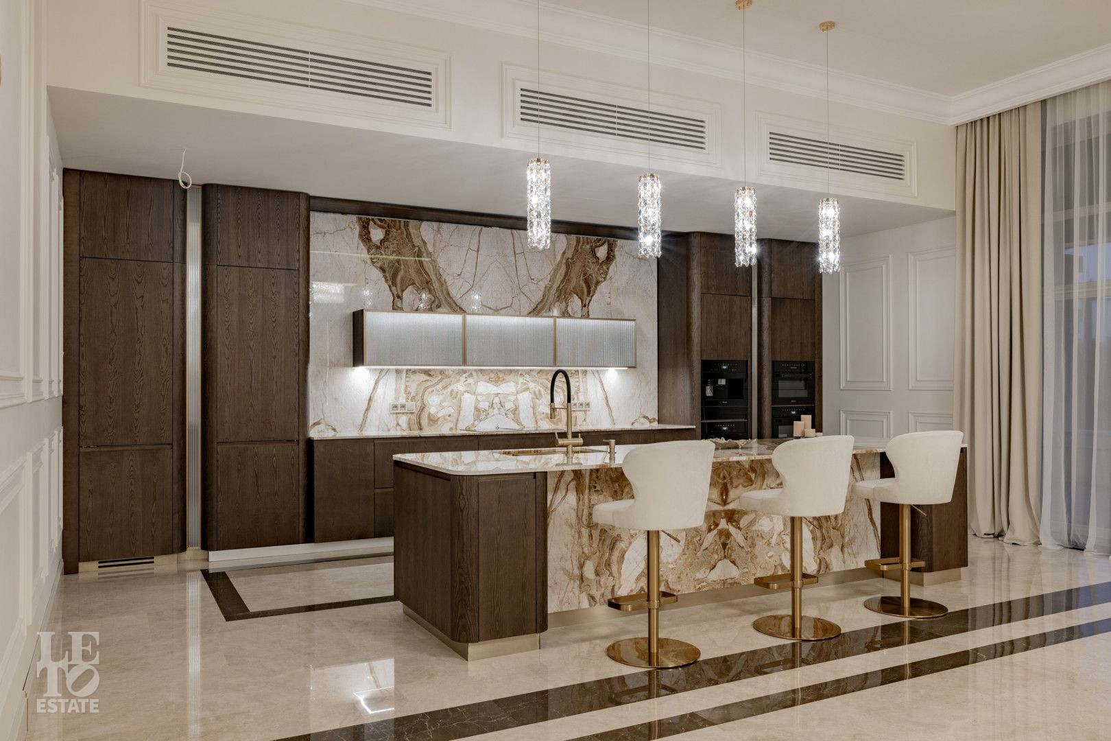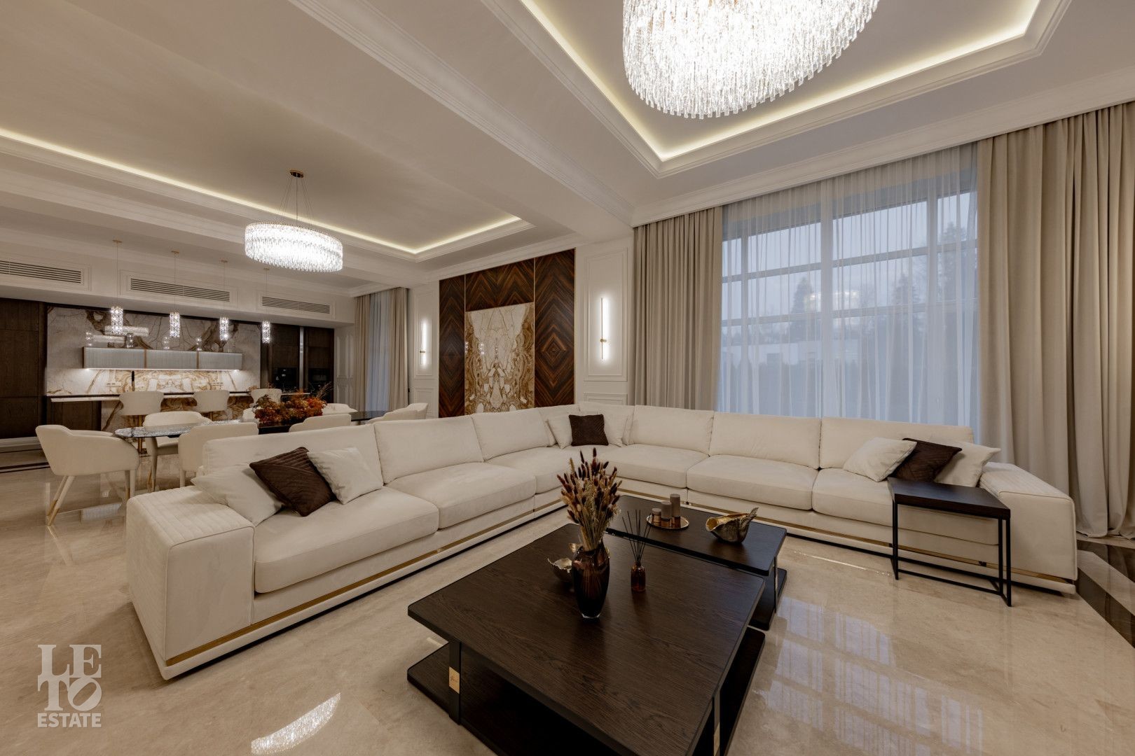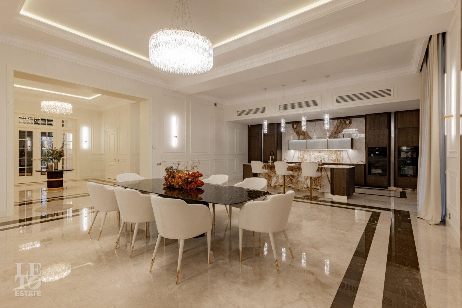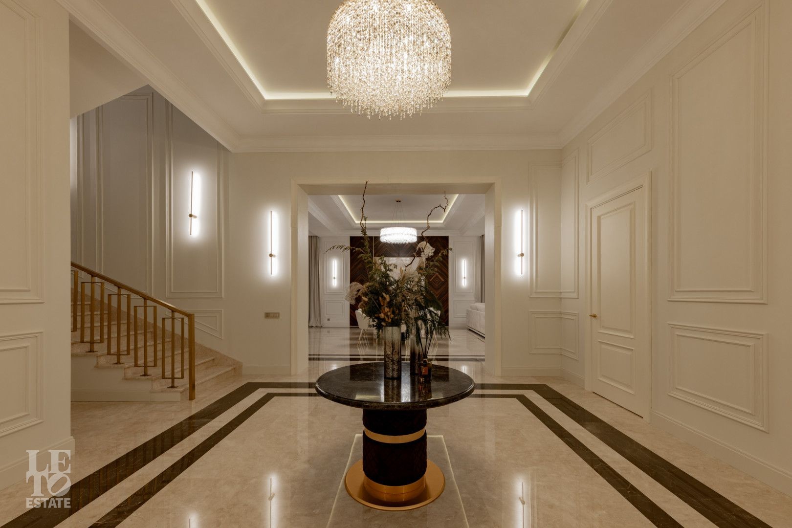 В отделке использованы высококачественные материалы, в частности итальянский керамогранит, натуральный мрамор, а также представлена премиальная сантехника из Италии и Германии. Функционально удобная планировка, просторные помещения и панорамное остекление расширяют пространство и предусматривают комфортное проживание для большой семьи. Современные инженерные системы включают центральное кондиционирование, автоматическую регулировку теплых полов и конвекторное отопление, создавая комфортные условия в любое время года.