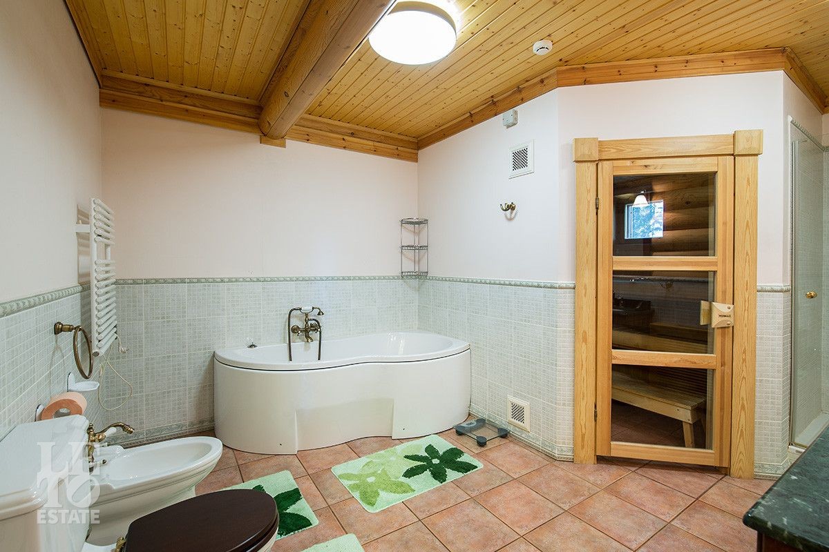Первый этаж – холл, просторный светлый зал со вторым светом, кухня со столовой и выходом на террасу, сауна с раздевалкой, санузел, кабинет.