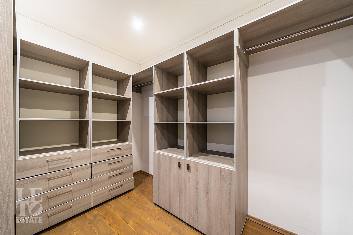 На втором этаже расположились три изолированные спальни с высокими потолками: в двух из низ предусмотрены гардеробные и антресоли.