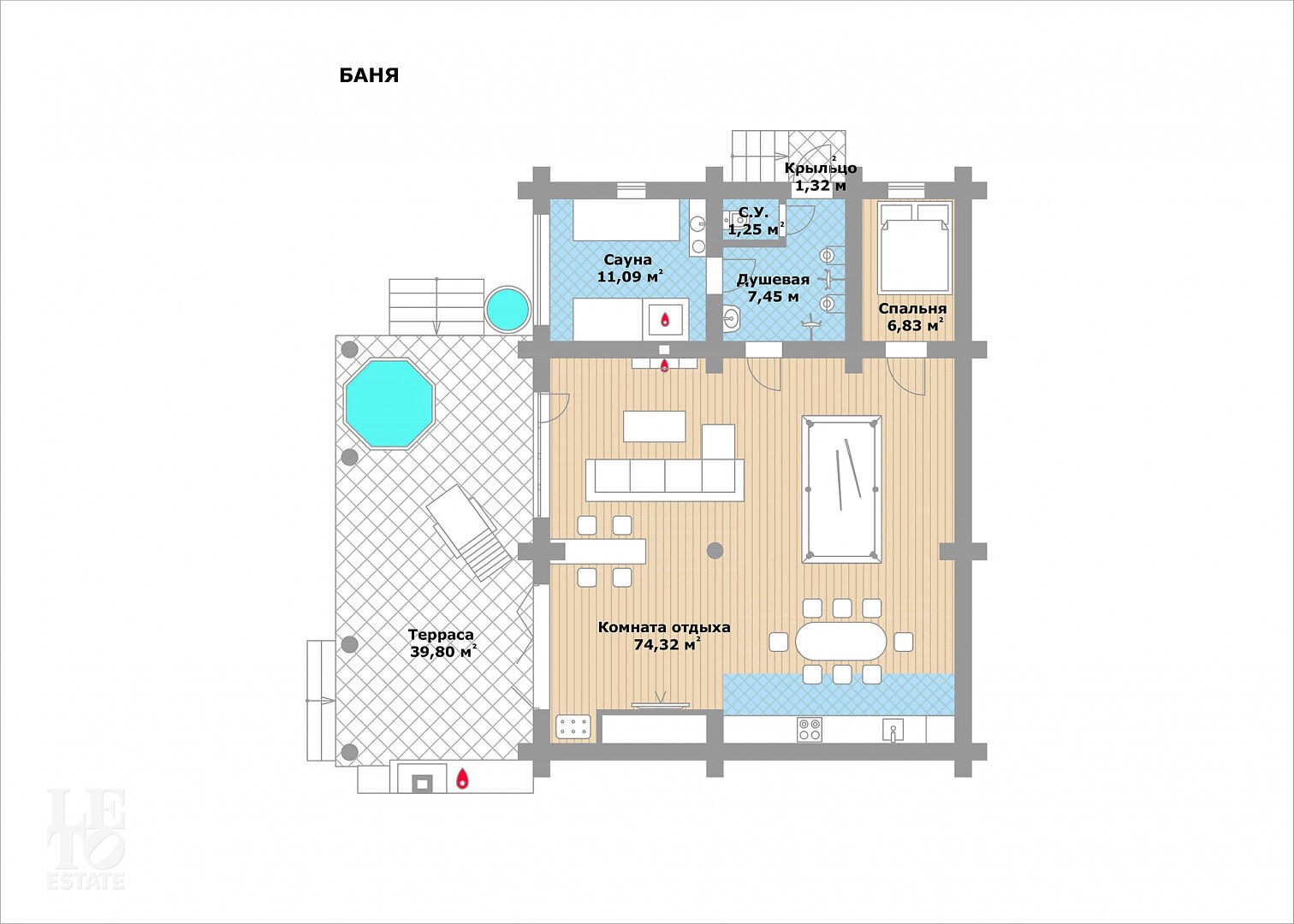 Комната отдыха, спальня, сауна, душевая, с/у, терраса, крыльцо.