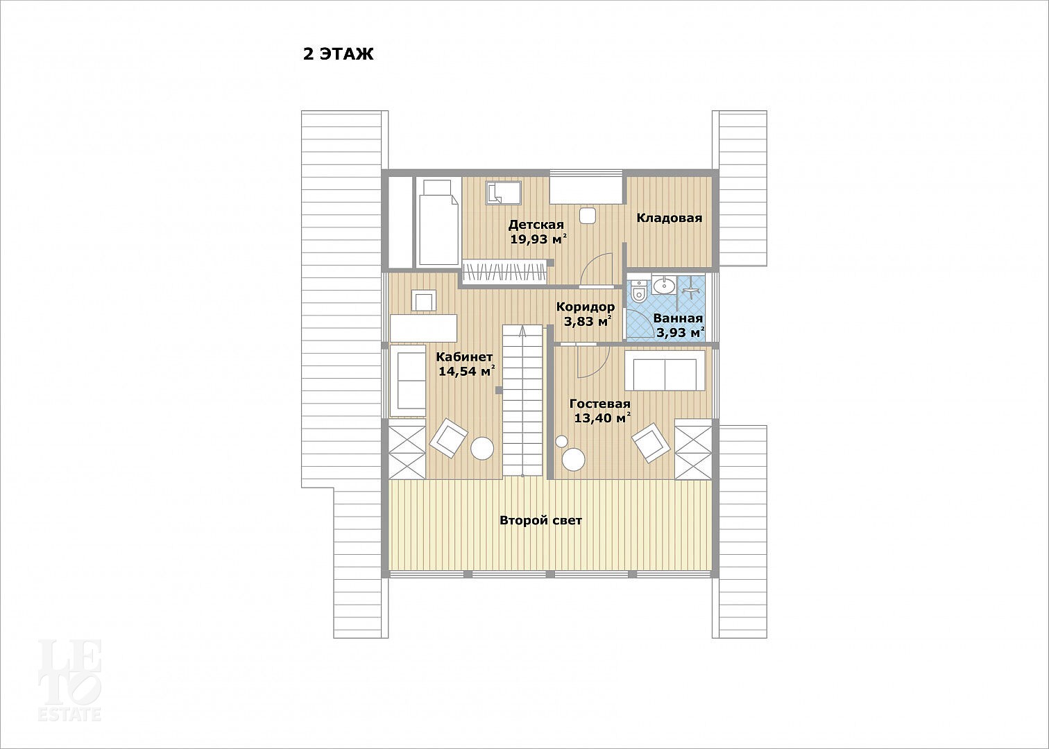 Второй этаж: детская спальня, кладовая, гостевая спальня, с/у, кабинет, коридор.
