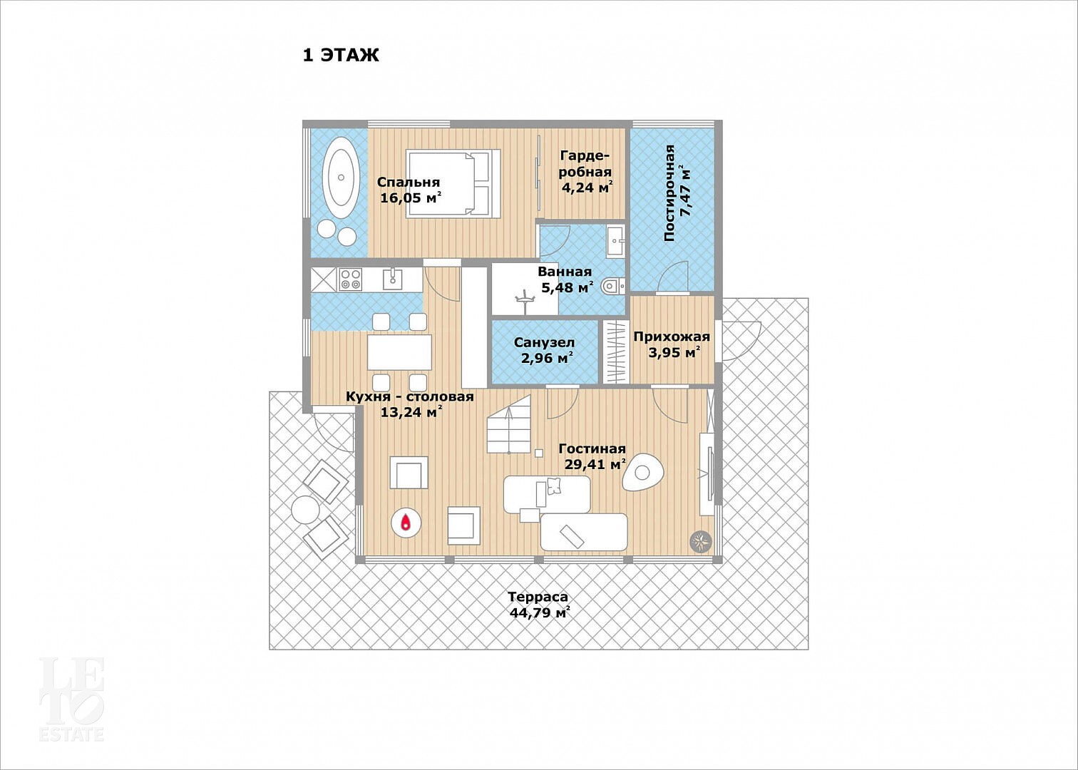 Первый этаж: прихожая, кухня-столовая, гостиная, гостевой с/у, спальня с гардеробной и ванной комнатой, постирочная, терраса.