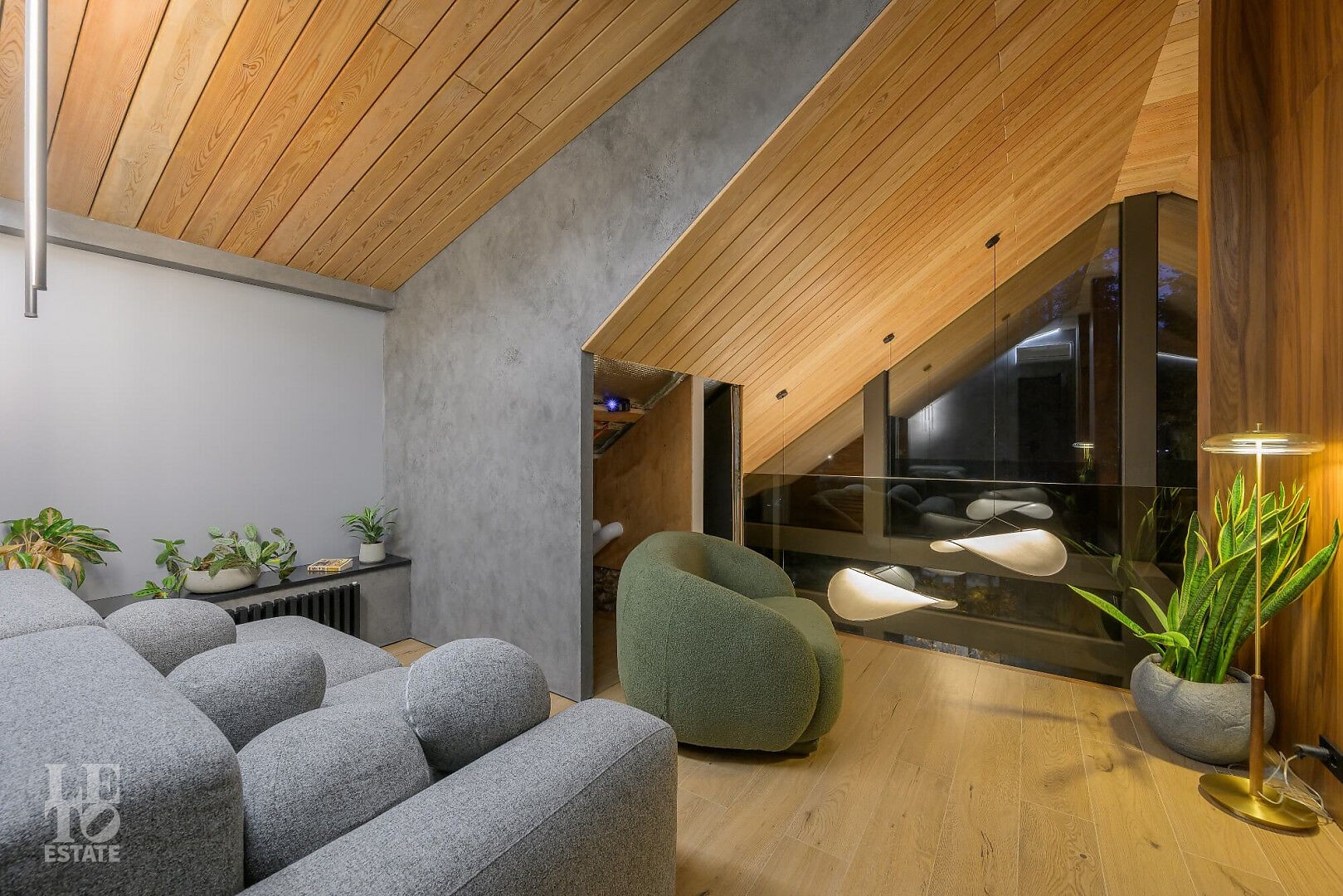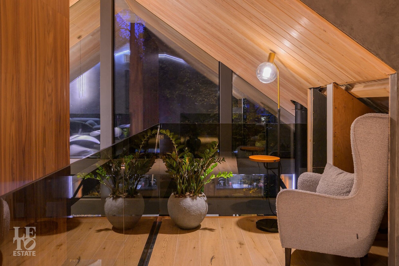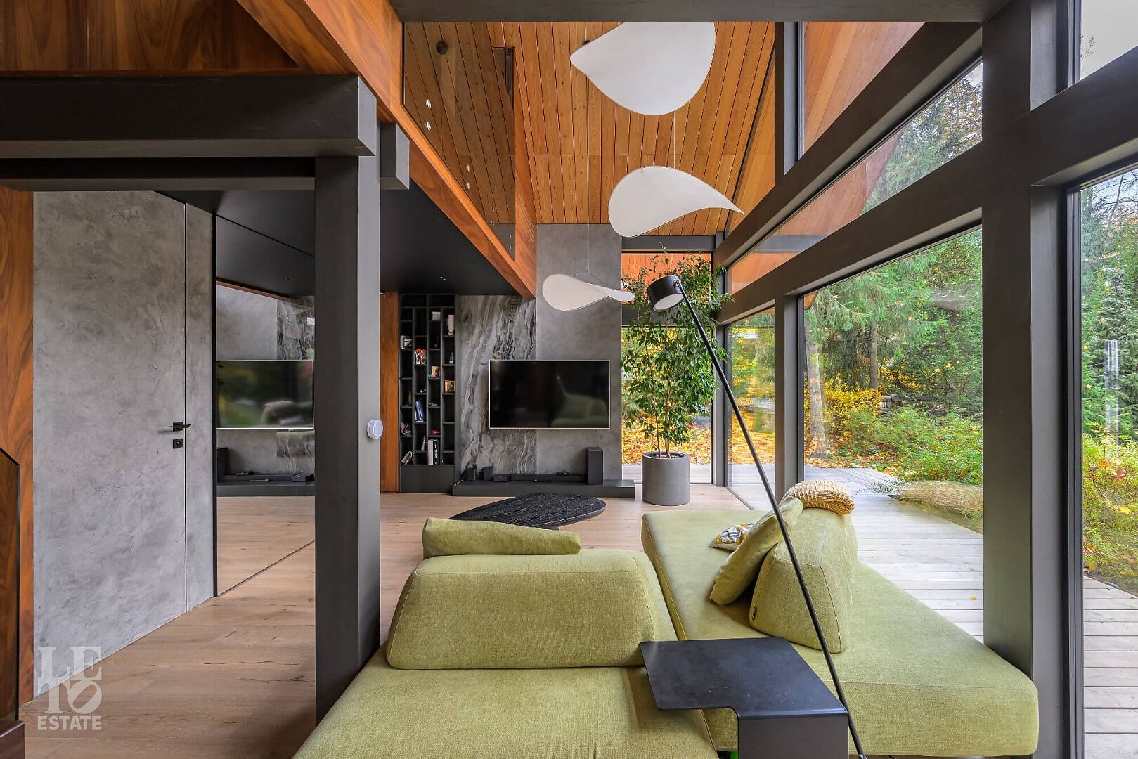 Каменный шпон фасада и лиственничная кровля придают дому оригинальный стиль. Внутри — светлые, просторные пространства в стиле скандинавского минимализма: много стекла, деревянный шпон и декоративный бетон. Потолки, выполненные из лиственницы, словно продолжают природную эстетику дома.