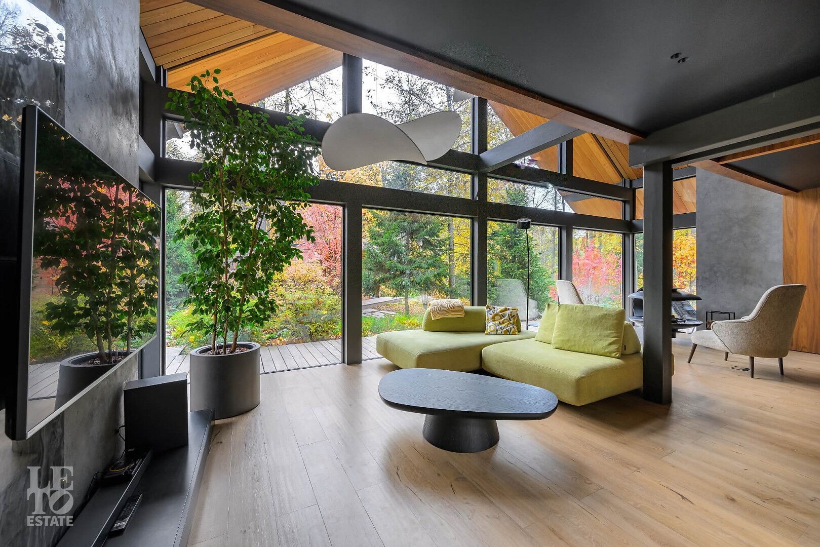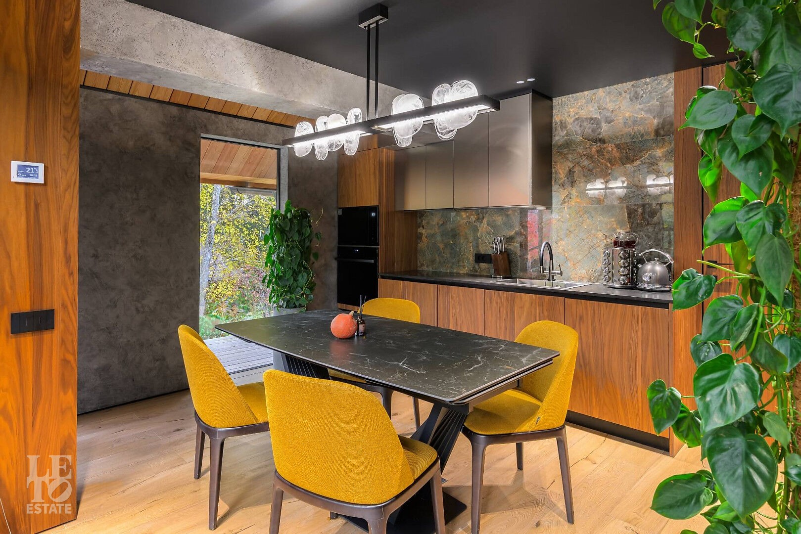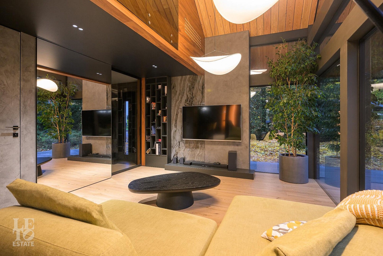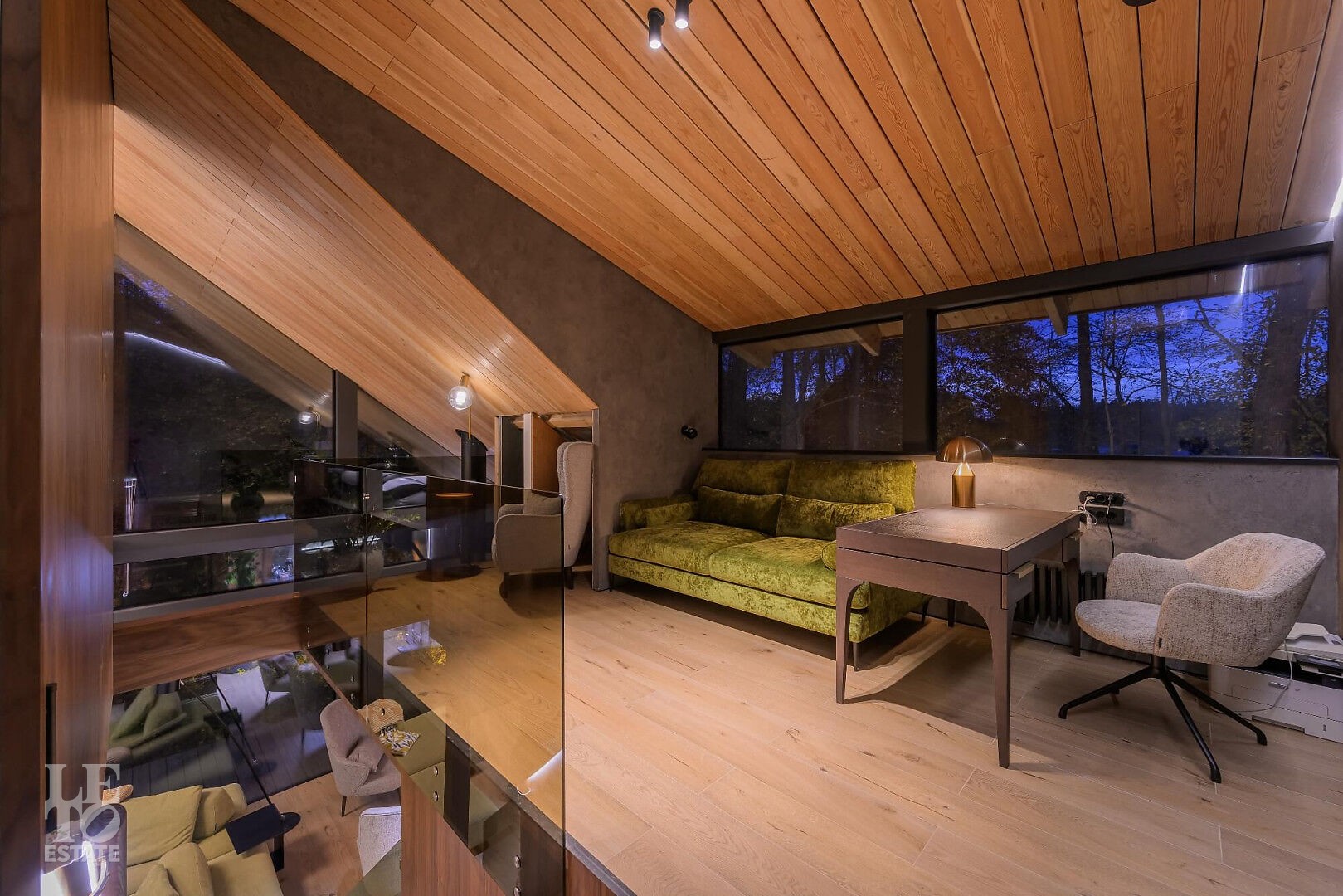 Каменный шпон фасада и лиственничная кровля придают дому оригинальный стиль. Внутри — светлые, просторные пространства в стиле скандинавского минимализма: много стекла, деревянный шпон и декоративный бетон. Потолки, выполненные из лиственницы, словно продолжают природную эстетику дома.