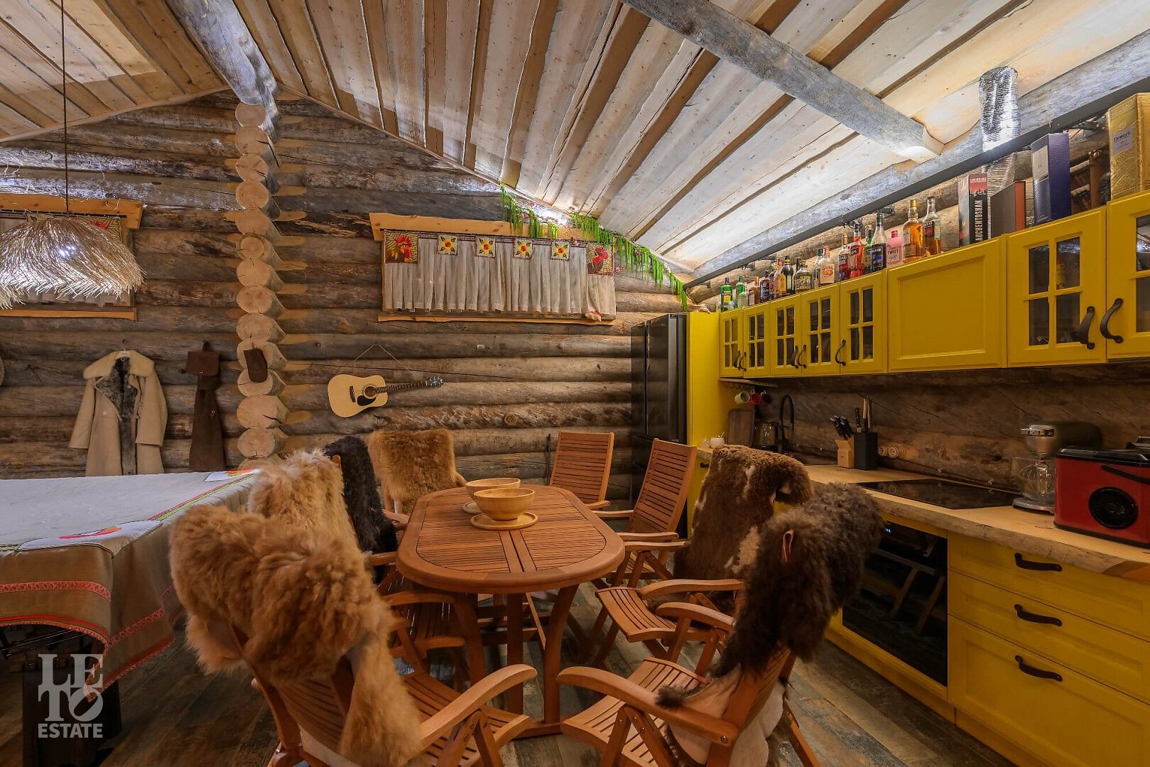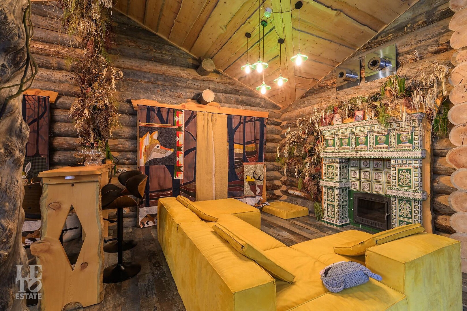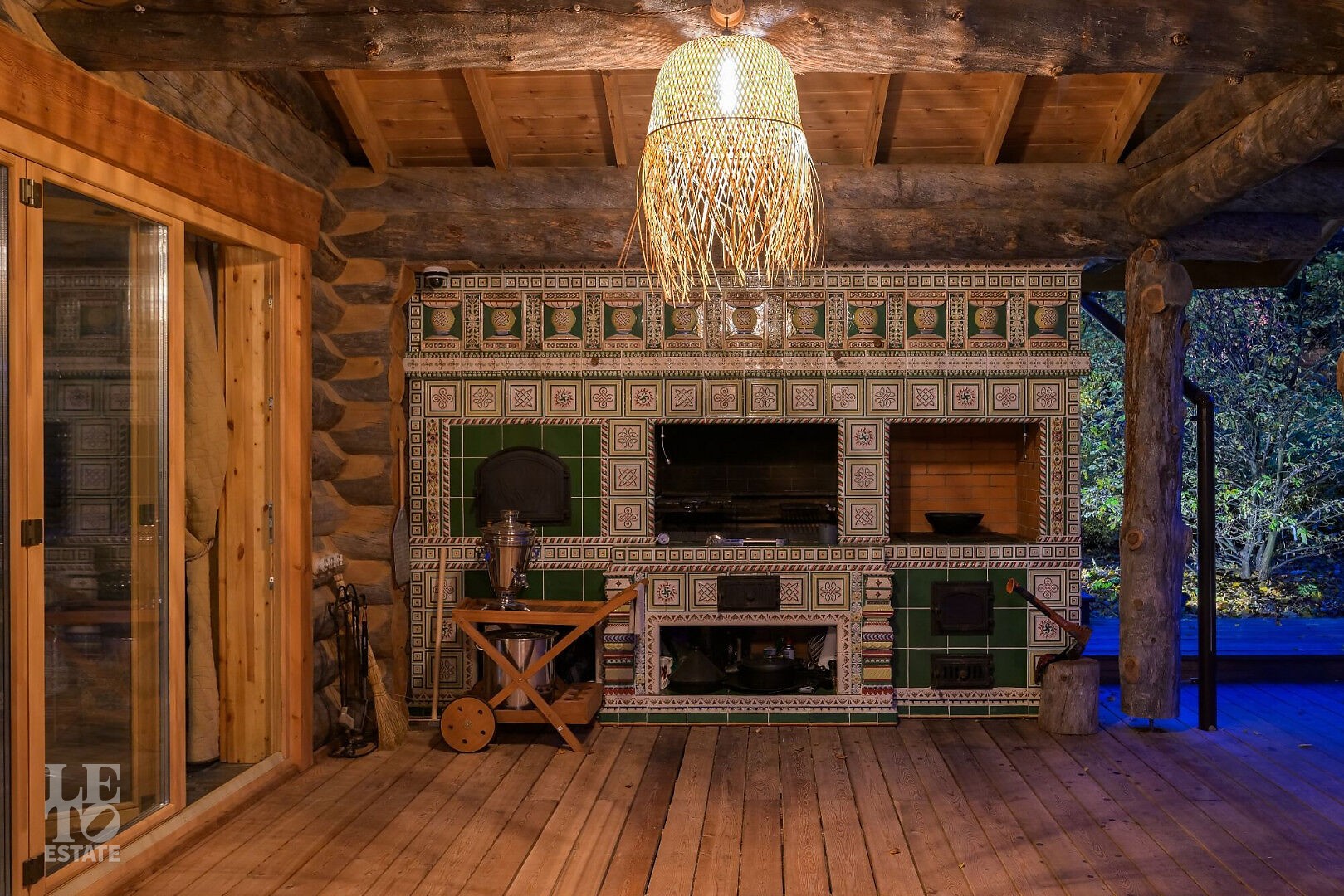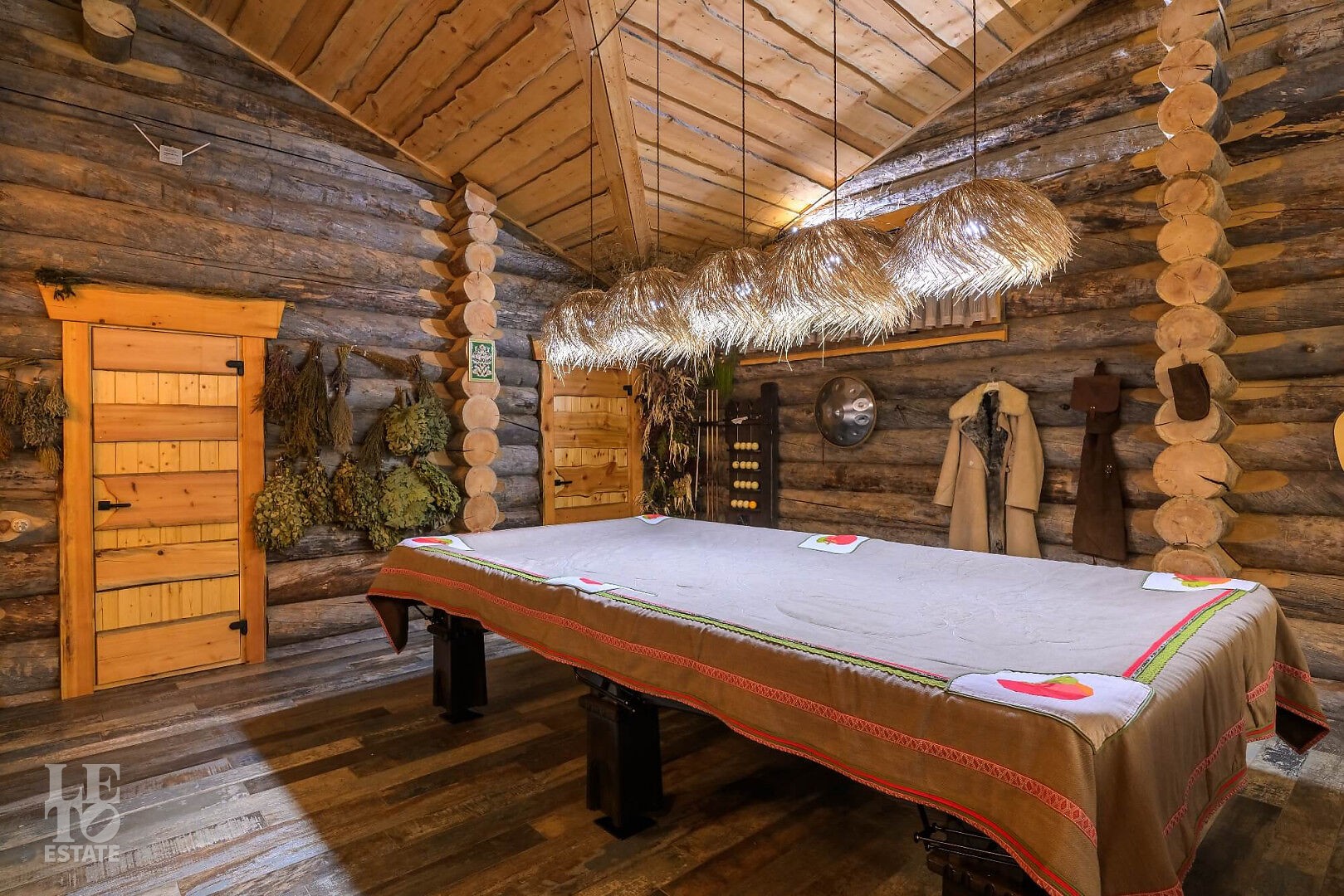 Роскошный банный комплекс из карельской сосны Кело диаметром 300 мм с камином, баром, кухней и русским бильярдом.