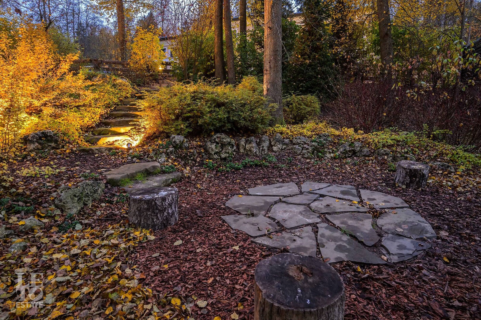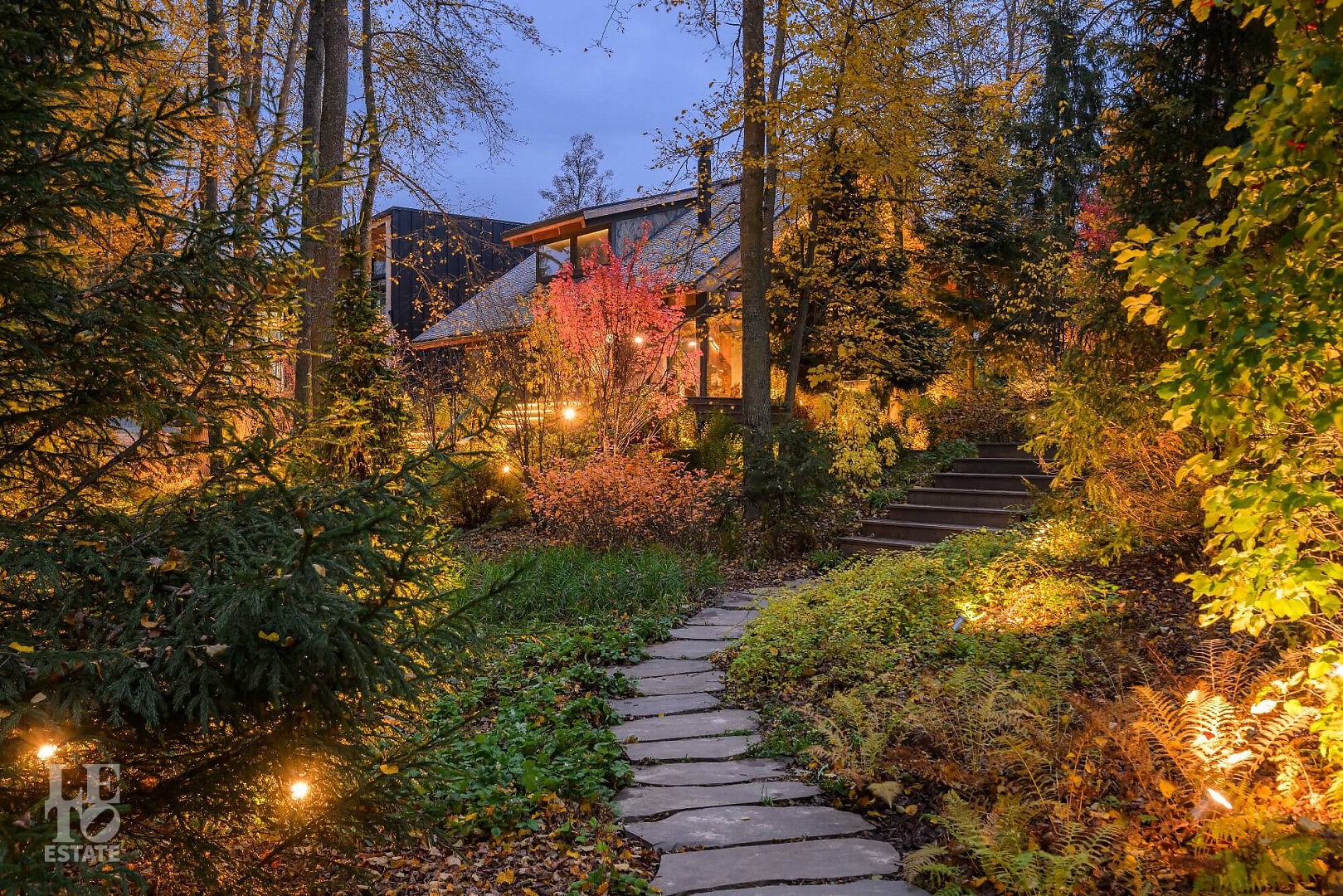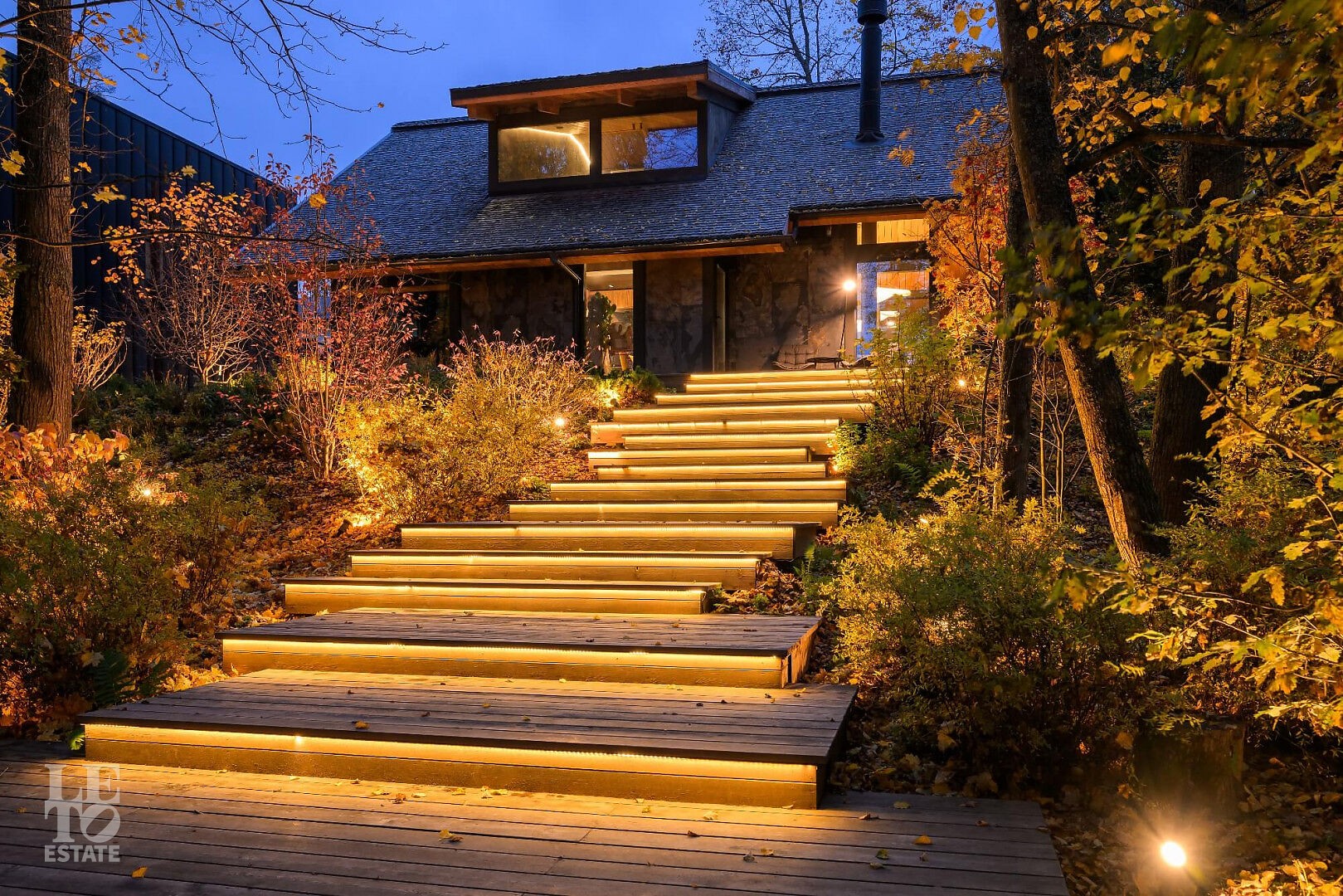 Рельеф пологий, но значительный - перепад высот достигает 5 м. Узкие тропинки ведут к плодовым кустам, среди которых яблони, смородина и другие растения. Многоуровневый лес вокруг дома. Мягкое ландшафтное освещение, создающее уютную атмосферу в любое время суток.