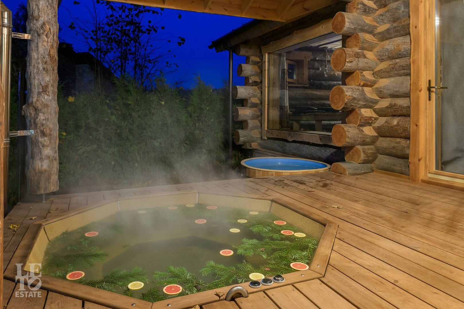Горячая купель на дровах фурако, встроенная в террасу из лиственницы: не надо прыгать по ступеням, а сразу садишься в комфортабельный чан с гидро- и аквамассажем. Рядом установлена холодная купель.
