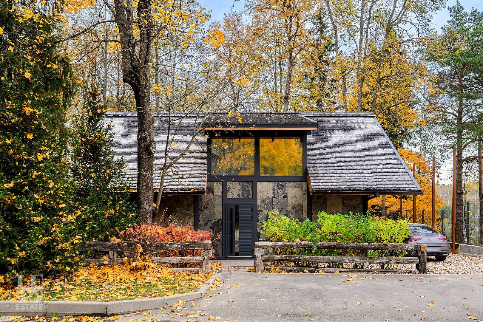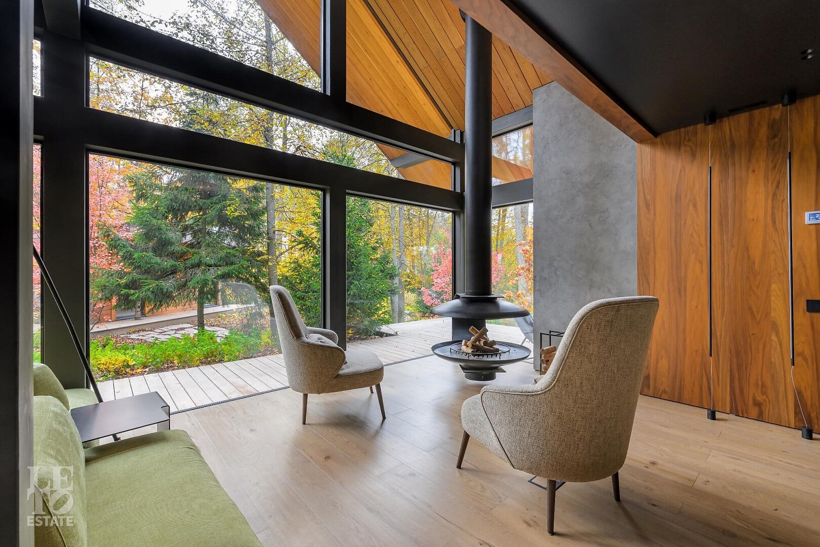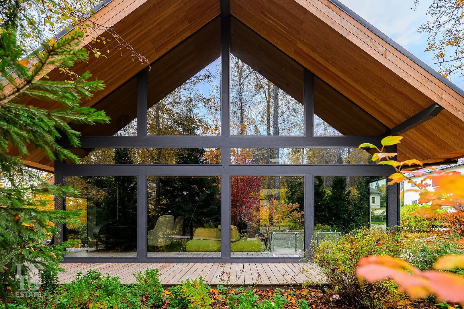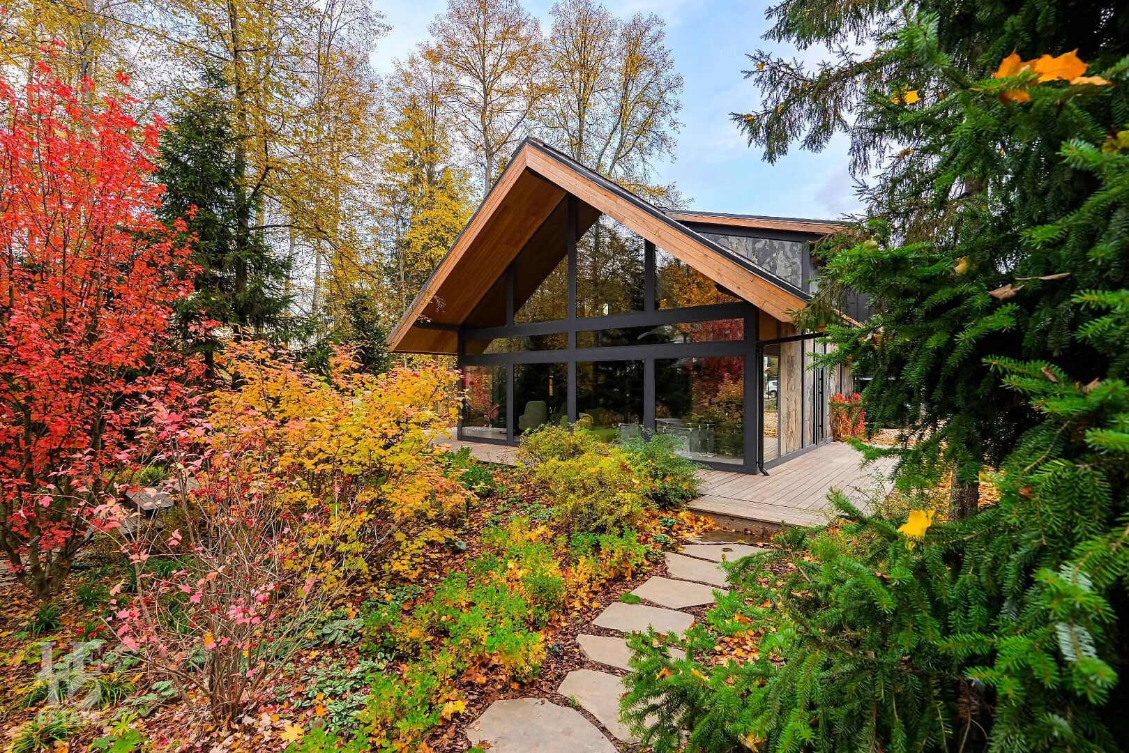 Уютный фахверк в скандинавском стиле с большим панорамным остеклением на лесном благоустроенном участке 20 соток в коттеджном поселке Новолеоново.