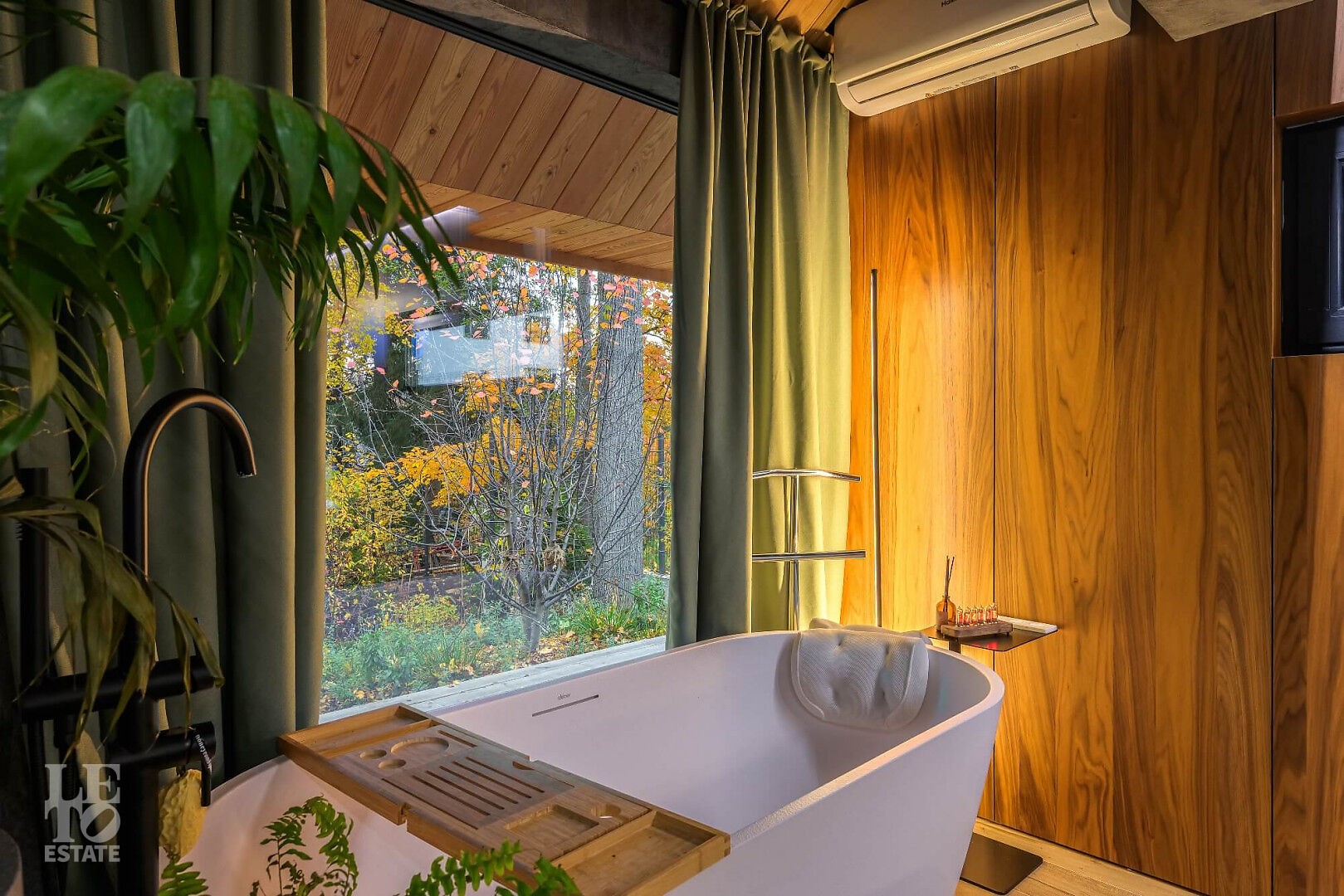 В парной установлено большое панорамное окно 1,7*2,4 м с подогревом (предотвращает запотевание).
