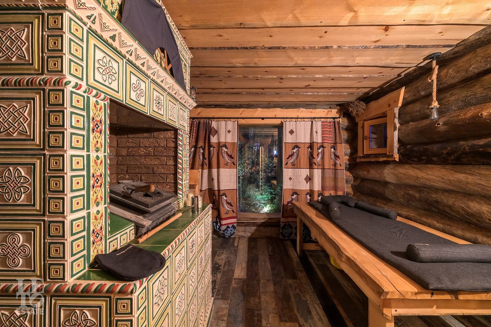 Весь текстиль: занавески, шторы и даже покрывало для бильярдного стола – сшиты по индивидуальному заказу в славянском стиле, в технике пэчворк (лоскутами) с инкрустацией. Банное пространство украшено масштабными композициями из сухоцветов.