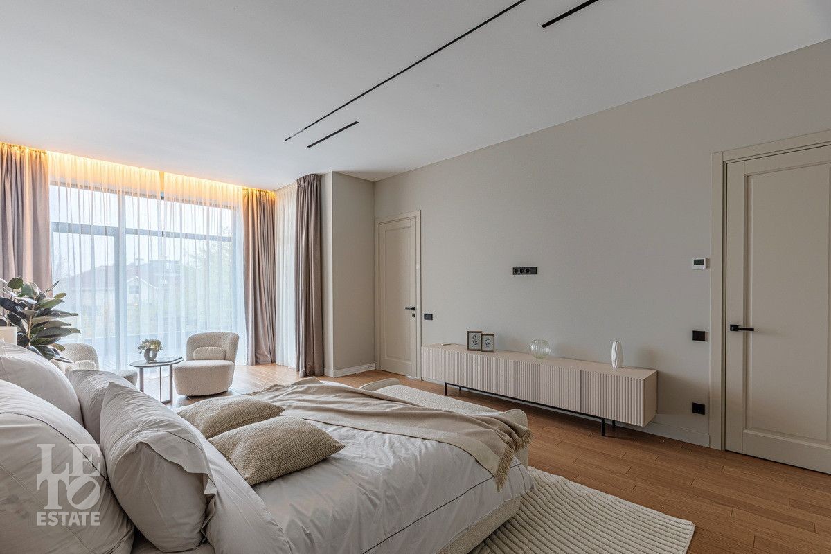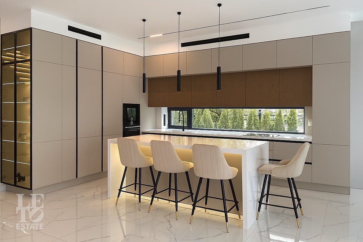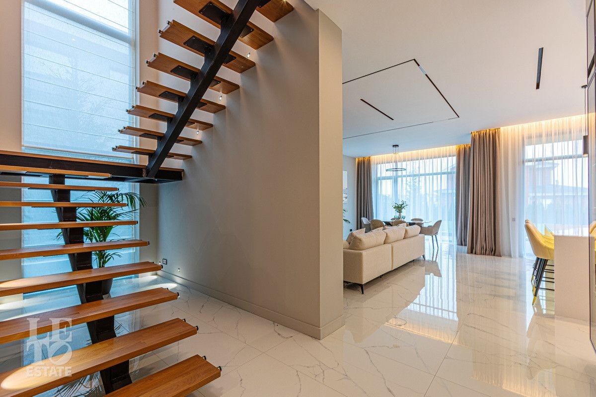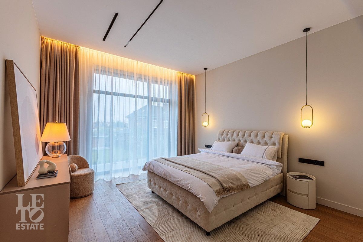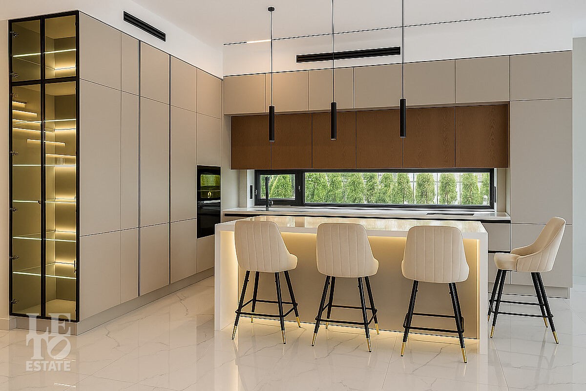Дом построен из блоков, монолитные перекрытия, крыша - мягкая кровля. Спроектирован с использованием основных принципов премиальной недвижимости: современный стиль, панорамные окна, высокие потолки 3,2 м. В доме есть вся необходимая встроенная техника и мебель. Продуманная планировка: пять спален, одна из которых расположена на первом этаже. На кухне есть вся необходимая встроенная техника. В каждой спальне установлена система кондиционирования.