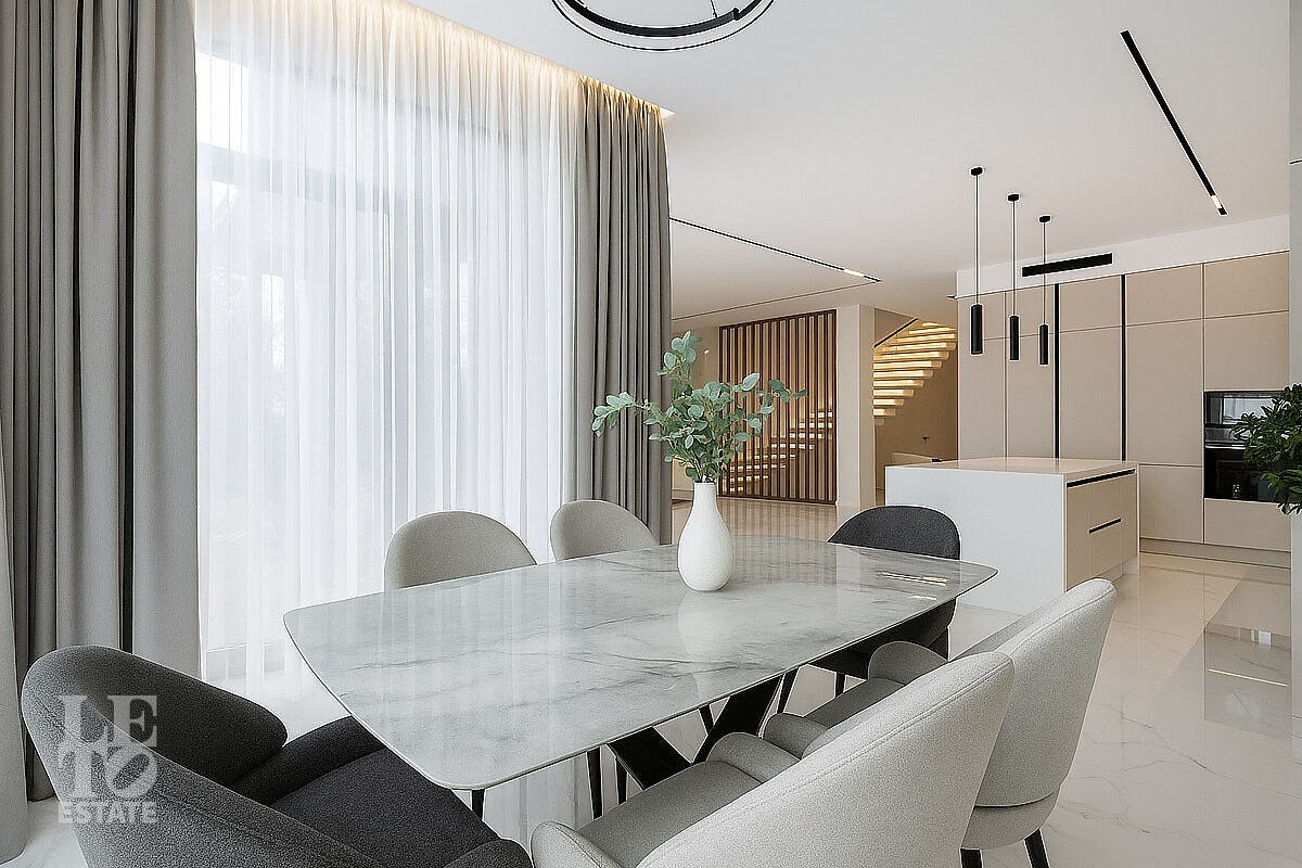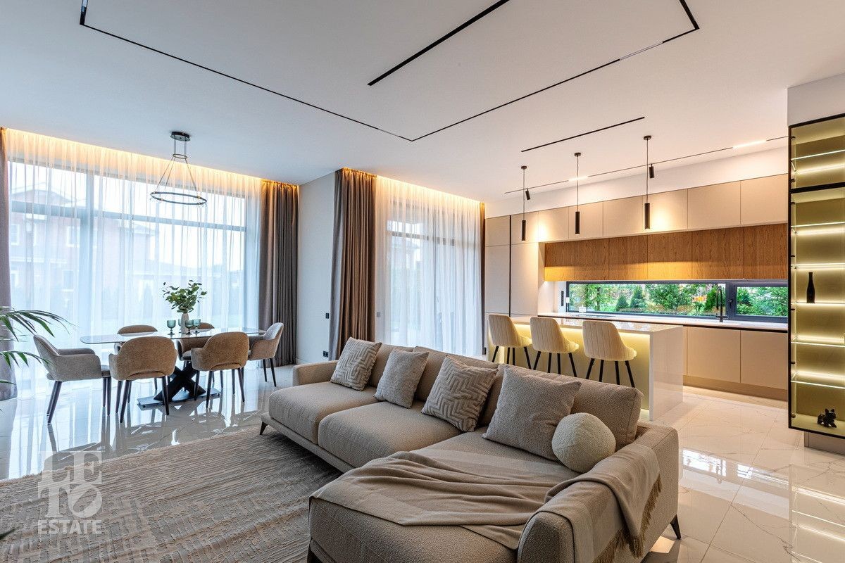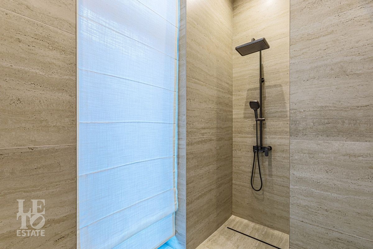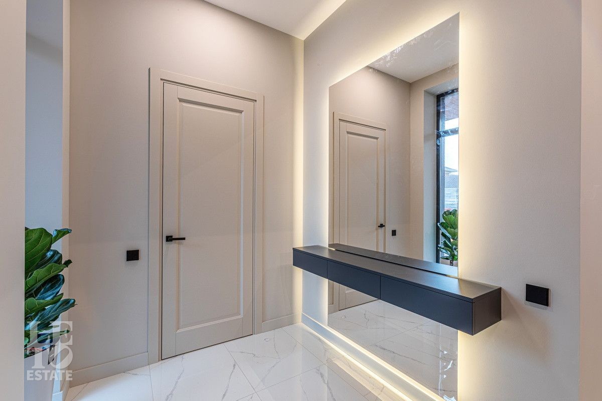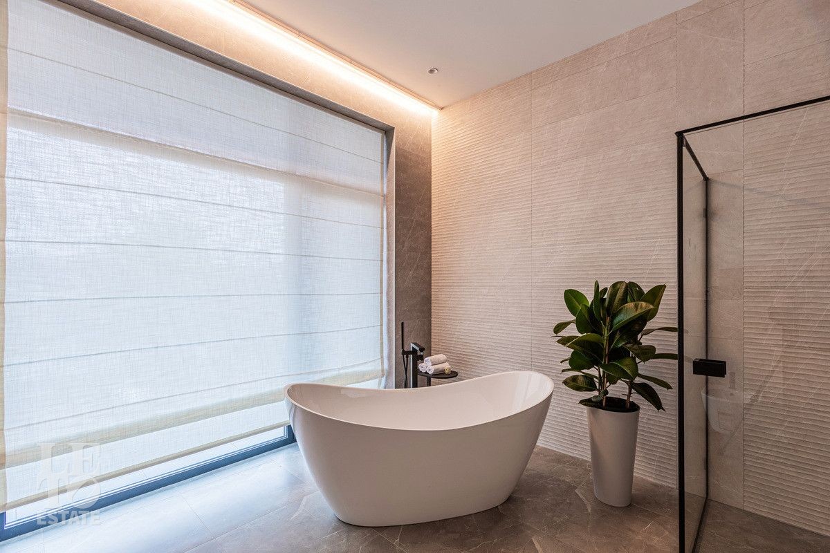 Дом построен из блоков, монолитные перекрытия, крыша - мягкая кровля. Спроектирован с использованием основных принципов премиальной недвижимости: современный стиль, панорамные окна, высокие потолки 3,2 м. В доме есть вся необходимая встроенная техника и мебель. Продуманная планировка: пять спален, одна из которых расположена на первом этаже. На кухне есть вся необходимая встроенная техника. В каждой спальне установлена система кондиционирования.