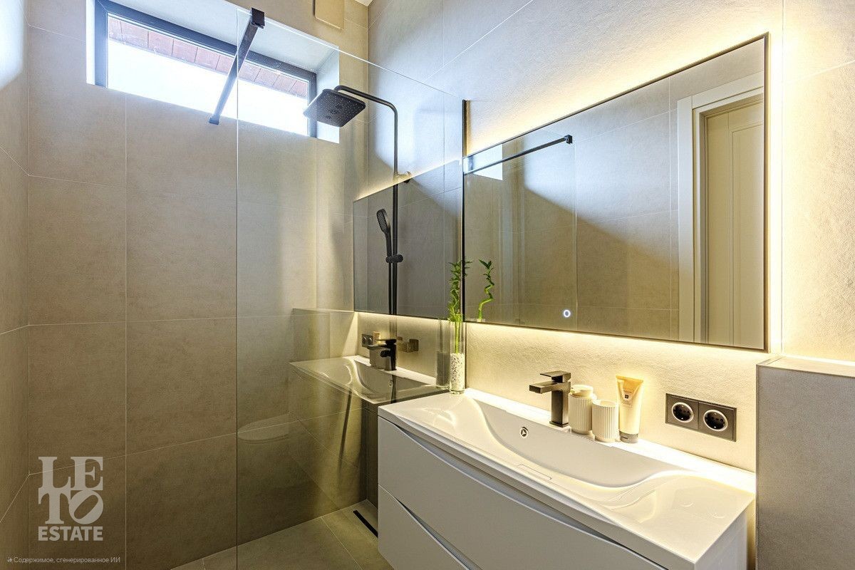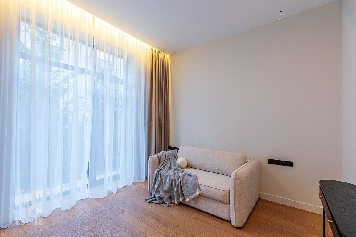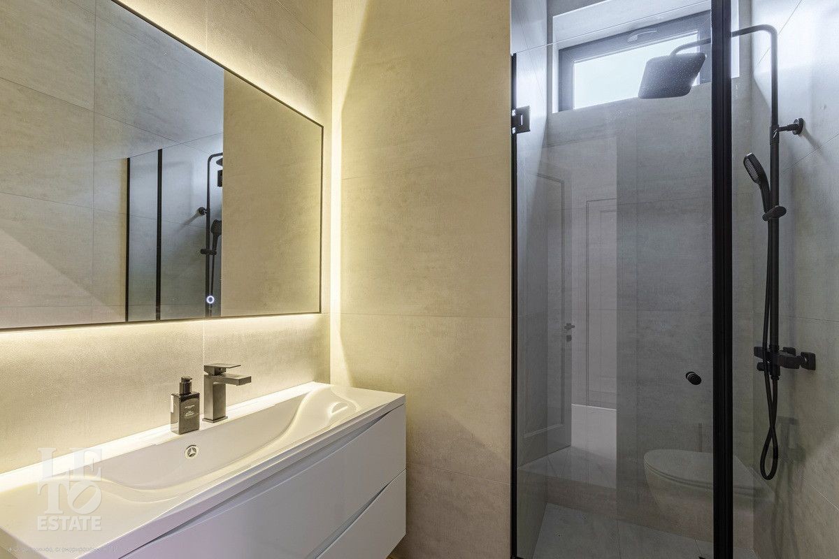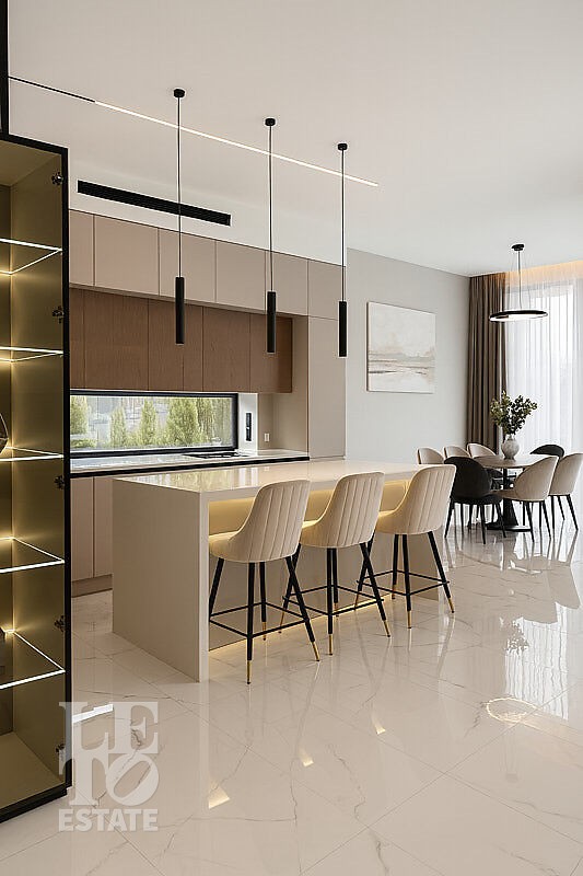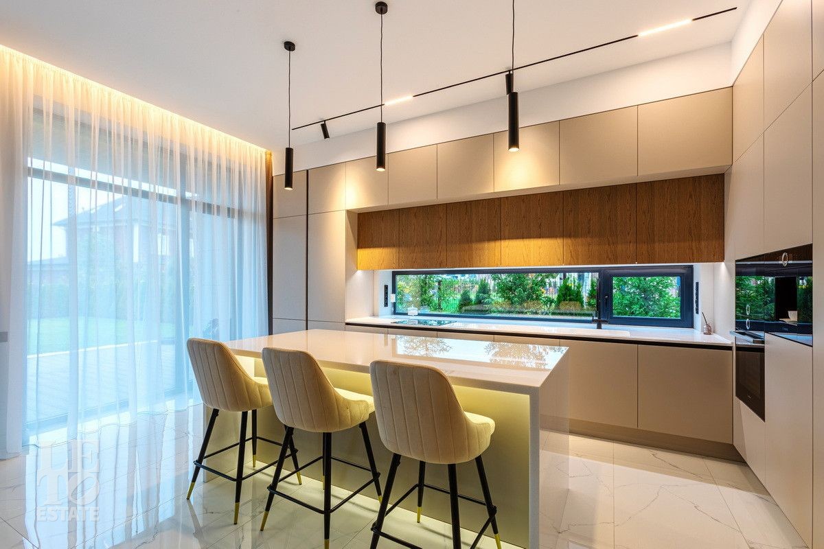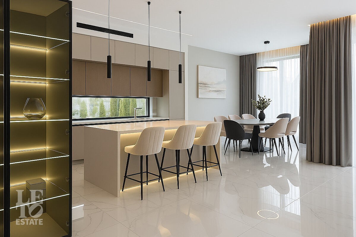 Дом построен из блоков, монолитные перекрытия, крыша - мягкая кровля. Спроектирован с использованием основных принципов премиальной недвижимости: современный стиль, панорамные окна, высокие потолки 3,2 м. В доме есть вся необходимая встроенная техника и мебель. Продуманная планировка: пять спален, одна из которых расположена на первом этаже. На кухне есть вся необходимая встроенная техника. В каждой спальне установлена система кондиционирования.