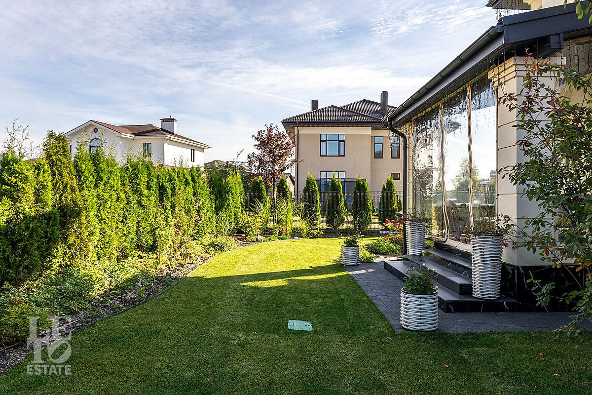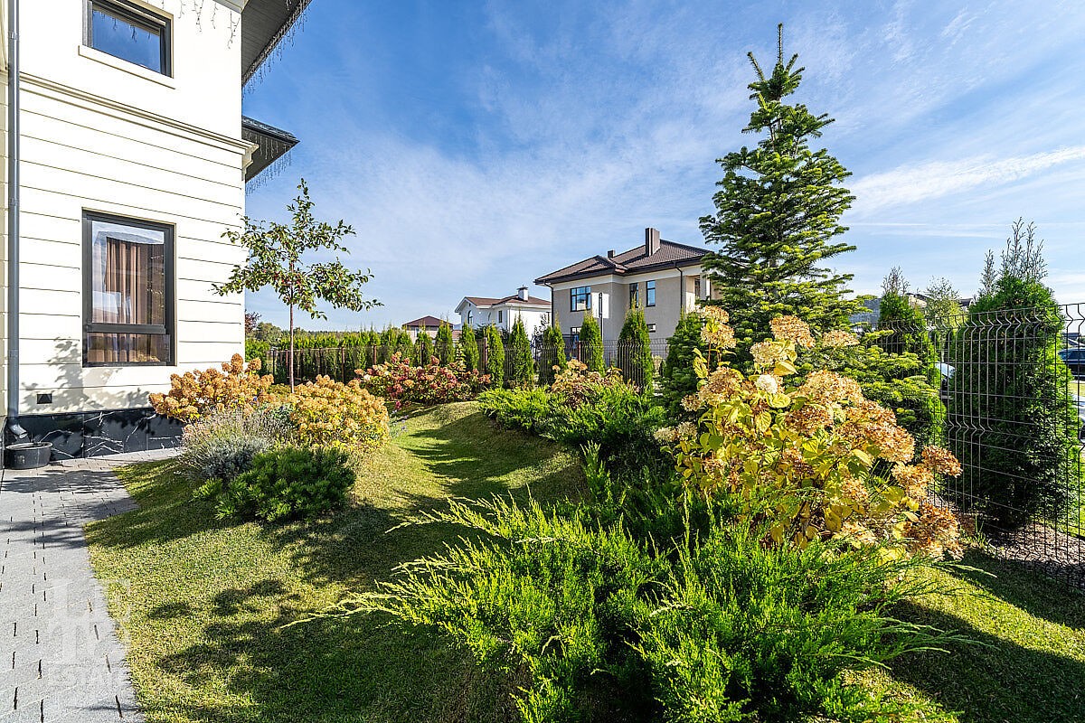 На участке сделан дренаж, ландшафтный дизайн. Высажены декоративные кустарники и растения. По периметру участка посажены туи. Установлено вечернее освещение.