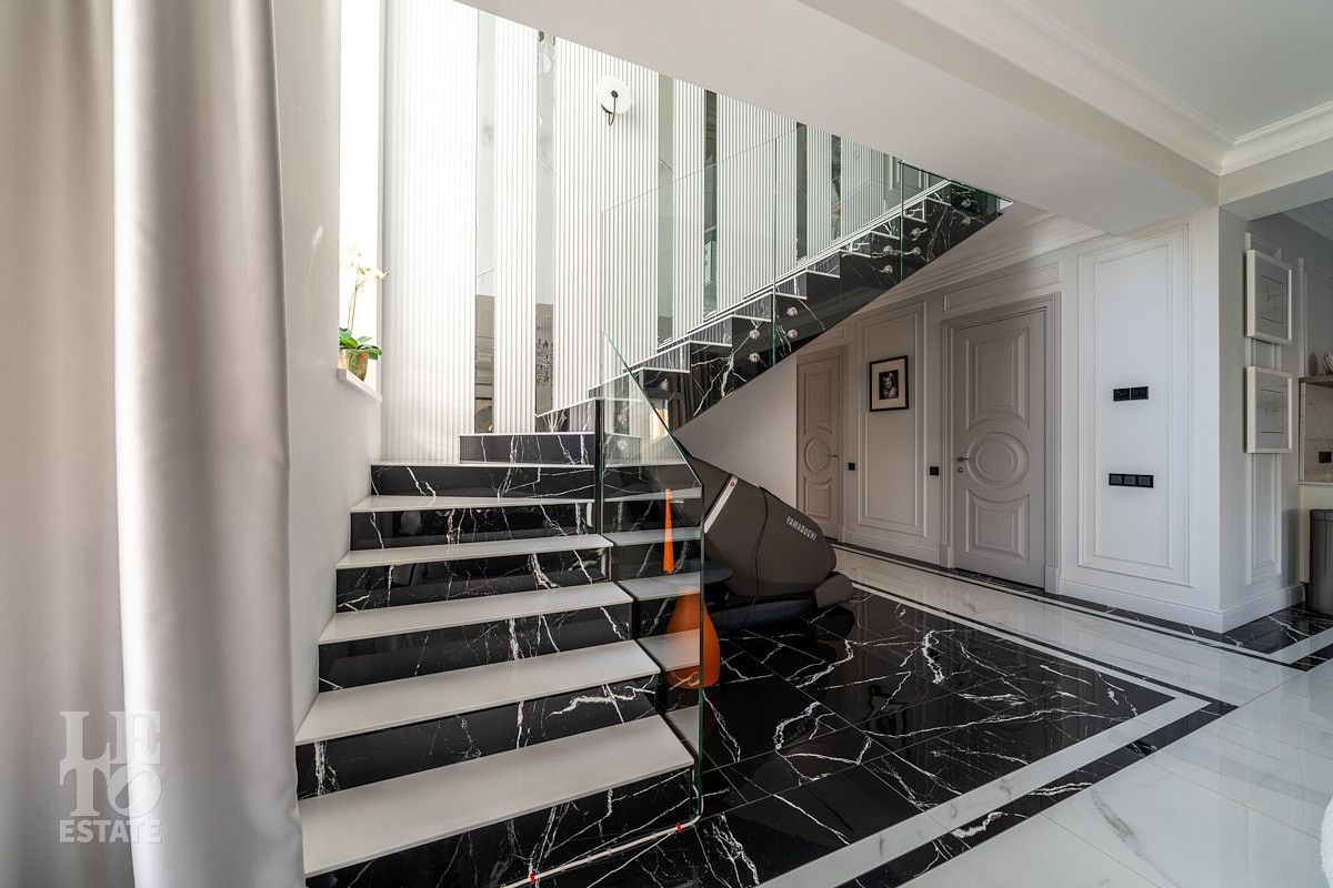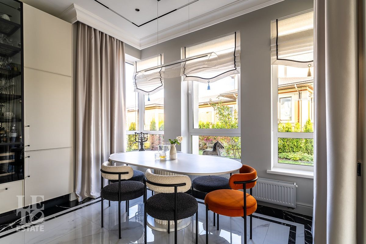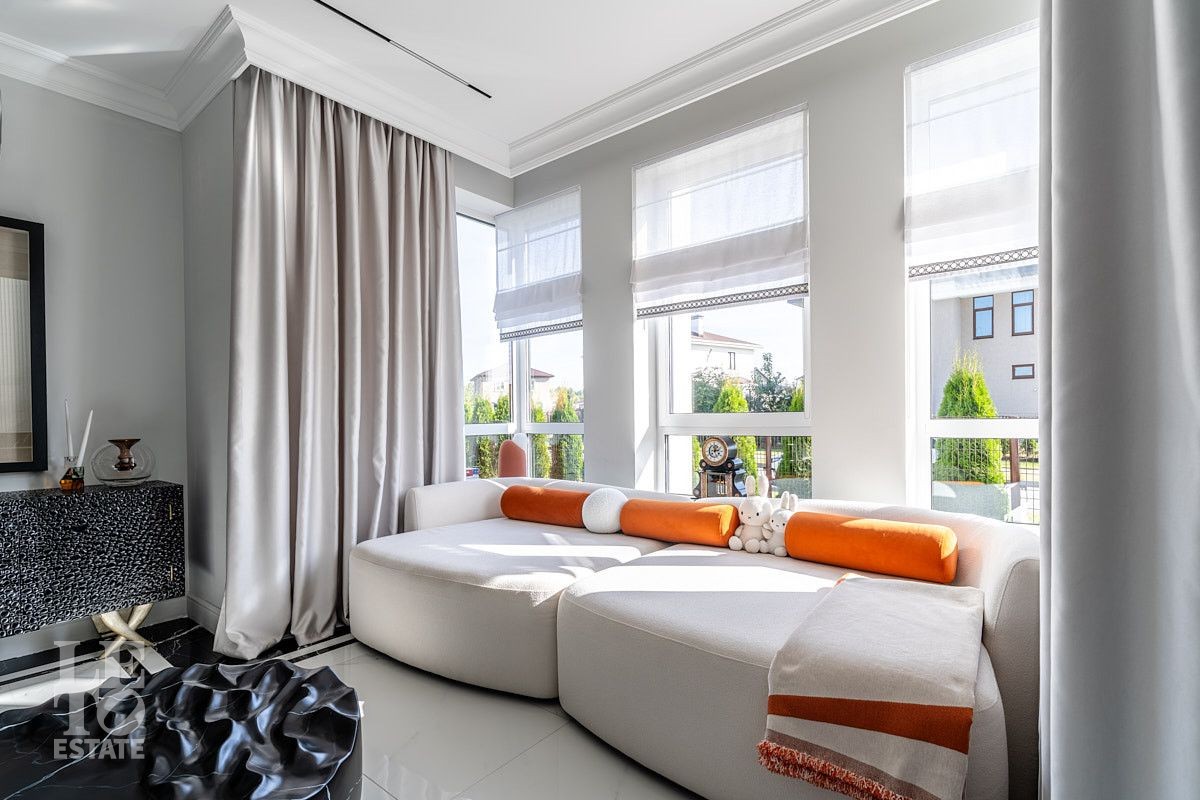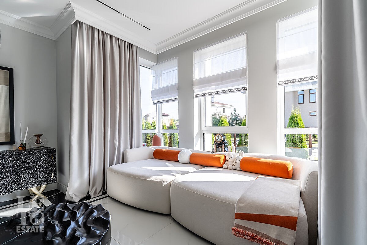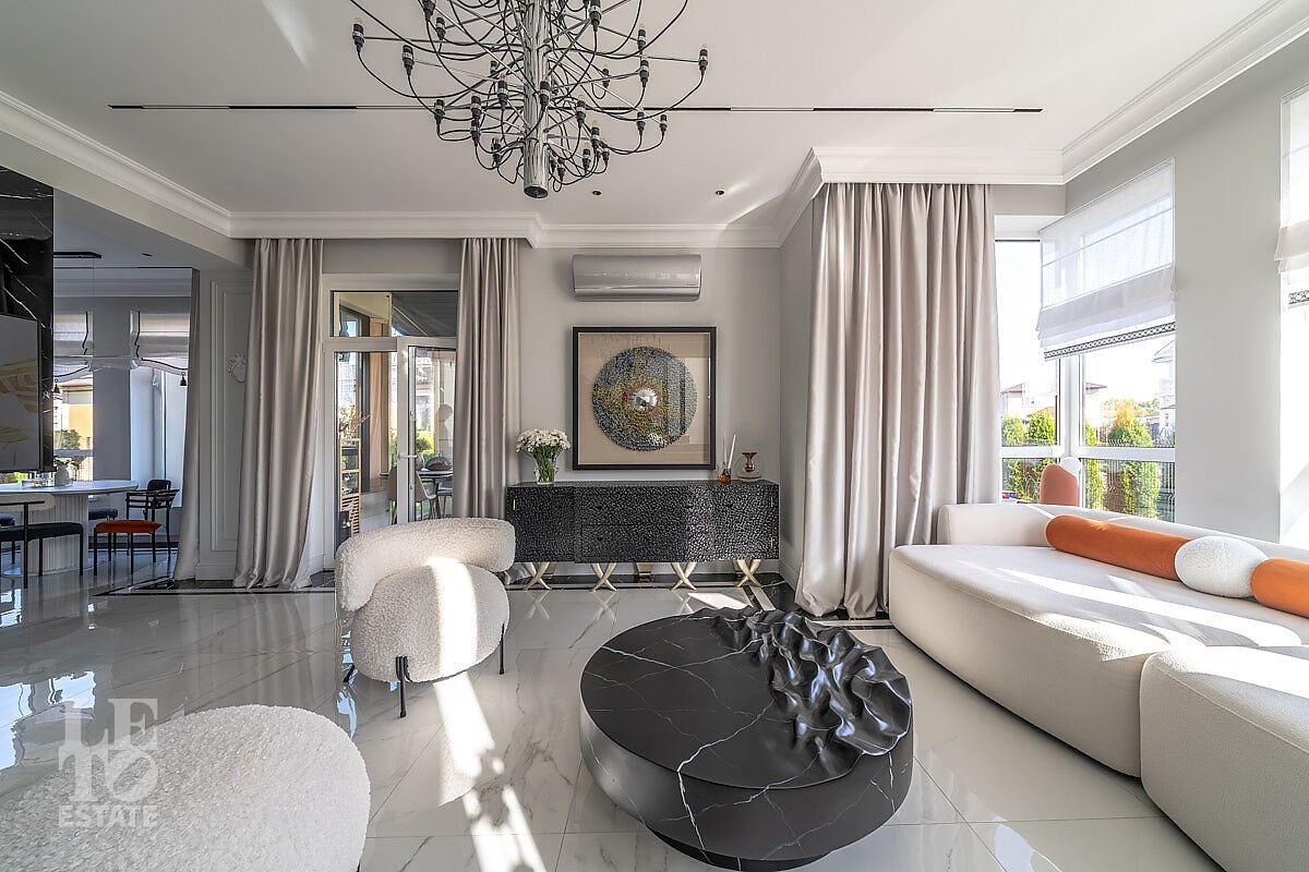 Отделка выполнена по индивидуальному проекту. Интерьер продуман до мелочей. Эксклюзивные дизайнерские решения придают уникальность внутреннему пространству дома.