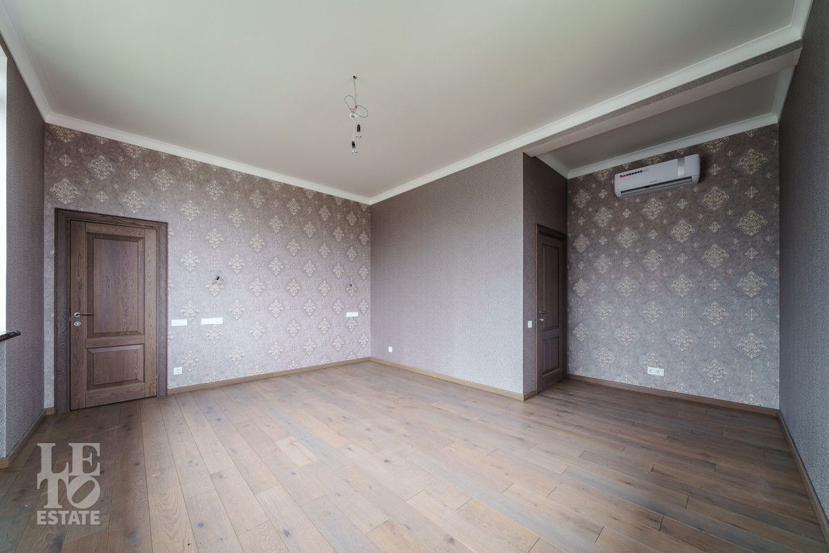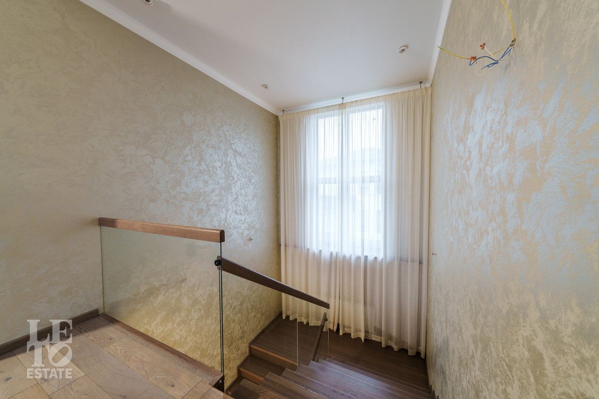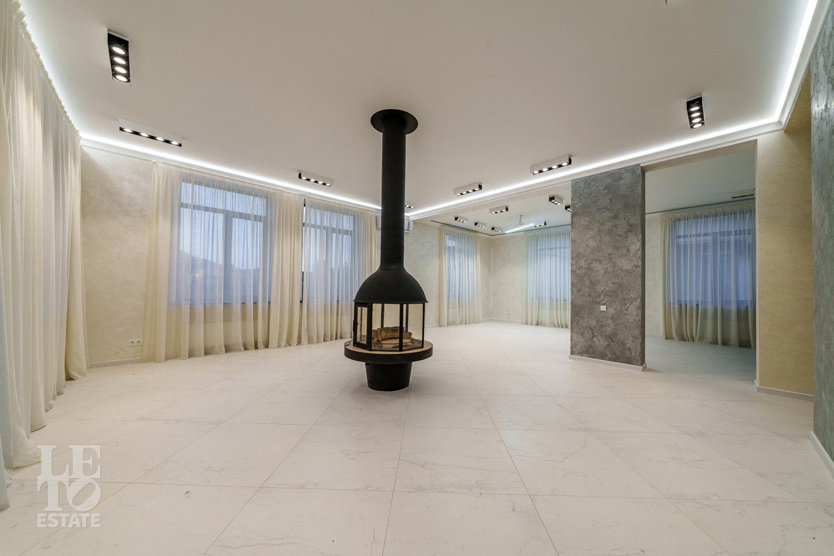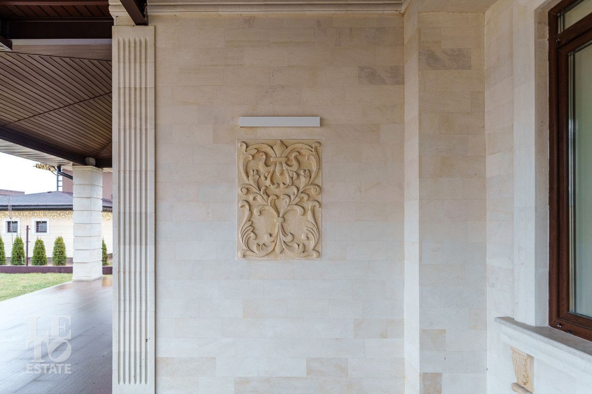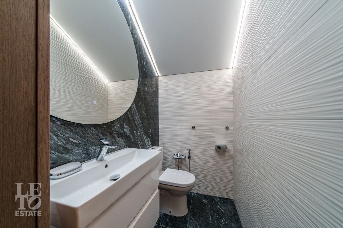 В основном доме на первом этаже можно оборудовать две спальни, на втором этаже три спальни. Отделка стен выполнена декоративной штукатуркой, использованы натуральные материалы для лестницы и дверей - дуб, пол - инженерная доска. Теплые полы разведены на первом этаже, на втором этаже в санузлах. Установлено кондиционирование.