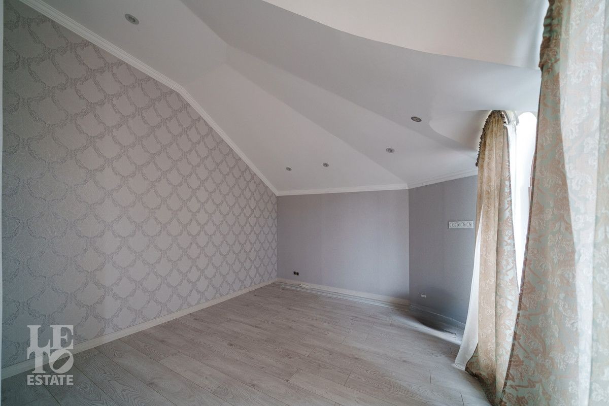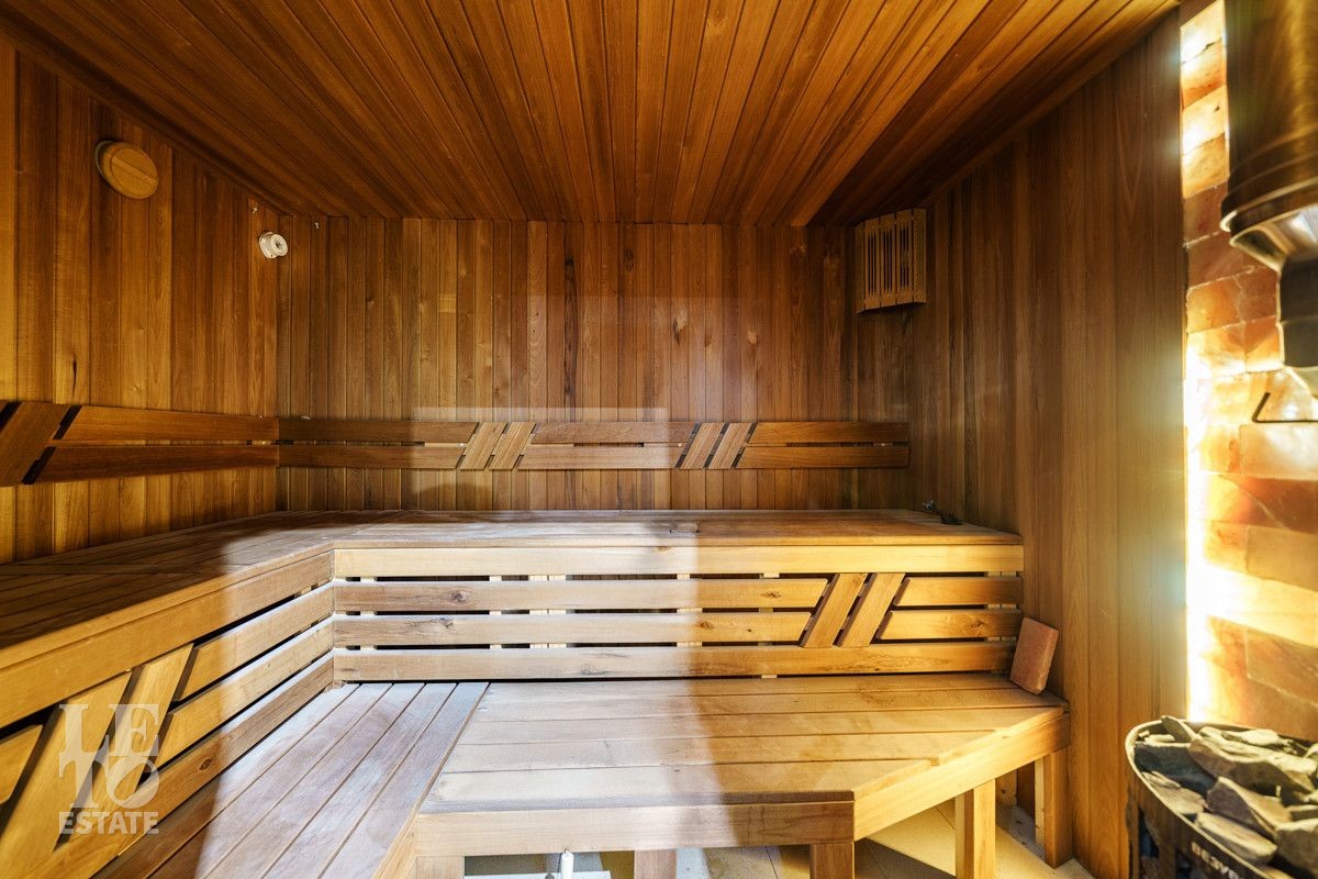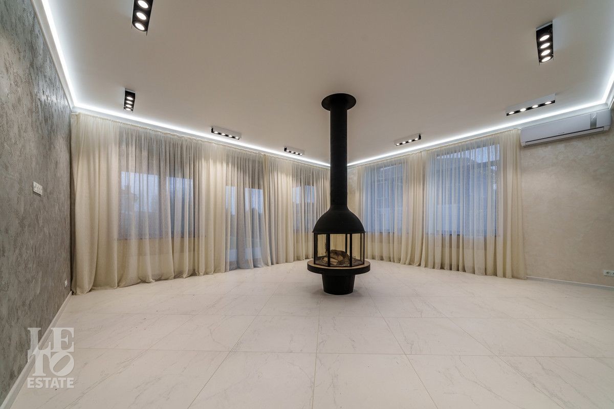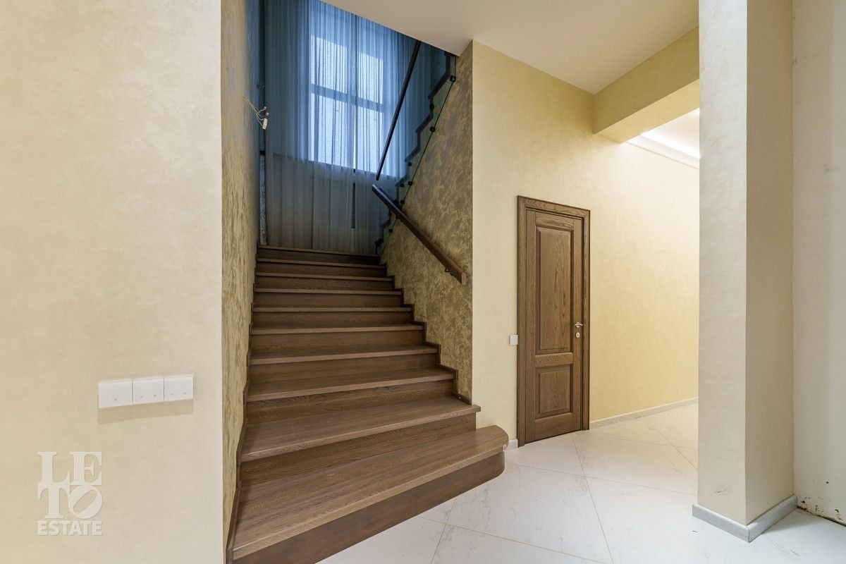 В основном доме на первом этаже можно оборудовать две спальни, на втором этаже три спальни. Отделка стен выполнена декоративной штукатуркой, использованы натуральные материалы для лестницы и дверей - дуб, пол - инженерная доска. Теплые полы разведены на первом этаже, на втором этаже в санузлах. Установлено кондиционирование.