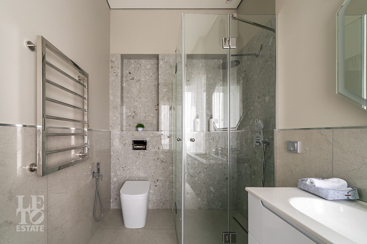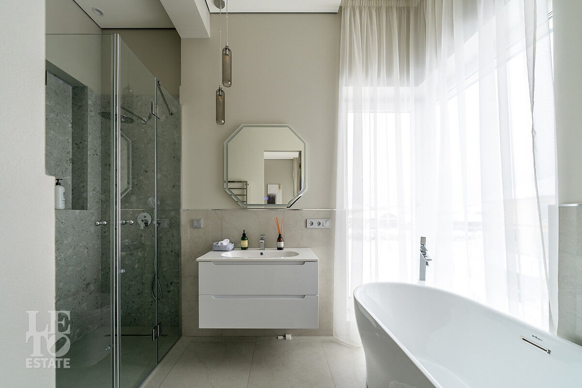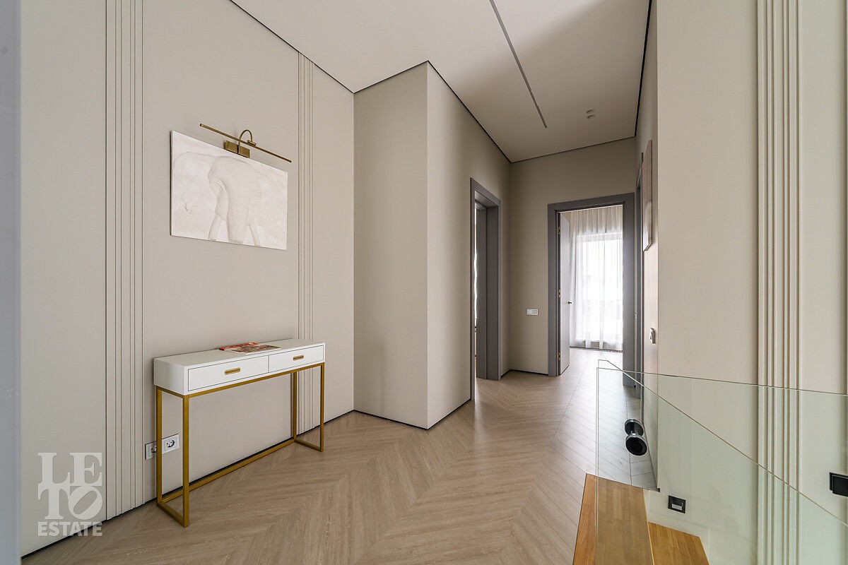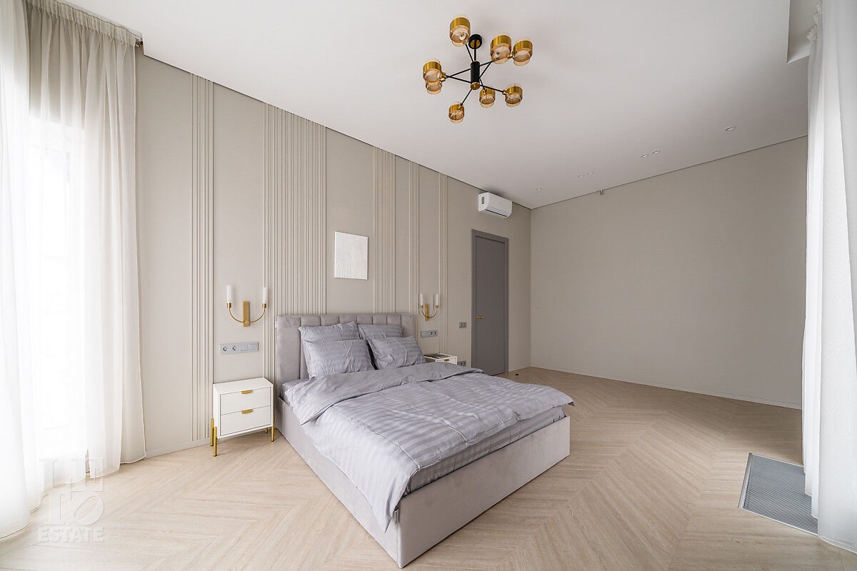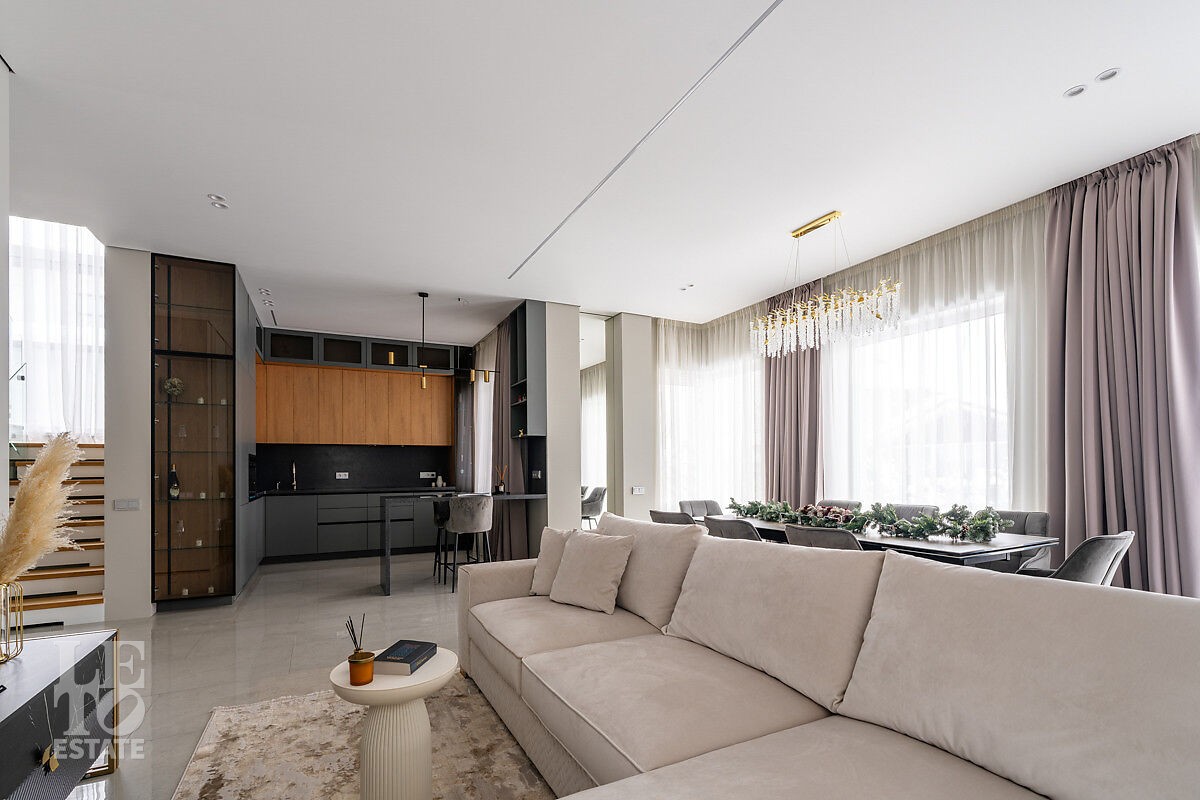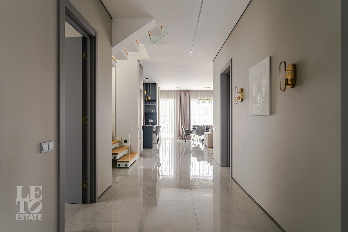 В доме есть вся необходимая мебель и встроенная техника для постоянного проживания. Есть теплые полы, сделано зонирование освещения, установлено кондиционирование.