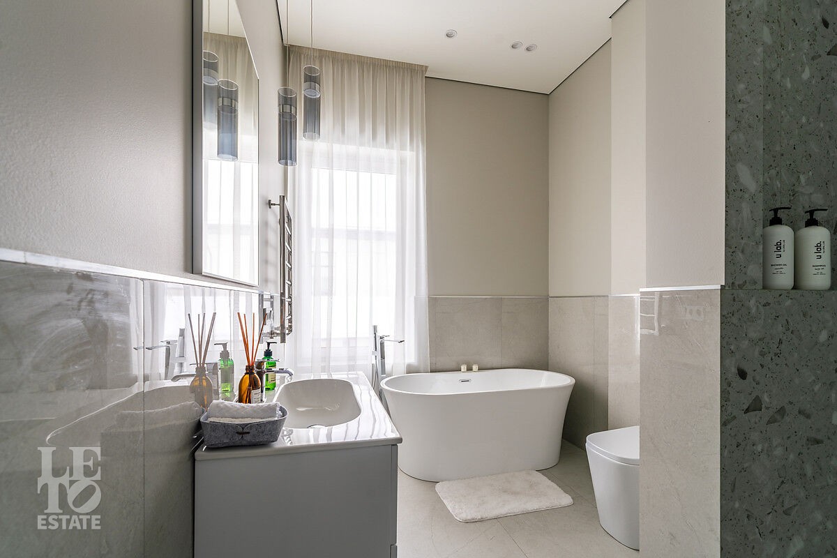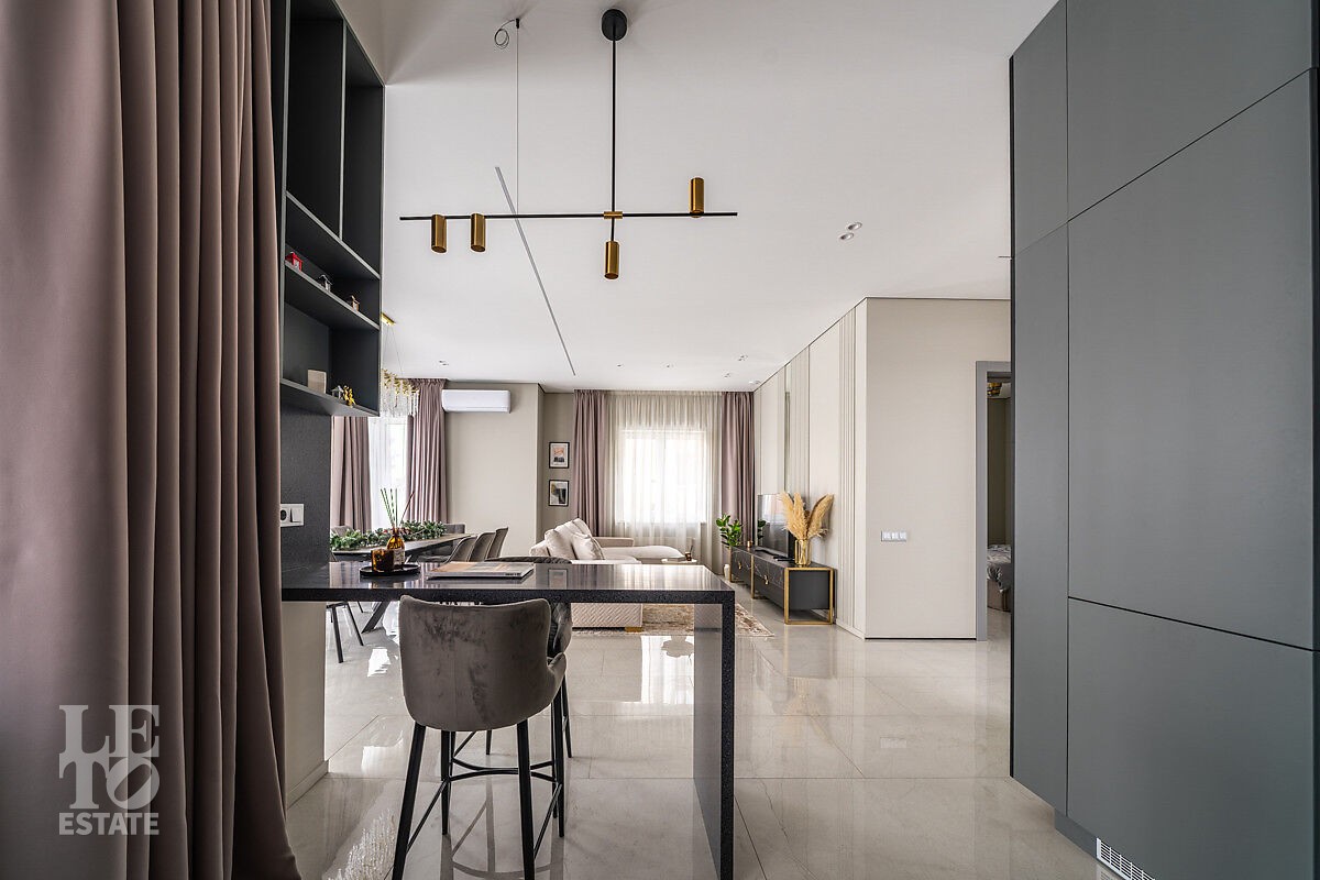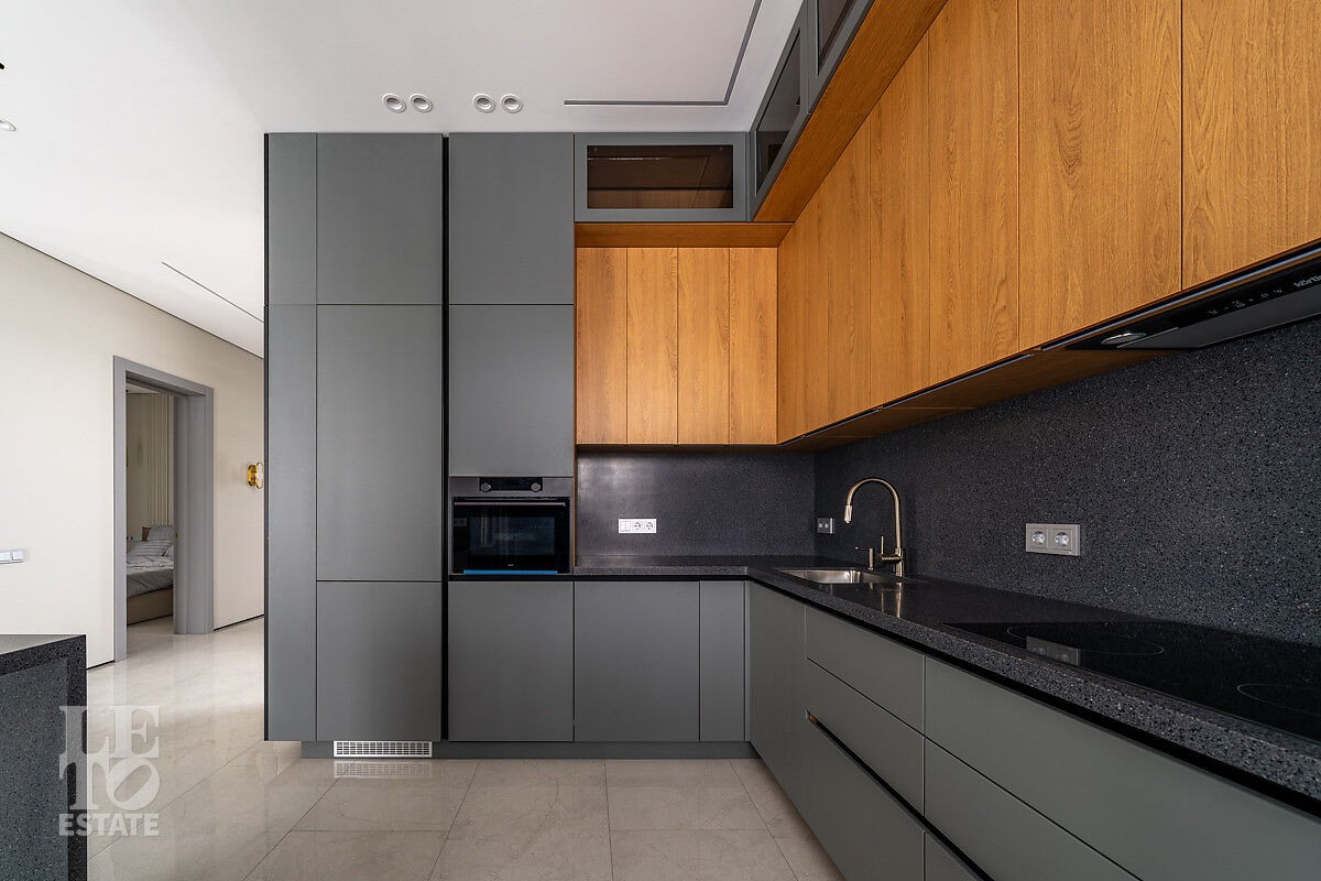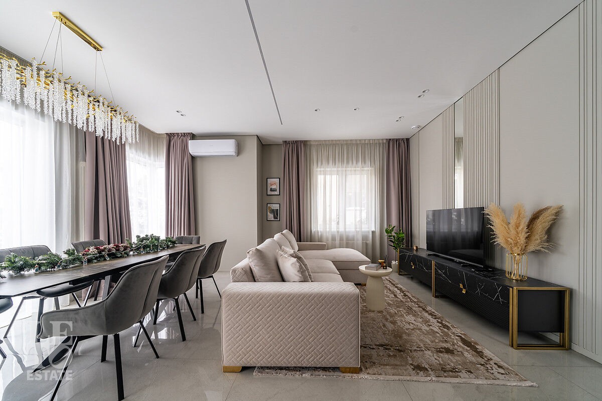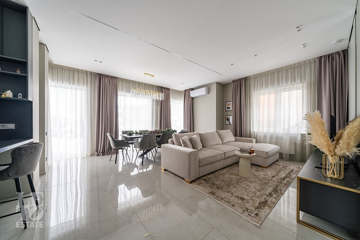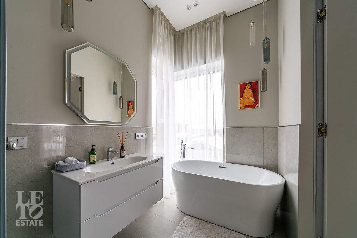 В доме есть вся необходимая мебель и встроенная техника для постоянного проживания. Есть теплые полы, сделано зонирование освещения, установлено кондиционирование.