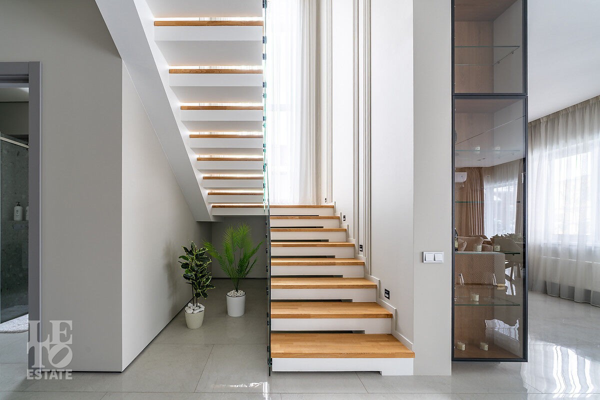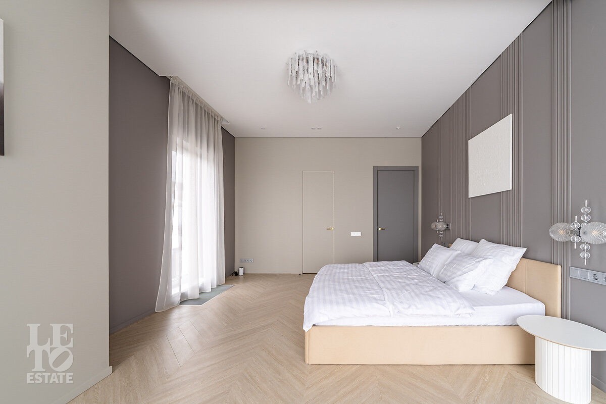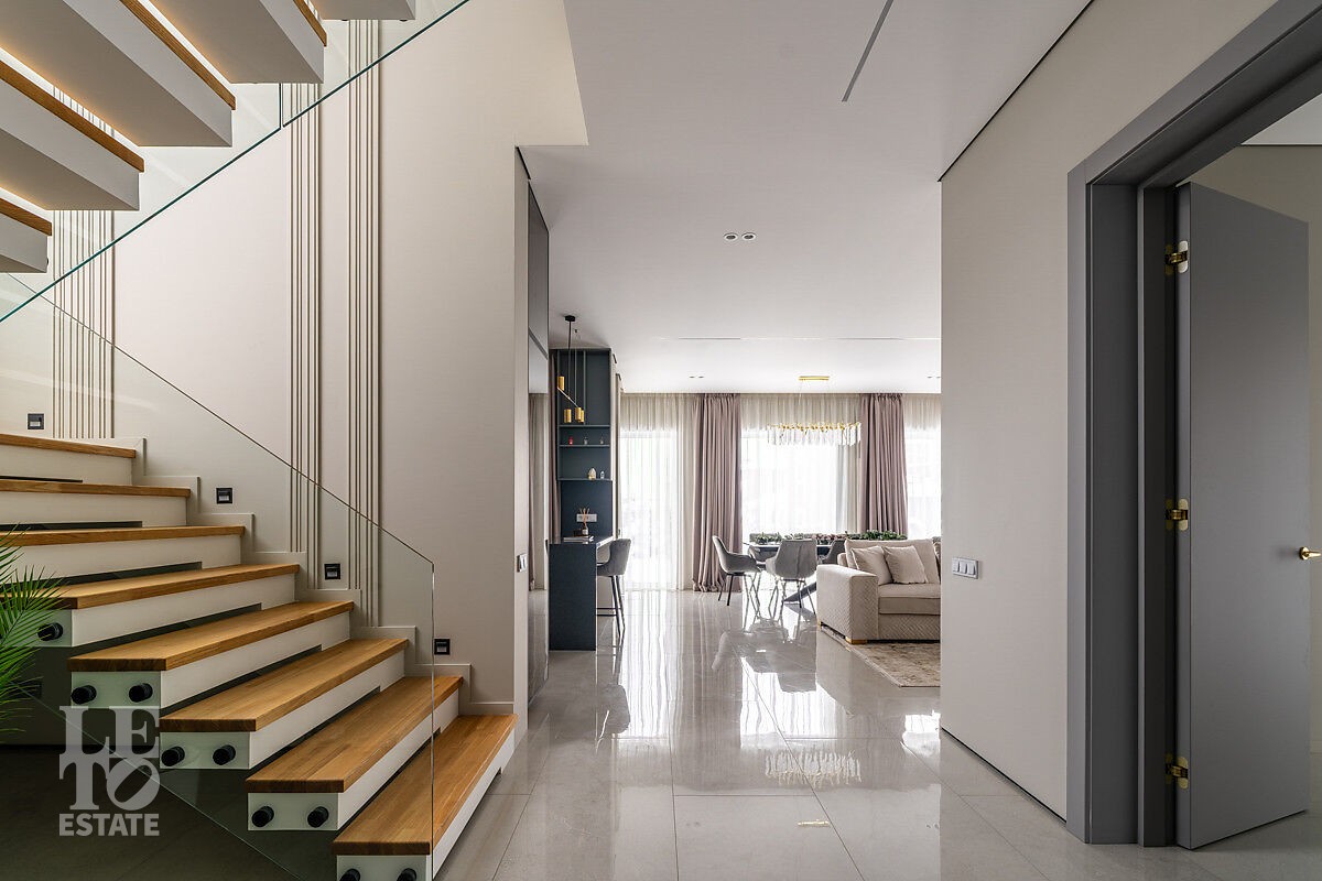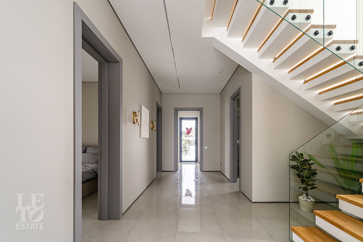 Большое количество панорамного остекления и использование светлых тонов в отделке создает ощущение дополнительного пространства и света. В доме пять спален, одна из них расположена на первом этаже. Из кухни-столовой есть выход на участок.