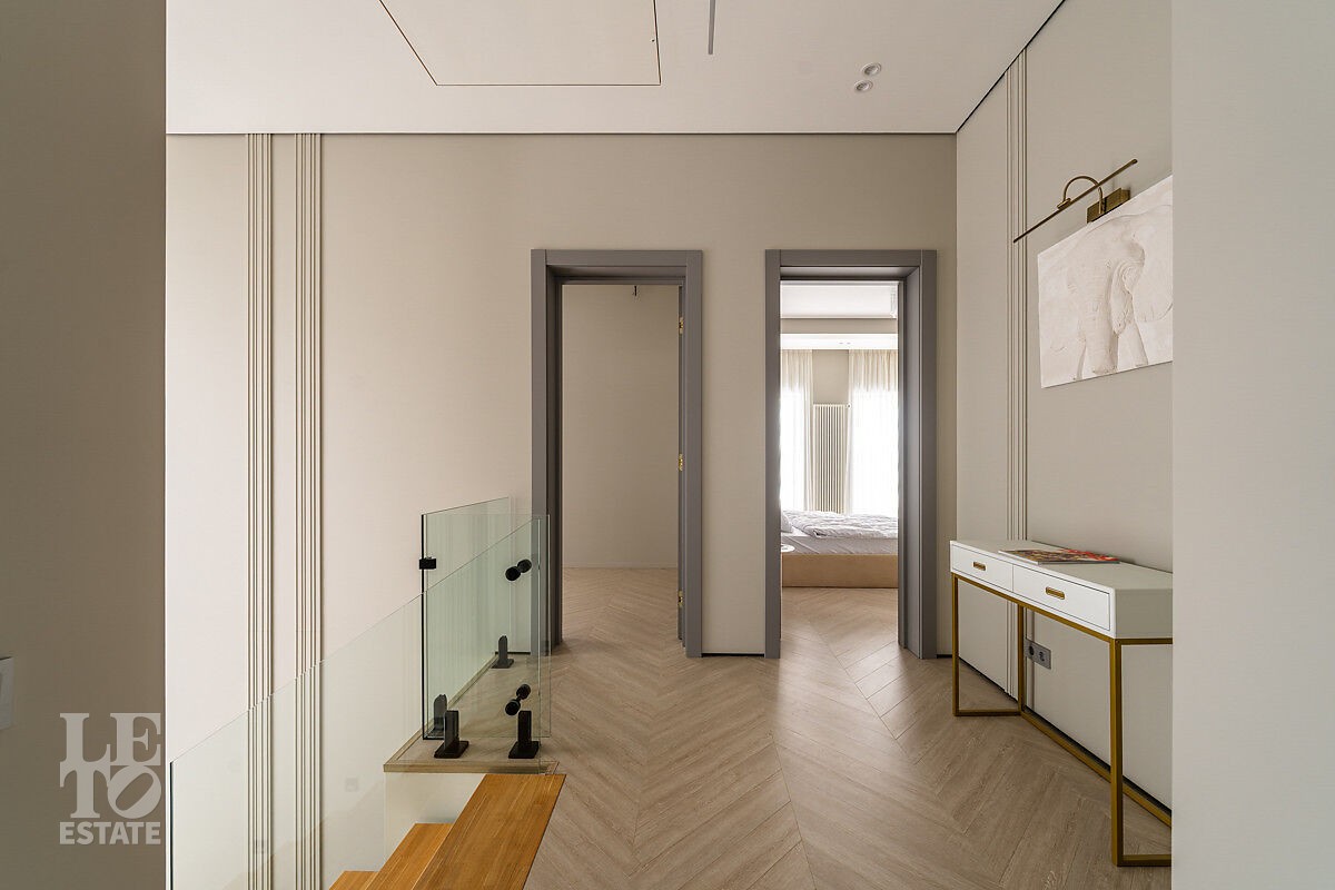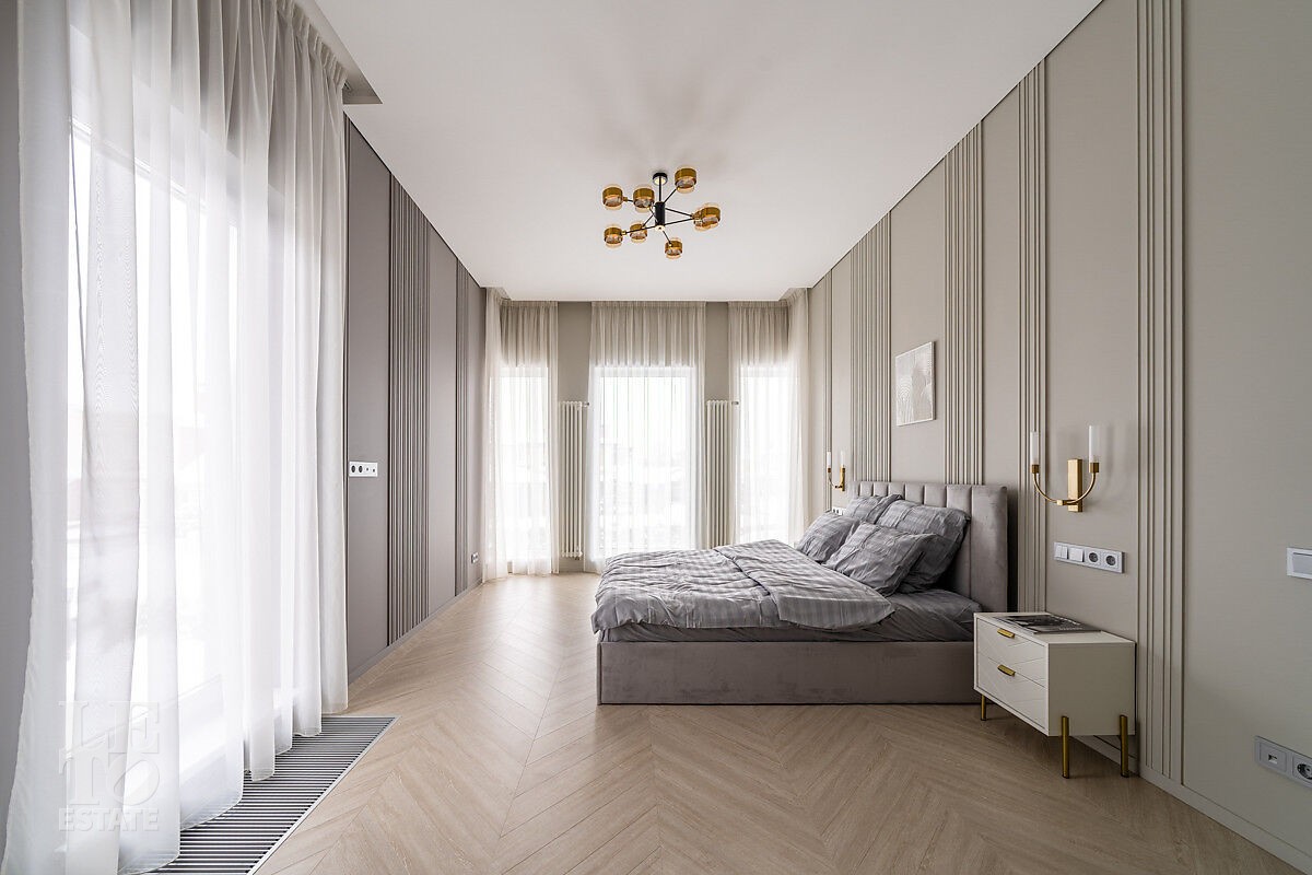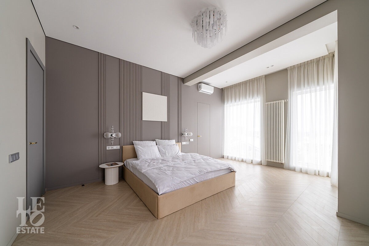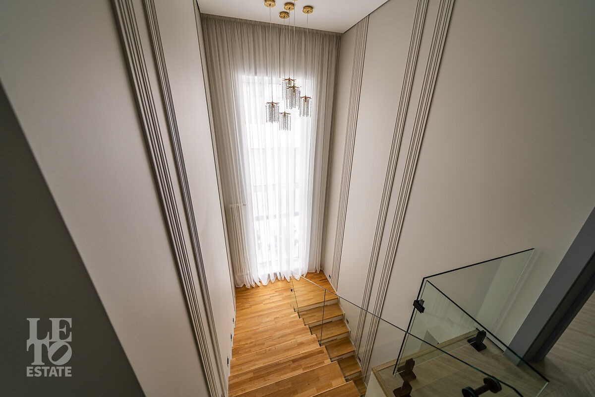 Большое количество панорамного остекления и использование светлых тонов в отделке создает ощущение дополнительного пространства и света. В доме пять спален, одна из них расположена на первом этаже. Из кухни-столовой есть выход на участок.