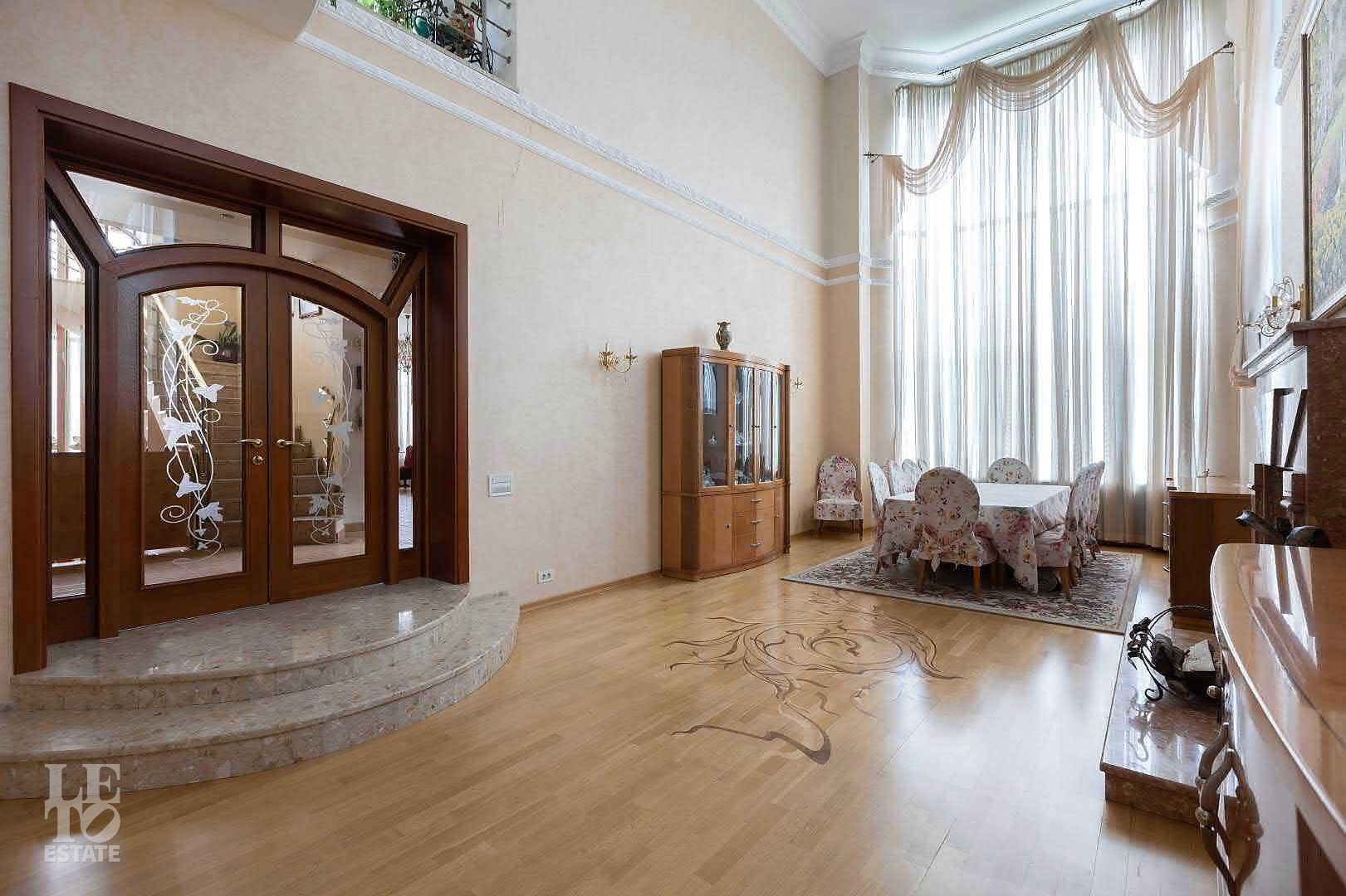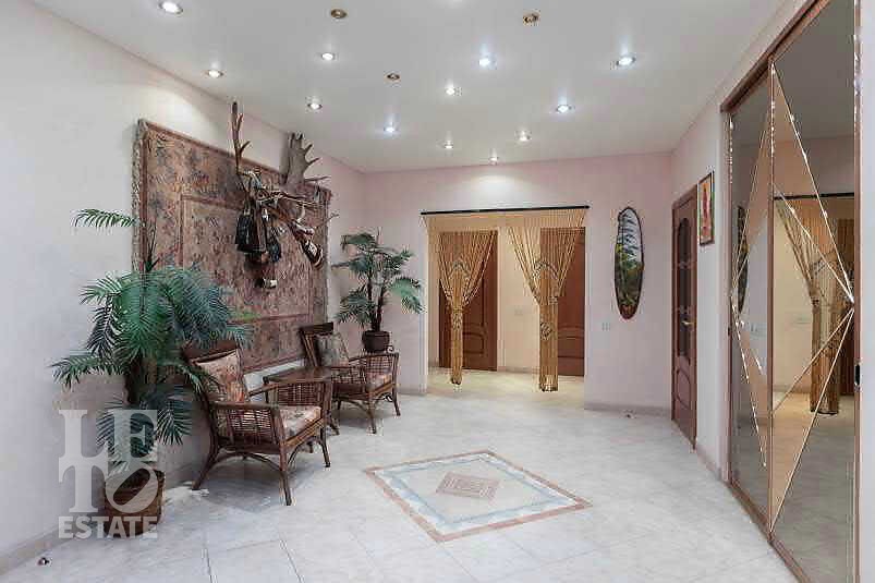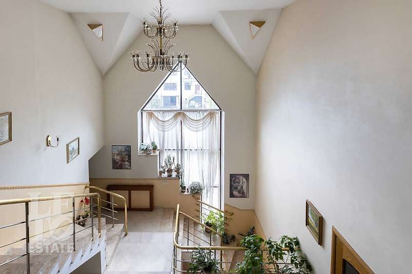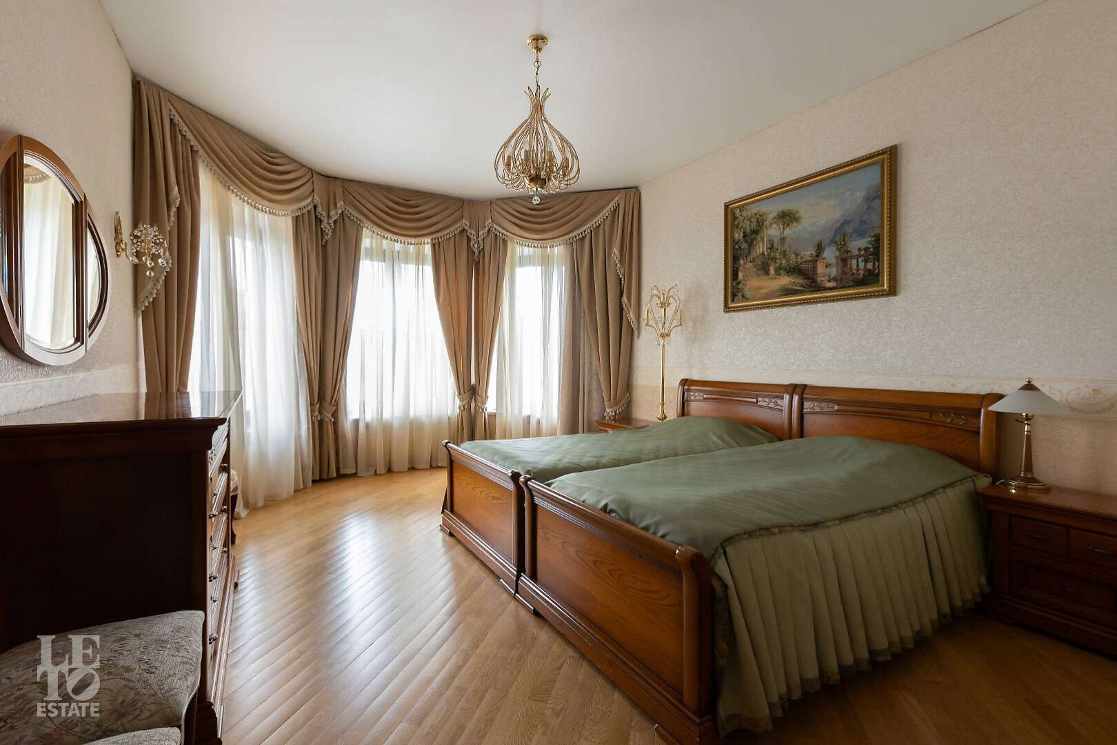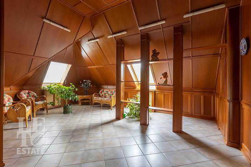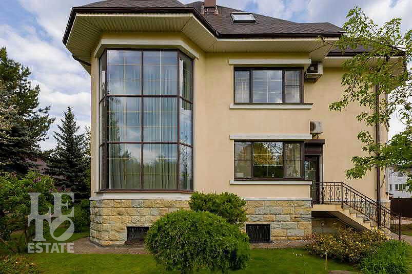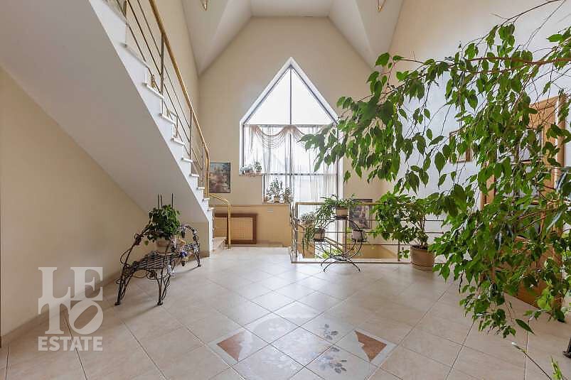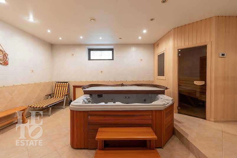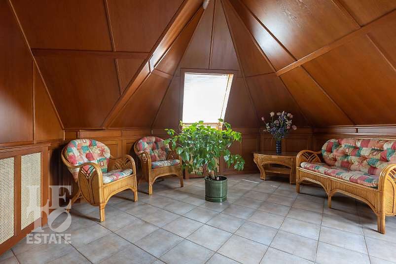 Площадь коттеджа 526 кв.м. 4 уровня, включая мансарду и цокольный этаж. В доме 4 спальни, 5 с/у, кухня-столовая, каминный зал, кабинет, сауна, бильярдная, спортивный зал.