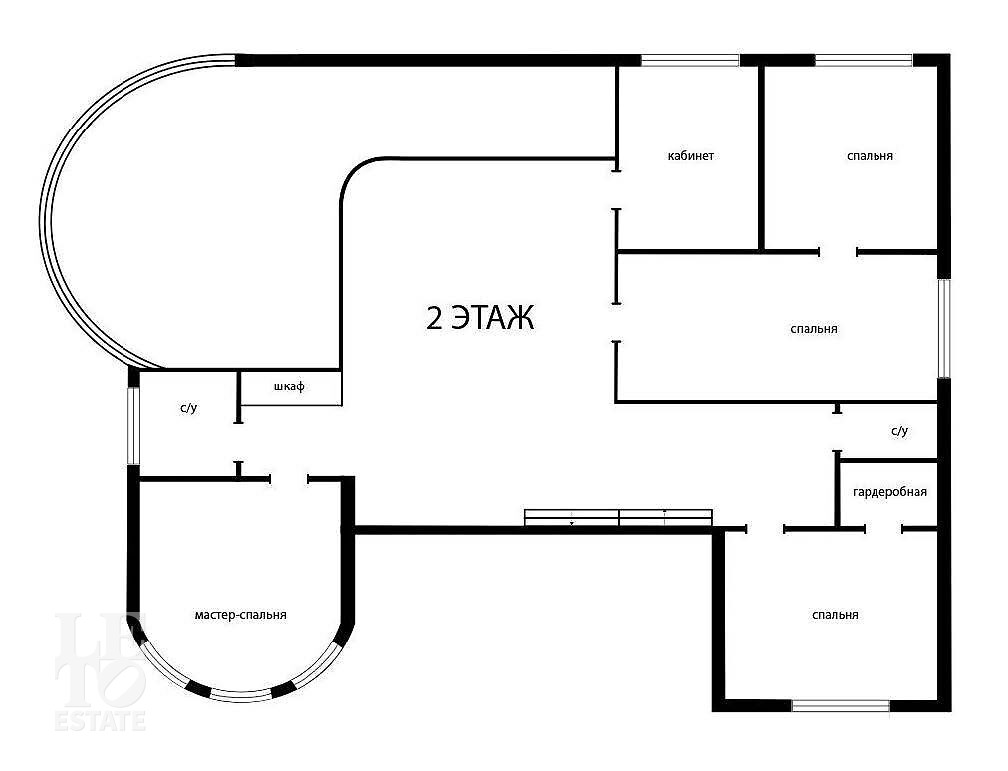 Второй этаж: мастер-спальня с с/у и гардеробной, спальня с гардеробной, 2 спальни, кабинет, с/у.