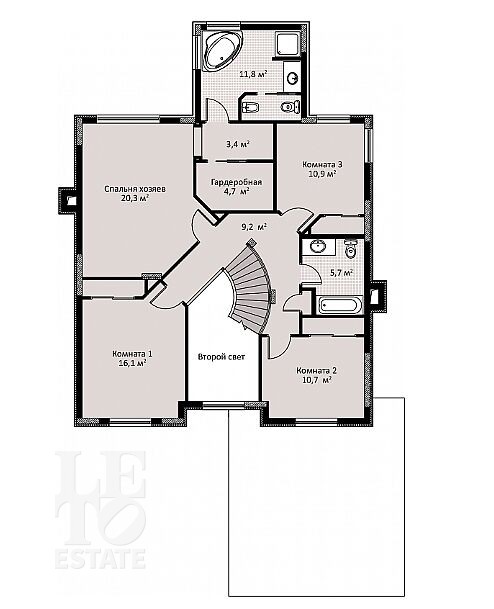 Второй этаж - мастер спальня с гардеробной и с/у, 3 спальни, с/у.