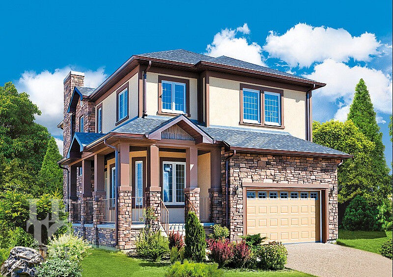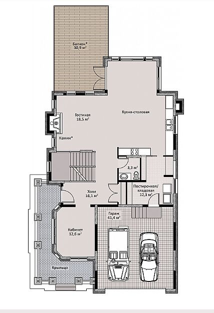 Первый этаж - гараж, холл, гостиная с камином и выходом на балкон, кухня-столовая, с/у, постирочная/кладовая, кабинет.