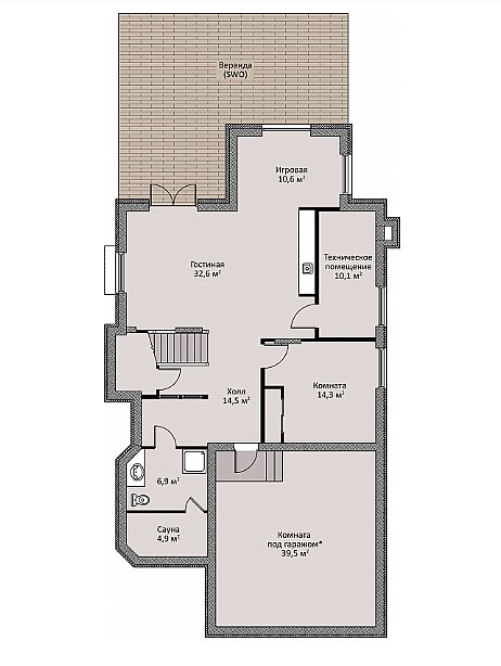 Цокольный этаж- гостиная с выходом на веранду, комната отдыха, техническое помещение, с/у, комната под гаражом, сауна, холл, игровая.