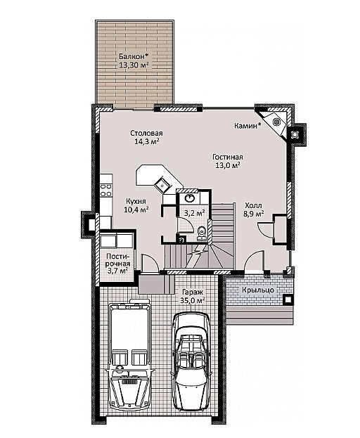 Первый этаж - гараж, холл, гостиная с камином, кухня-столовая с выходом на террасу, с/у, постирочная;