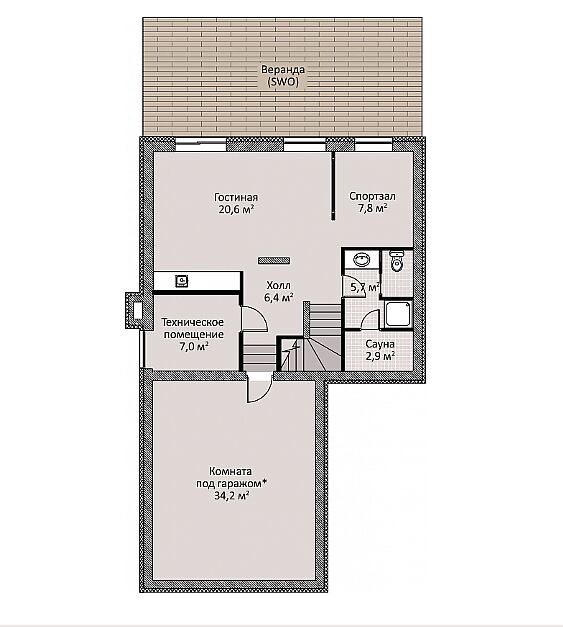 Цокольный этаж- гостиная с выходом на веранду, техническое помещение, с/у, сауна, комната под гаражом;