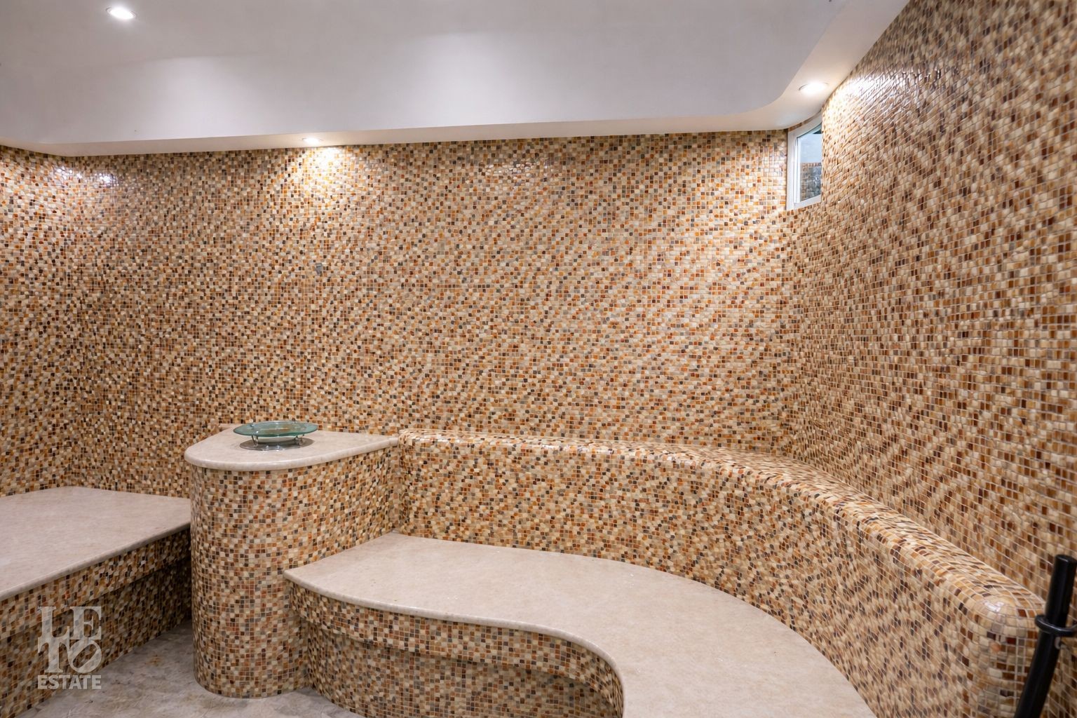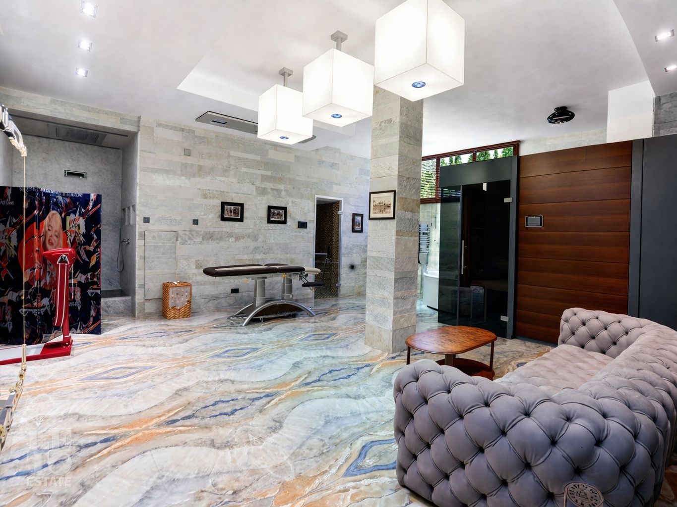 Цокольный этаж: холл, техническое помещение, две кладовые, постирочная, гардеробная, две спальни, санузел, кухня, кинотеатр, спортивный зал, хаммам, душевая, санузел;