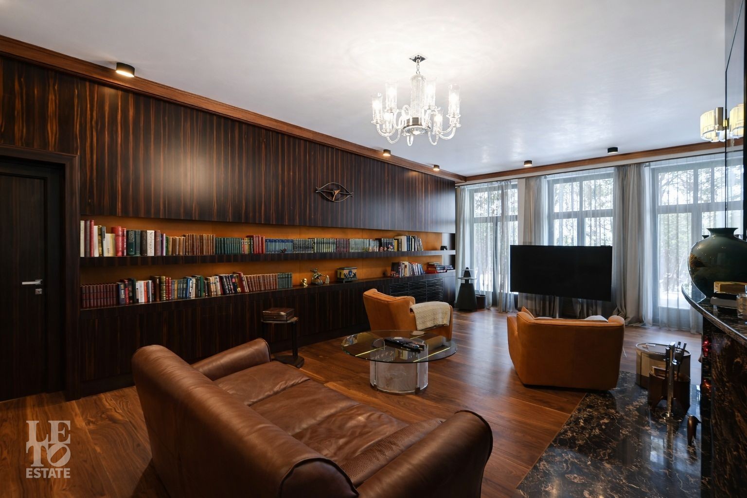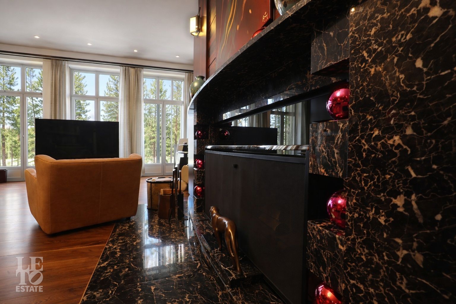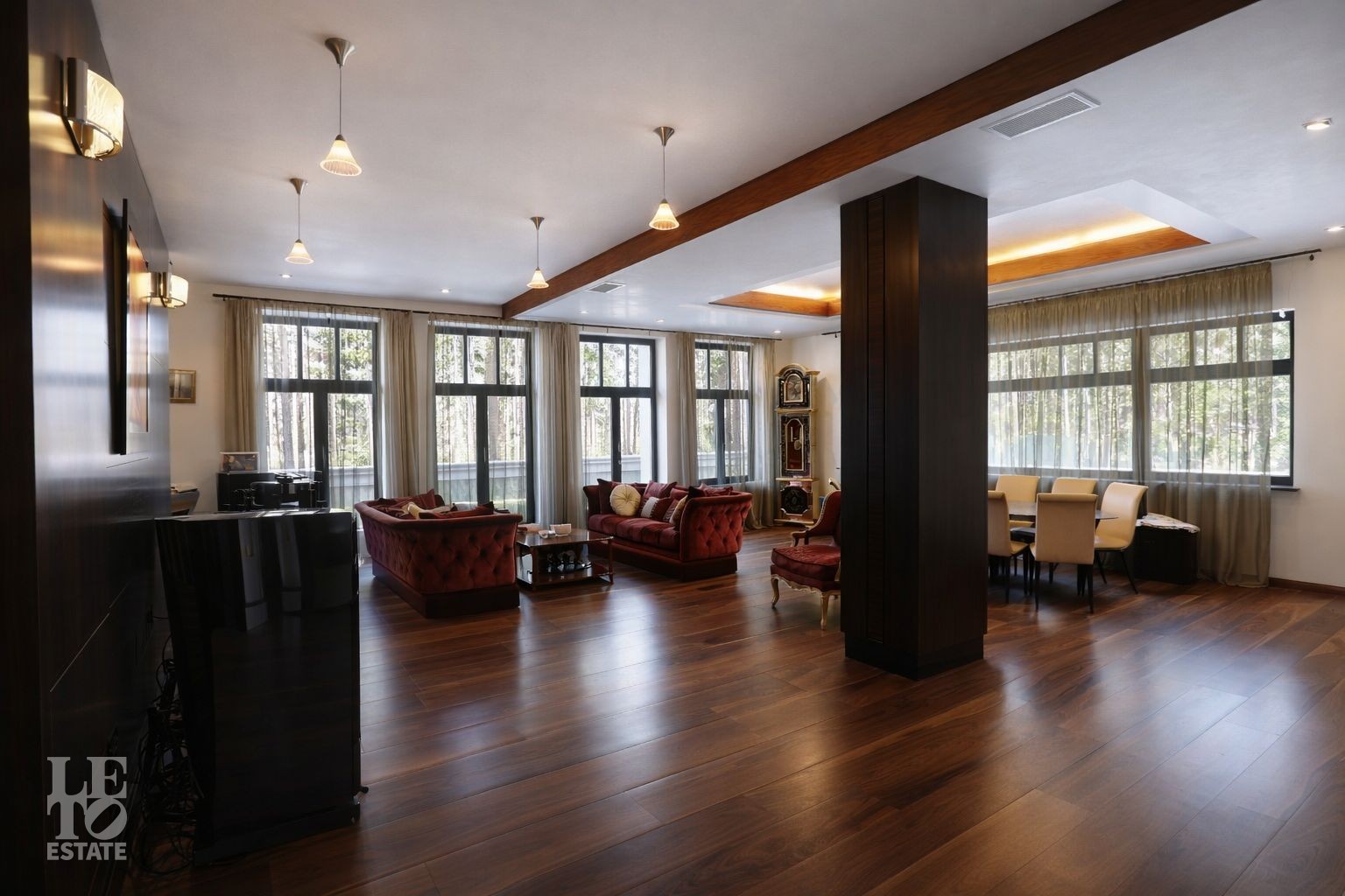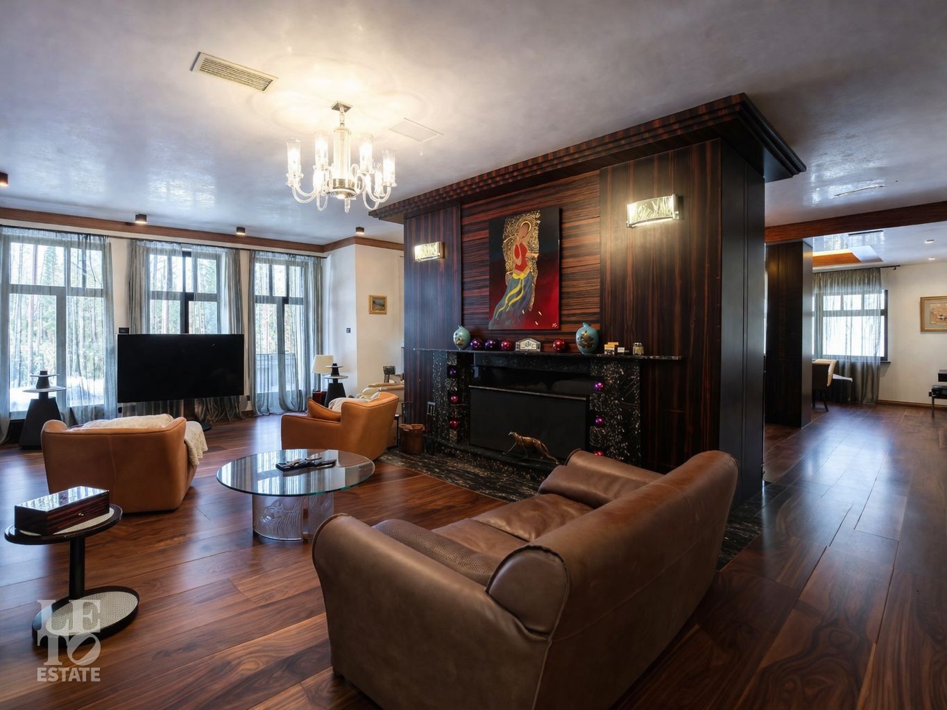 Дом расположен на первой линии Москва-реки. В доме выполнена отделка в современном стиле с использованием теплых оттенков, фактуры камня и дерева. Использованы исключительно европейские дорогостоящие материалы, встроенная и мягкая мебель от ведущих мировых производителей. В доме все центральные коммуникации: газоснабжение, электричество, водопровод, канализация.