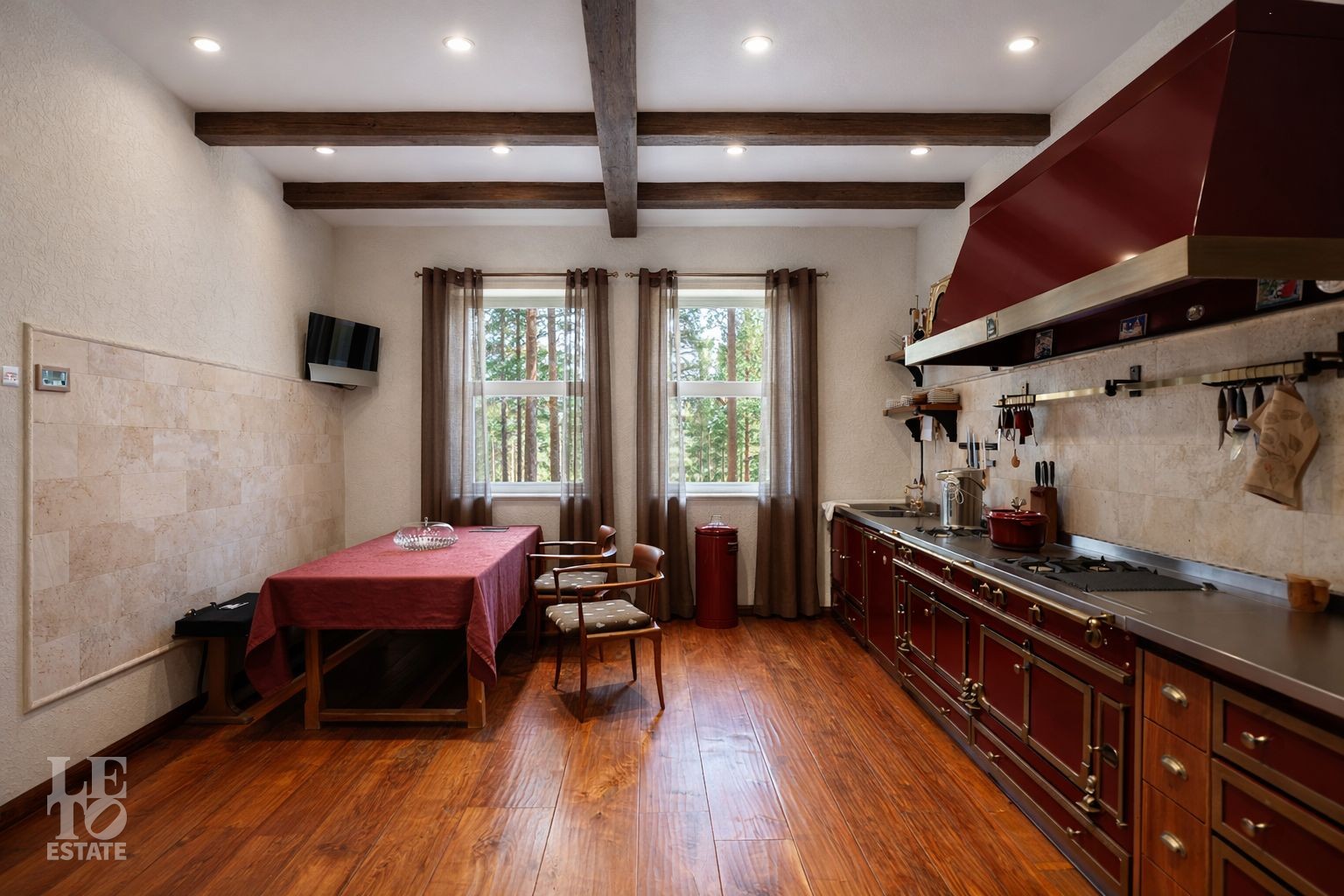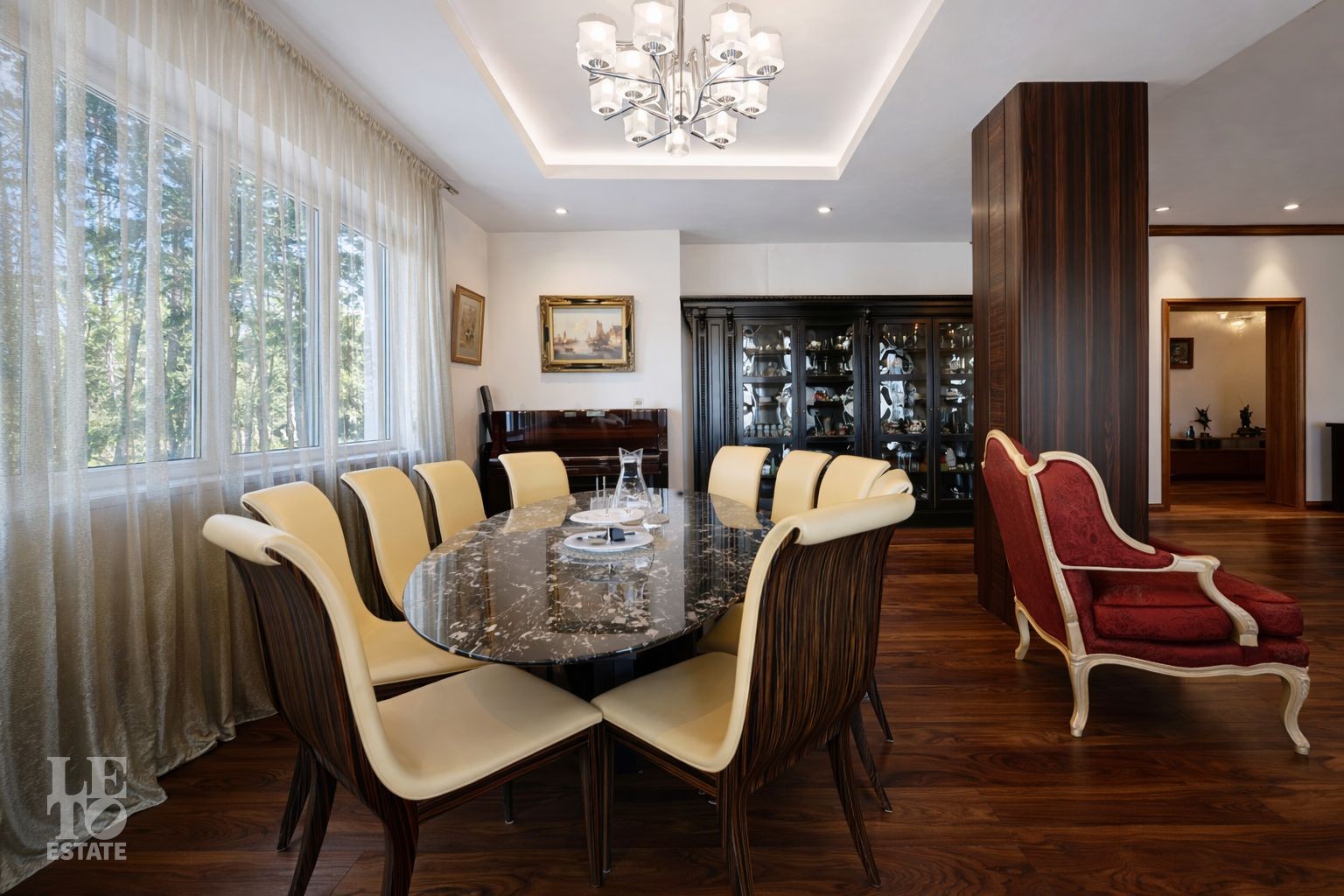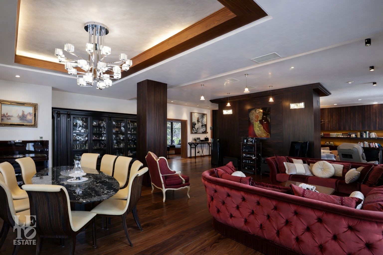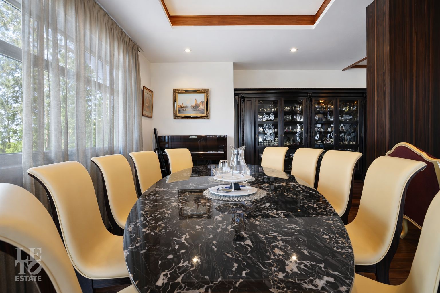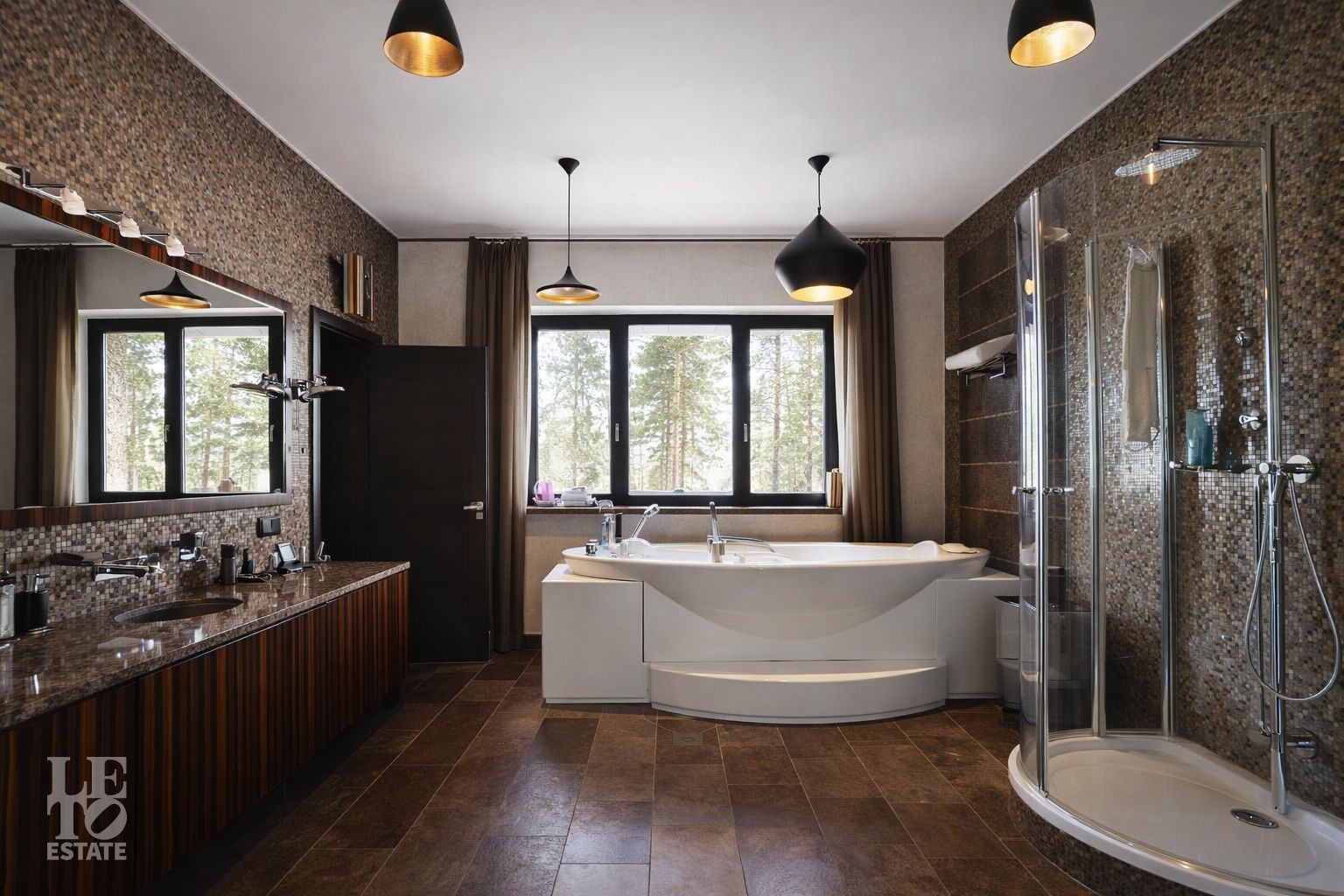 Дом расположен на первой линии Москва-реки. В доме выполнена отделка в современном стиле с использованием теплых оттенков, фактуры камня и дерева. Использованы исключительно европейские дорогостоящие материалы, встроенная и мягкая мебель от ведущих мировых производителей. В доме все центральные коммуникации: газоснабжение, электричество, водопровод, канализация.