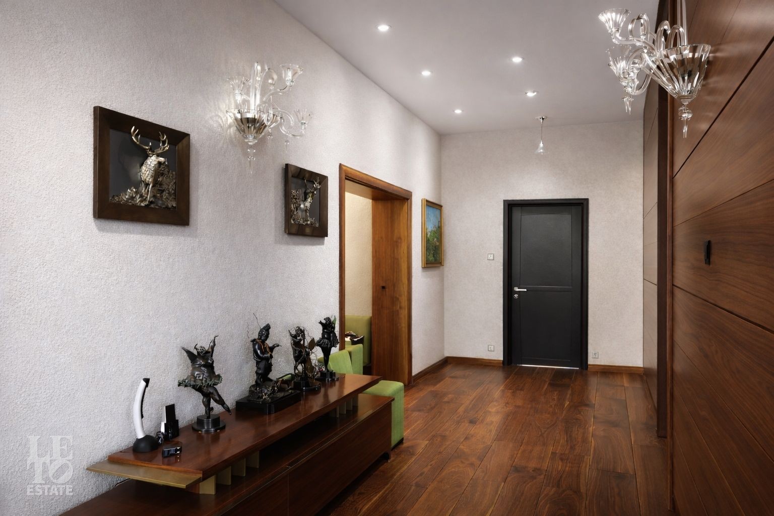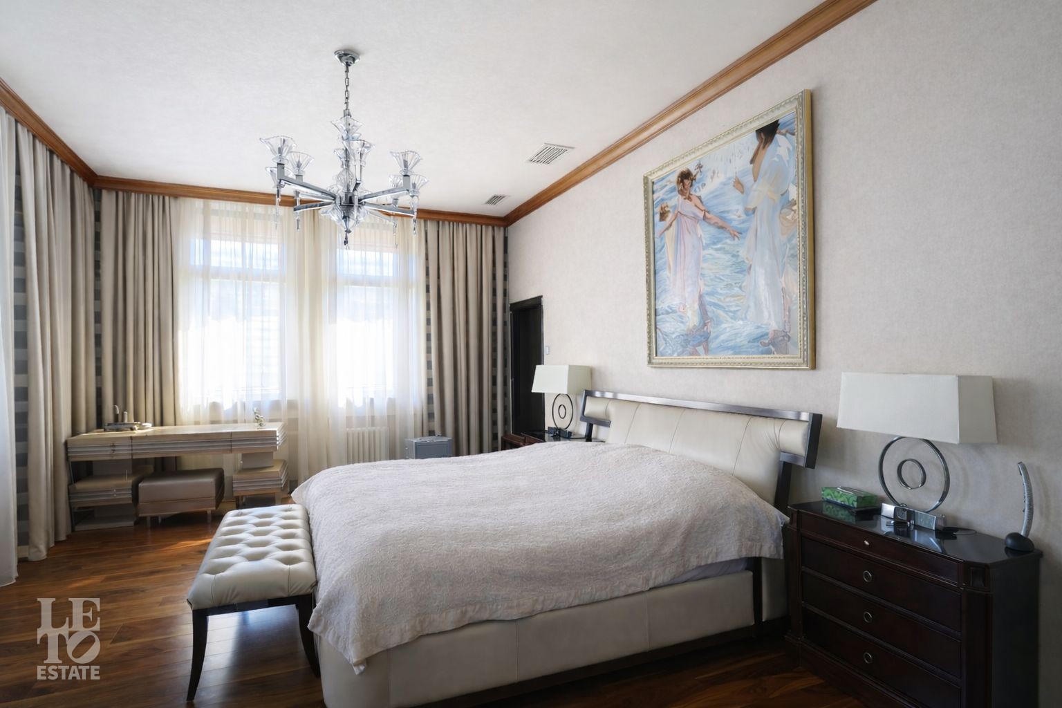 Второй этаж: холл, две спальни, каждая со своей гардеробной и ванной комнатами, спальня с ванной комнатой.