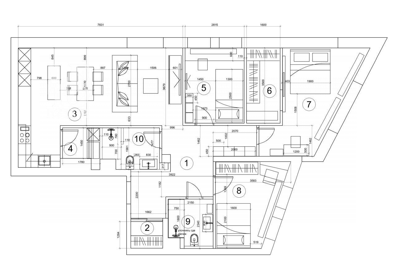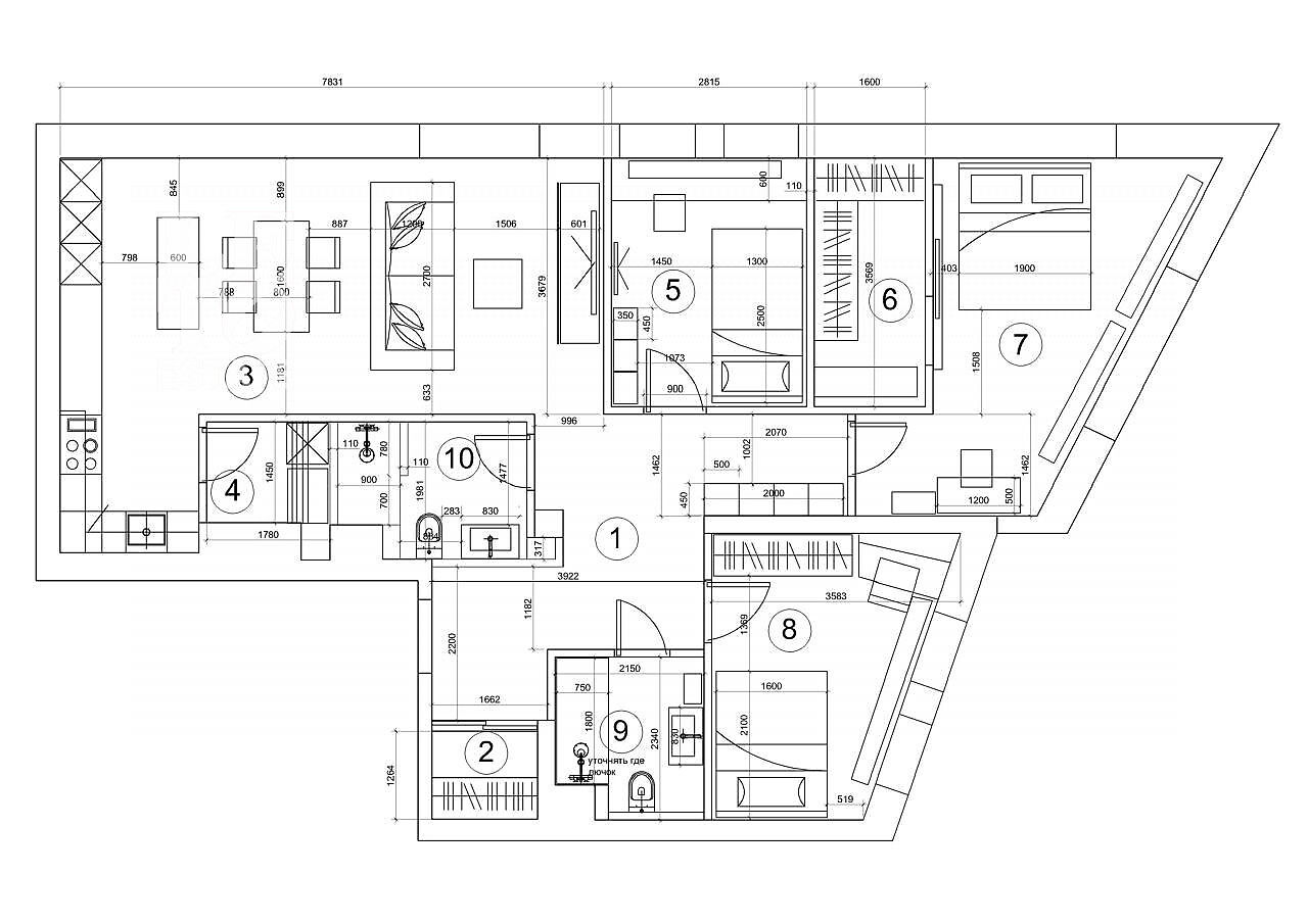 Планировка квартиры: входной холл, гардеробная, совмещенный санузел, просторная кухня-столовая-гостиная, кладовая хозяйственная комната из кухни, совмещенный санузел, детская спальня, мастер спальня с собственной гардеробной и панорамными окнами, гостевая спальня с панорамными окнами.