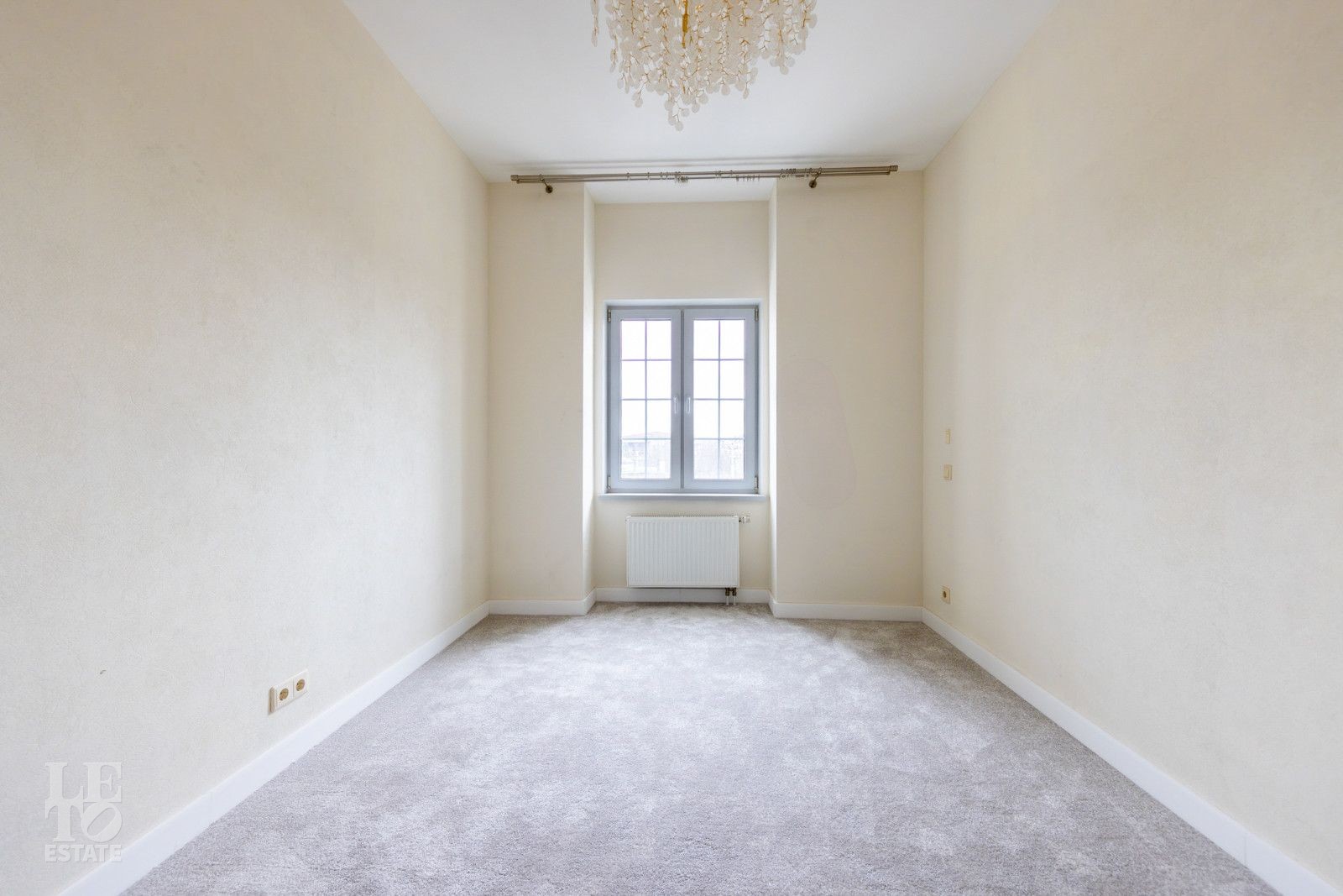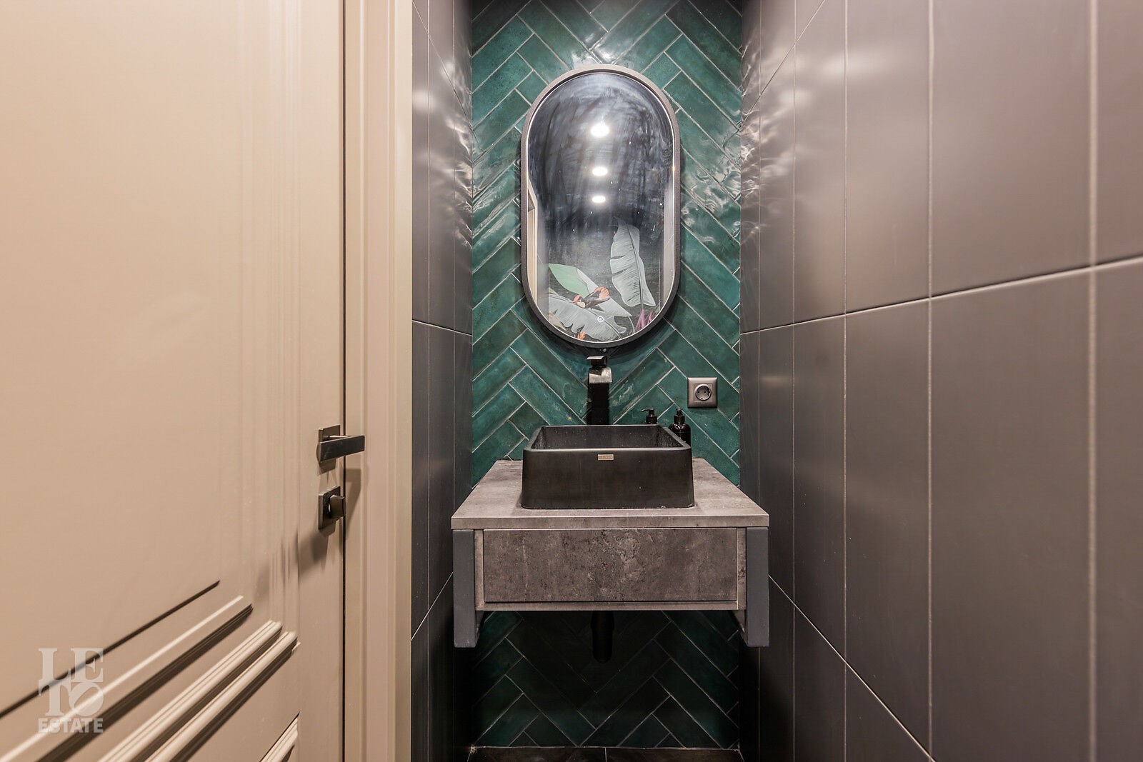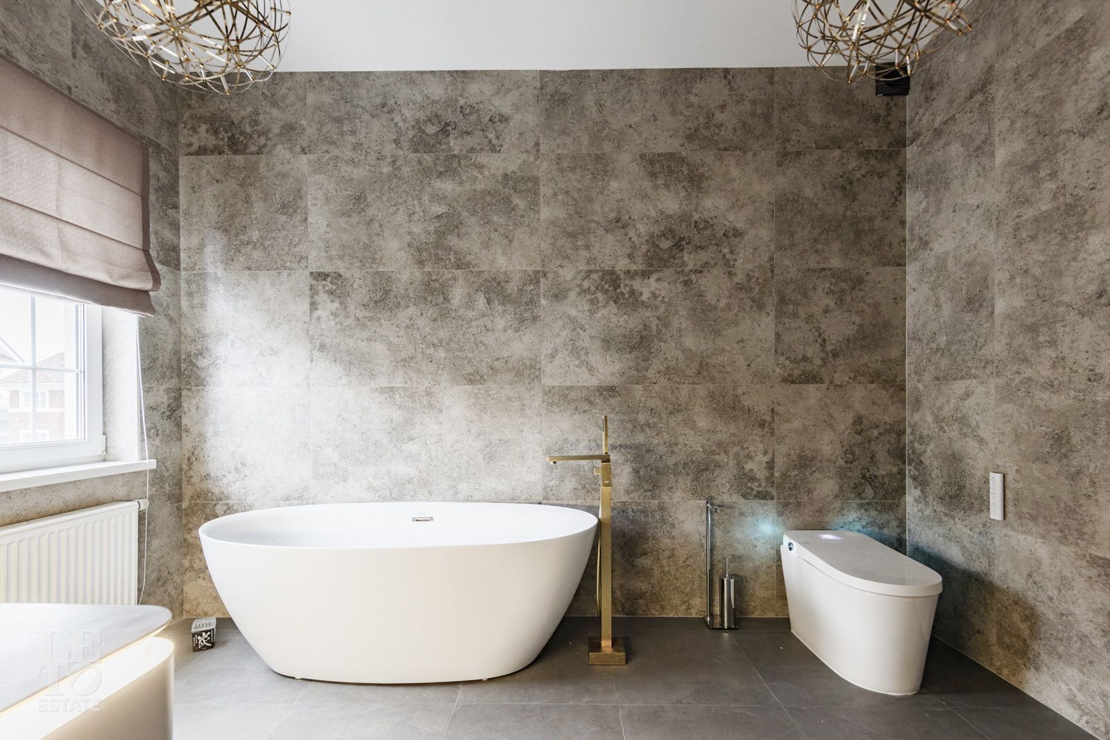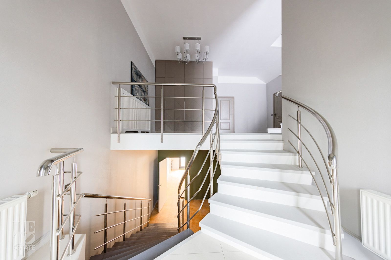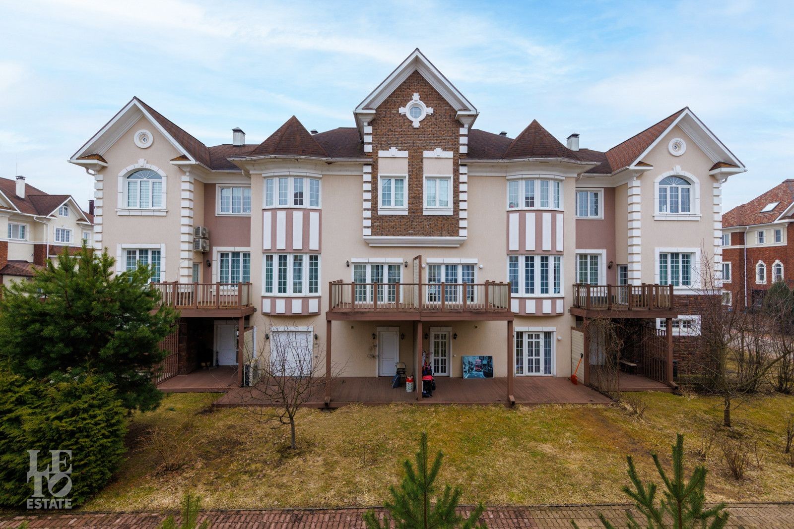 Таунхаус трехэтажный, построен в английском стиле. Во входной группе организовано высокое крыльцо с кованым ограждением. Тамбур на входе в таунхаус остеклен. Есть гараж на два машиноместа и две террасы, одна из которых закрытая. Во всех санузлах организована система теплого пола. На полу на третьем этаже постелен ковролин. Таунхаус расположен рядом с парком.