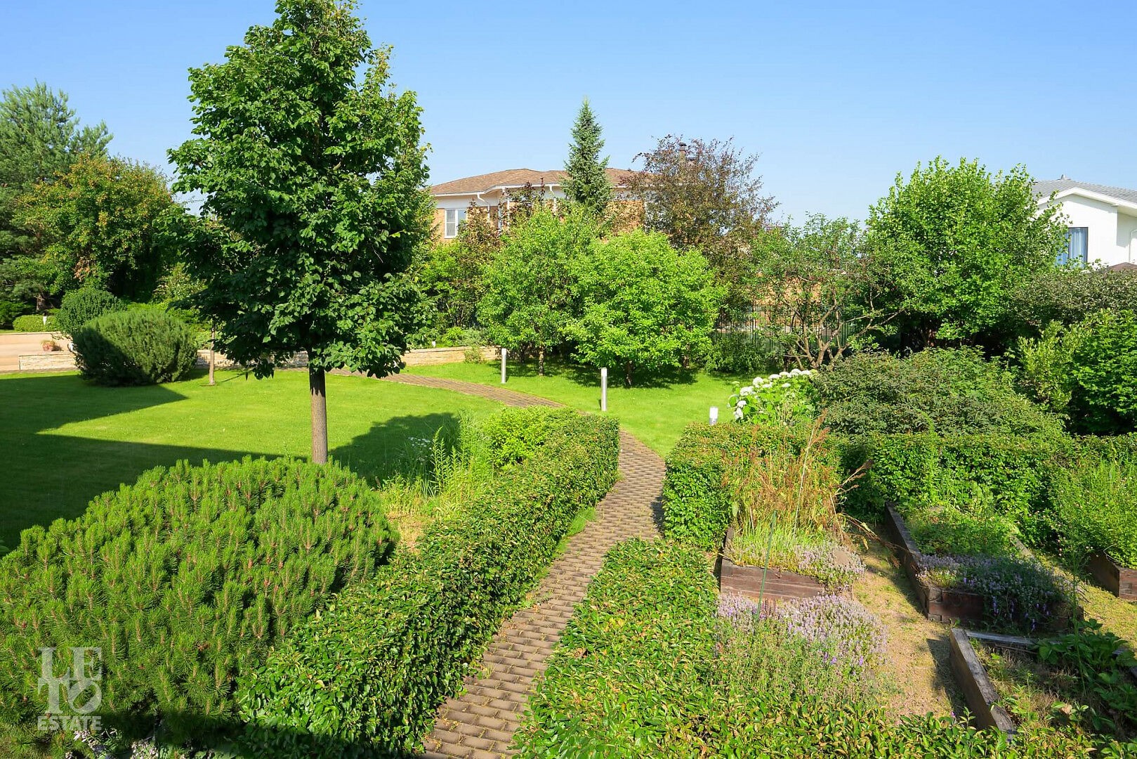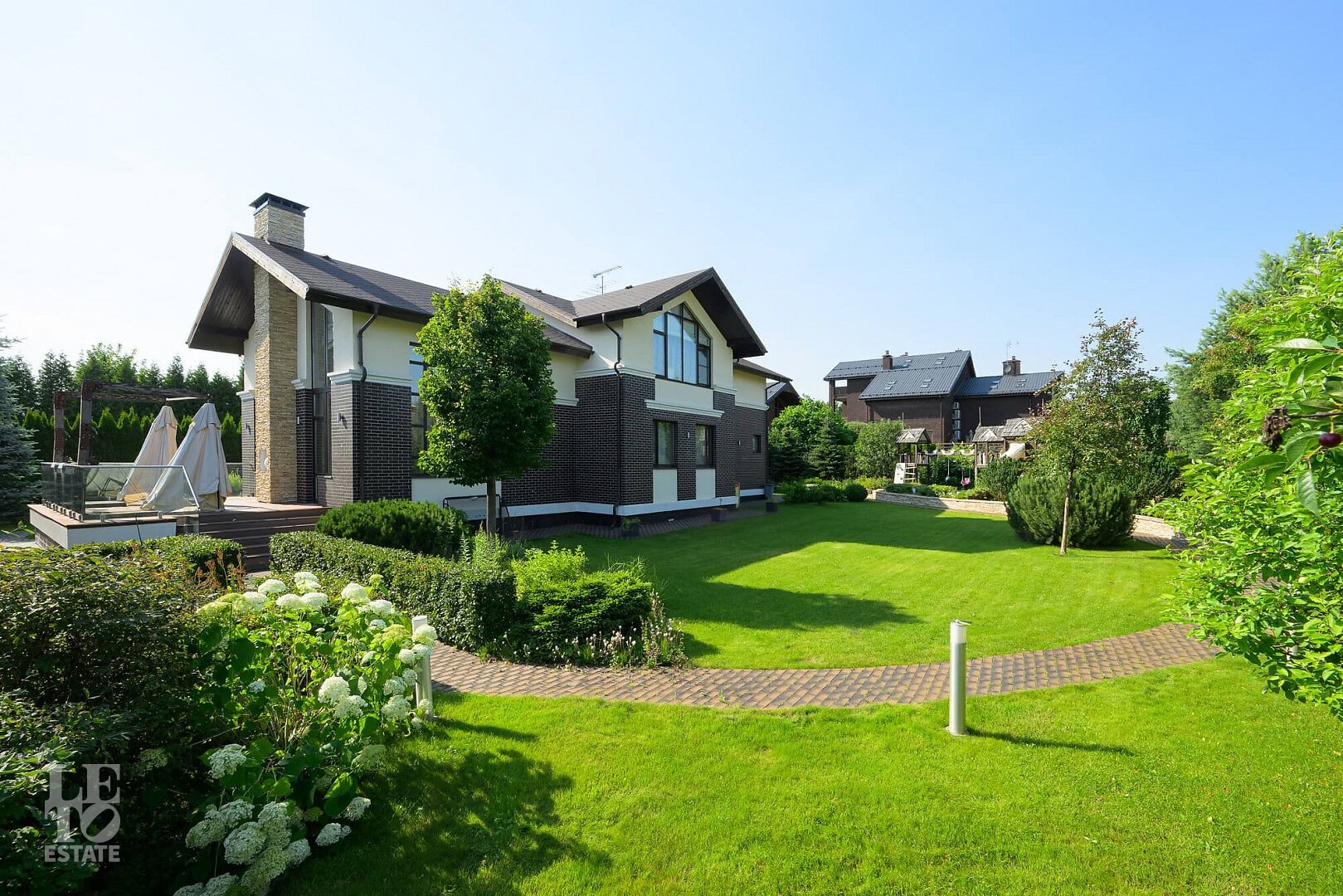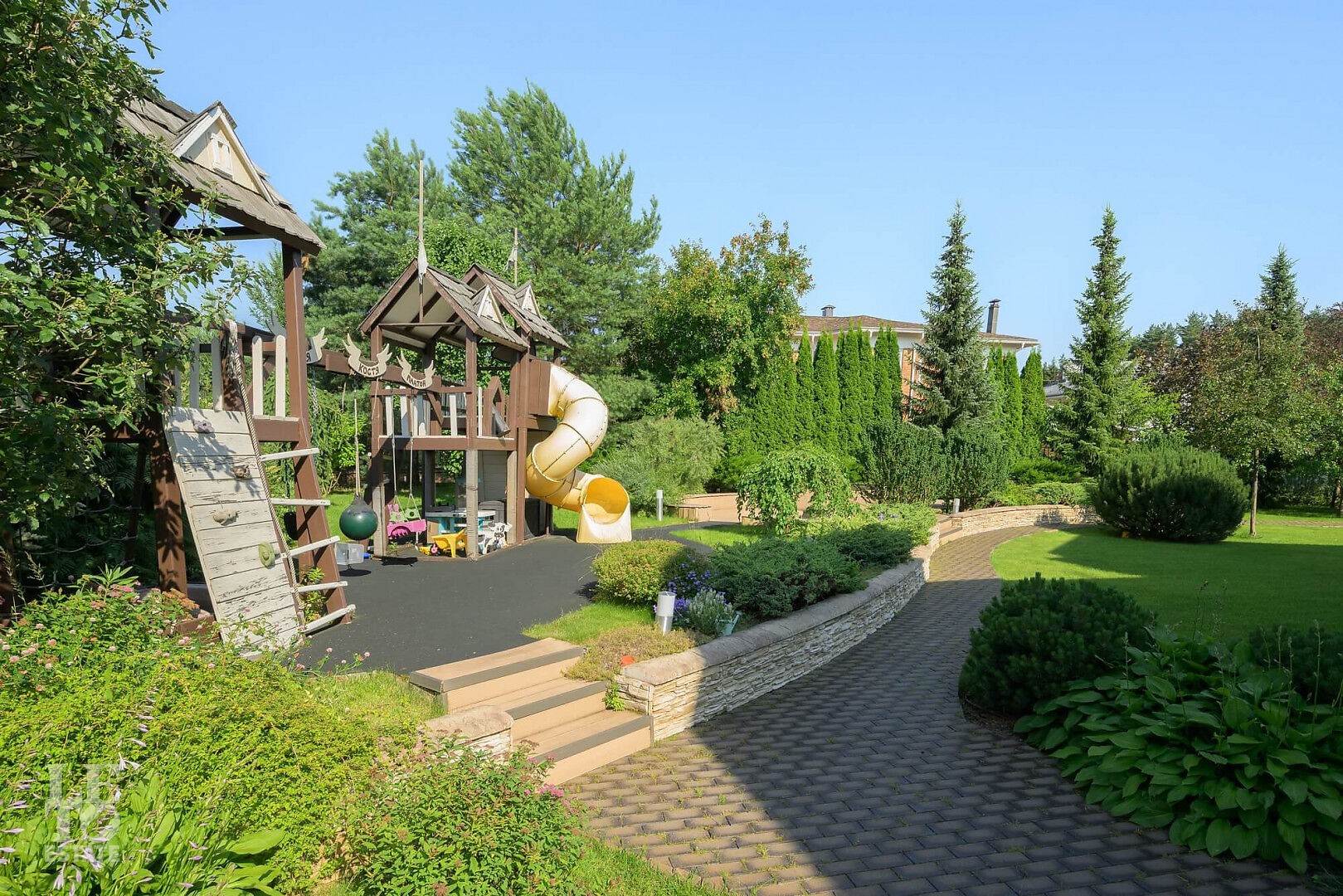 На участке выполнен профессиональный ландшафтный дизайн участка. Высажены цветы, туи, сосны и декоративные кустарники. Постелен газон, проложены дорожки, выполнено освещение. Для детей оборудована площадка. Организована лаунж-зона с декоративным водоемом.