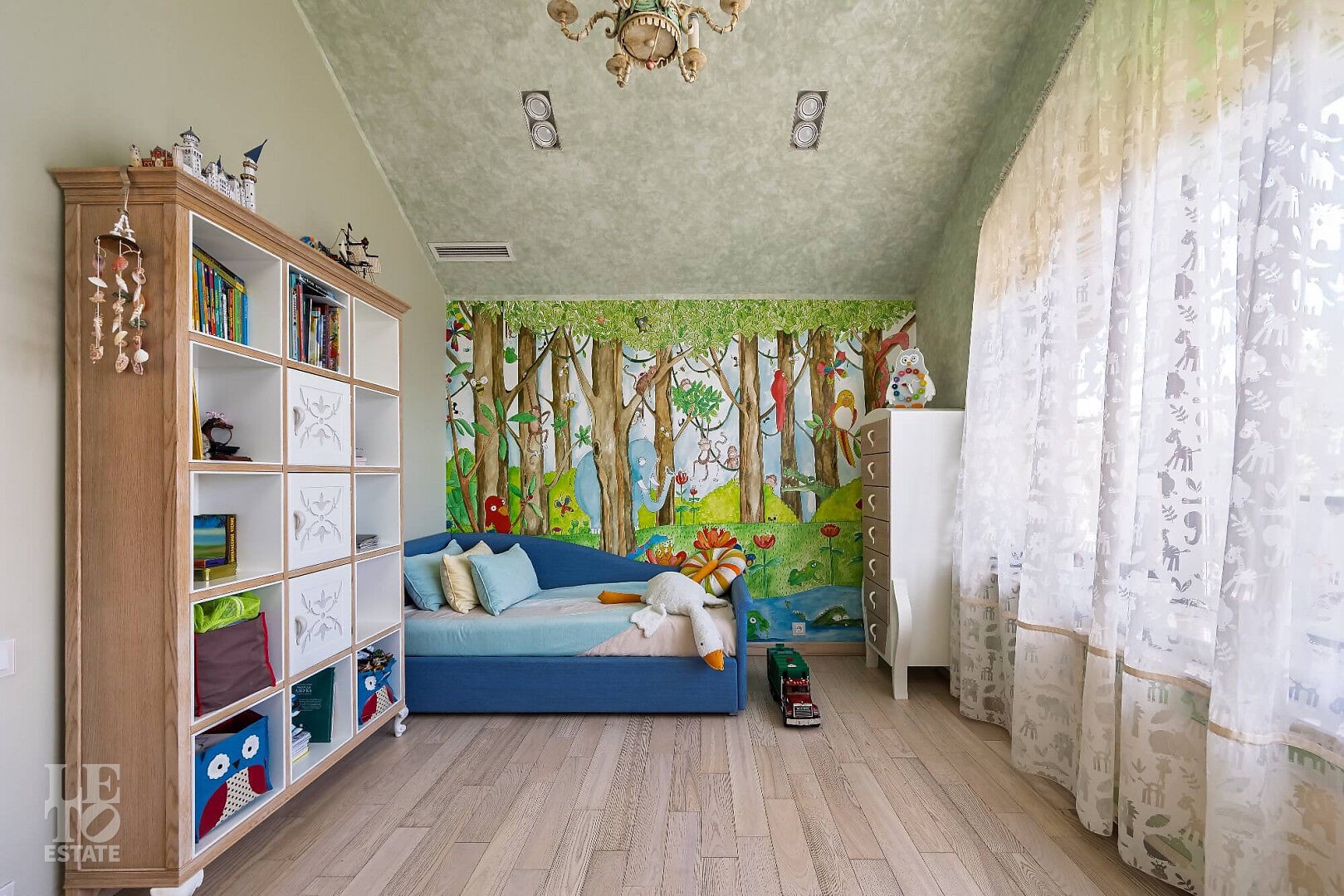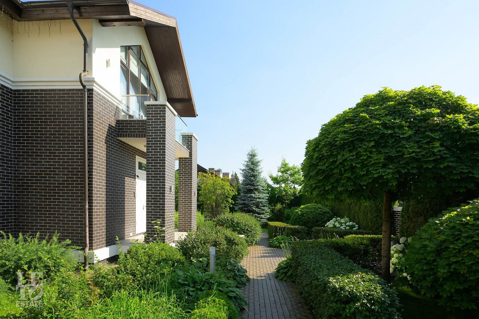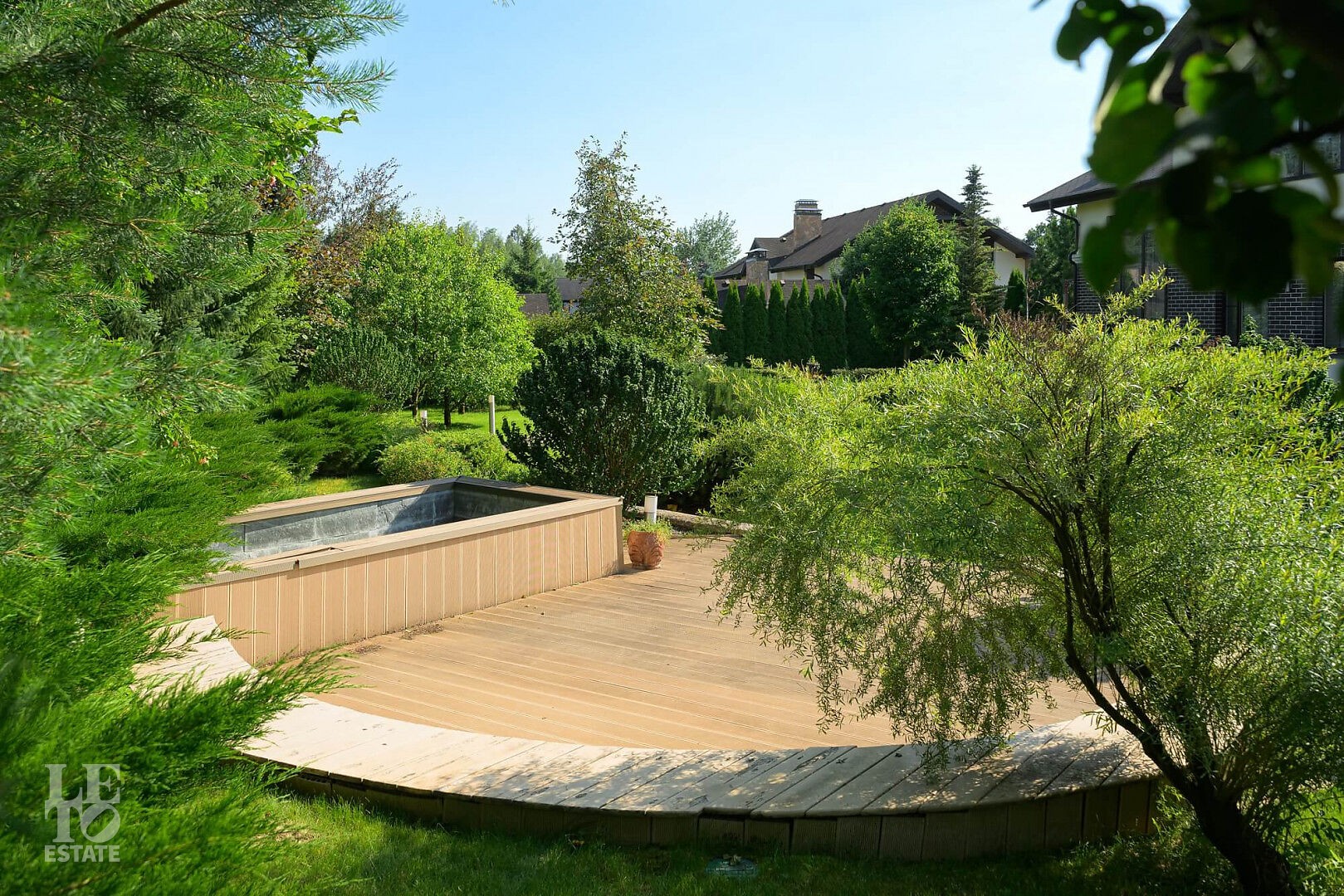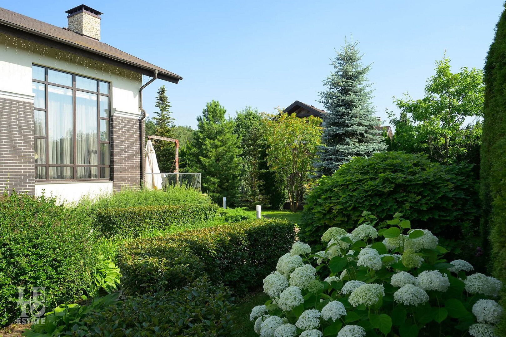 На участке выполнен профессиональный ландшафтный дизайн участка. Высажены цветы, туи, сосны и декоративные кустарники. Постелен газон, проложены дорожки, выполнено освещение. Для детей оборудована площадка. Организована лаунж-зона с декоративным водоемом.